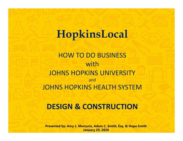 are eligible. • Most organizations have some form of MBE/WBE program which usually, if not always, requires some form of certification to be counted towards the project goal. Get to know the pre-approved contractors. • Most of the work we buy is subcontracted out by the prime, so getting to know the pre-approved contractors is a very good first step to being involved with a project. BUILD | HopkinsLocal | slide 17