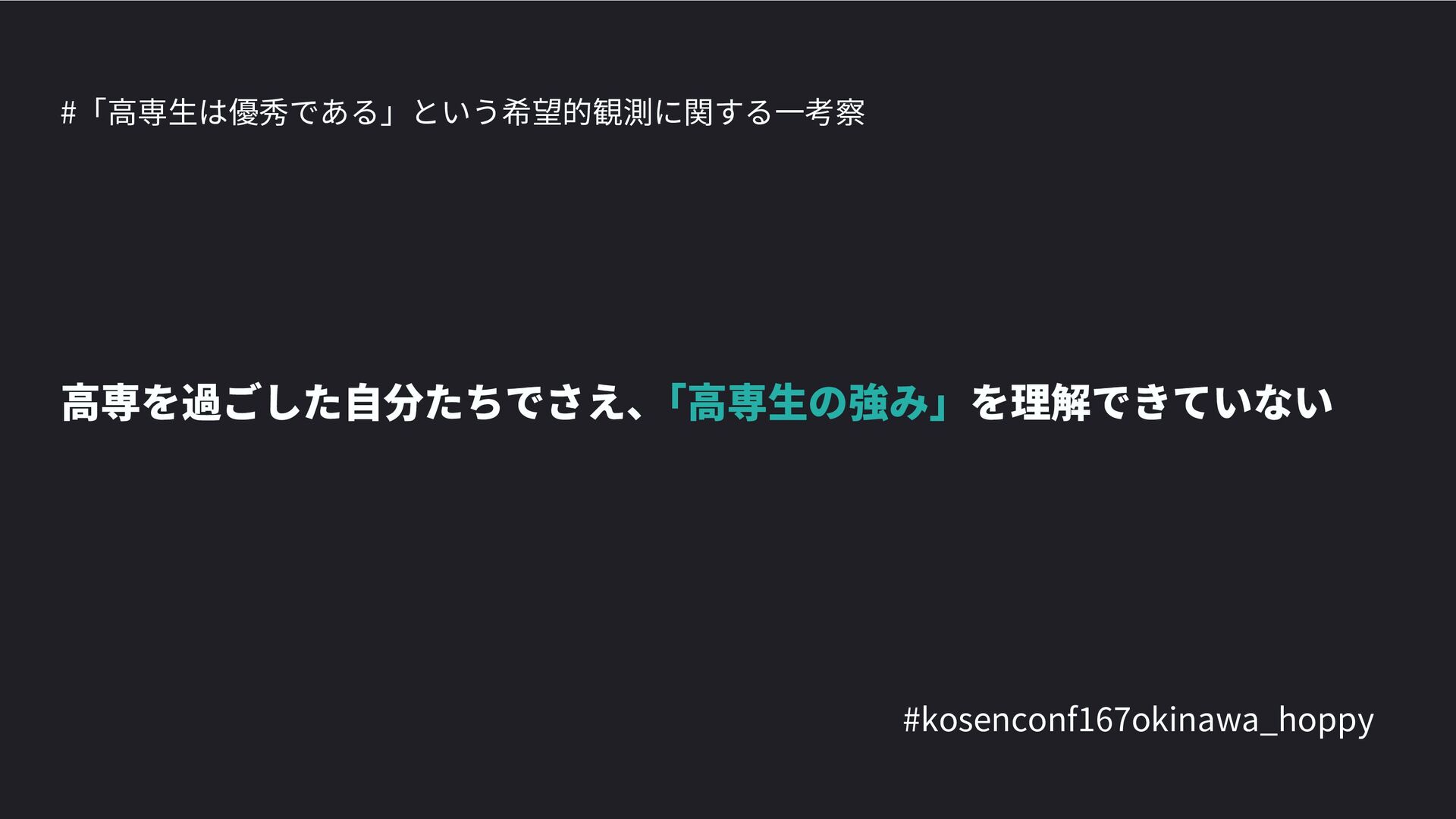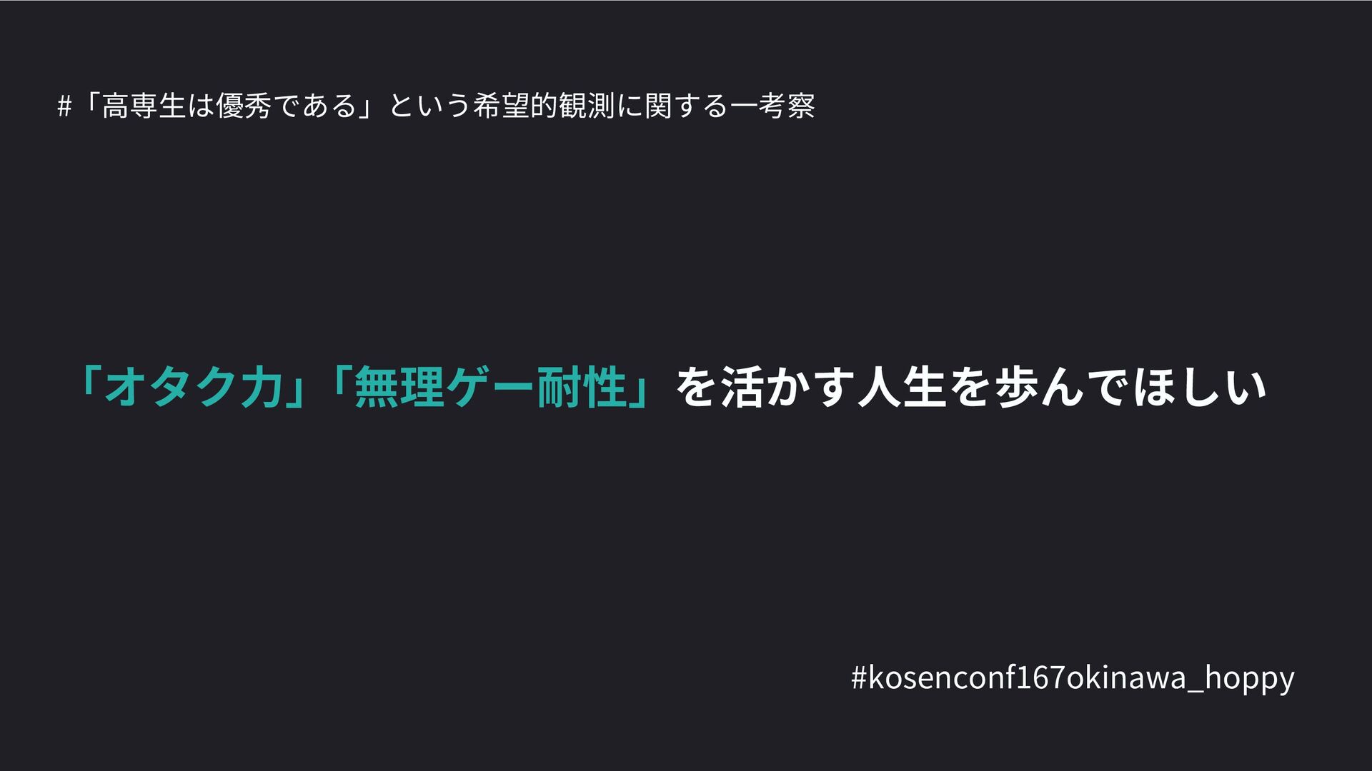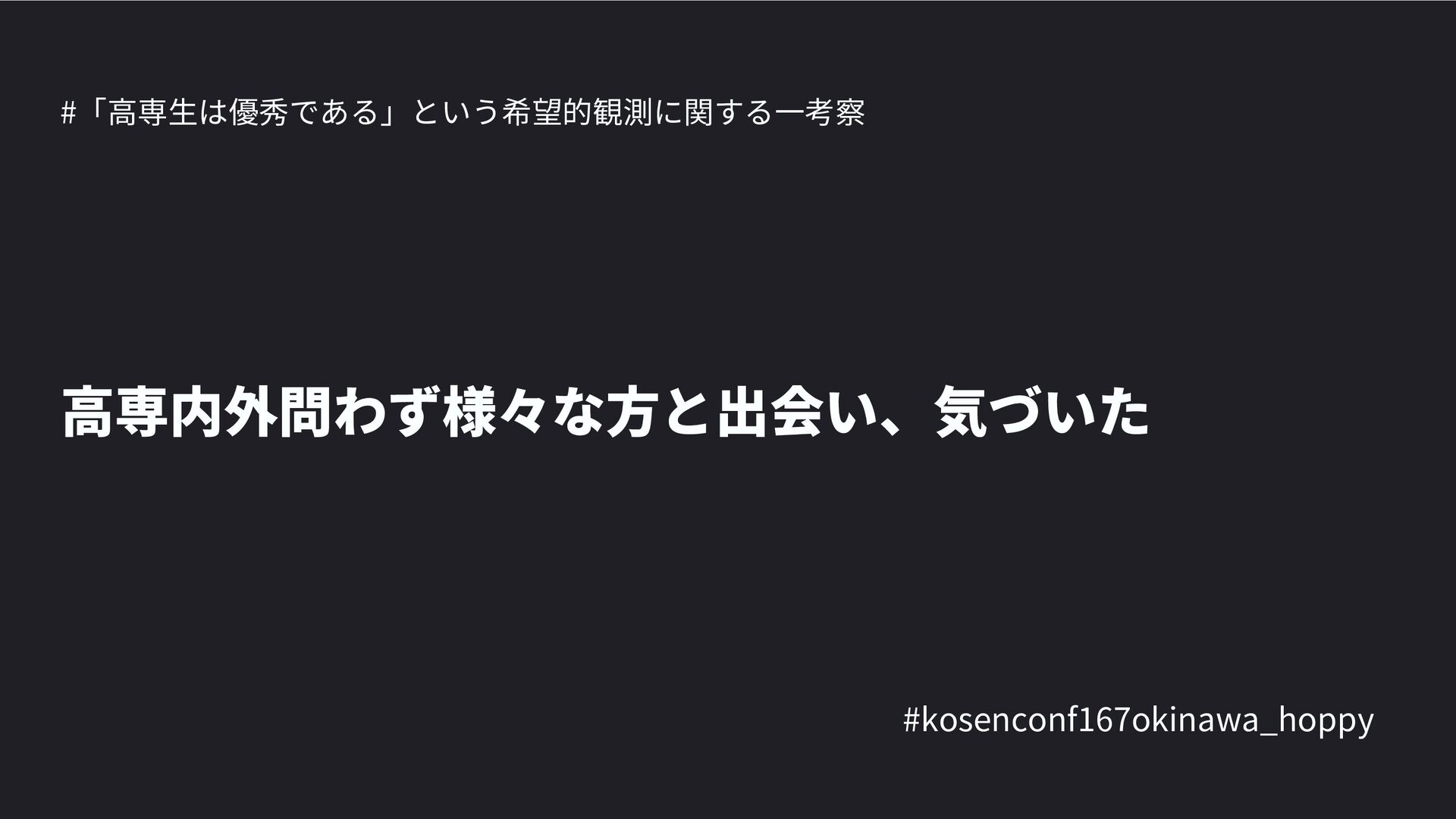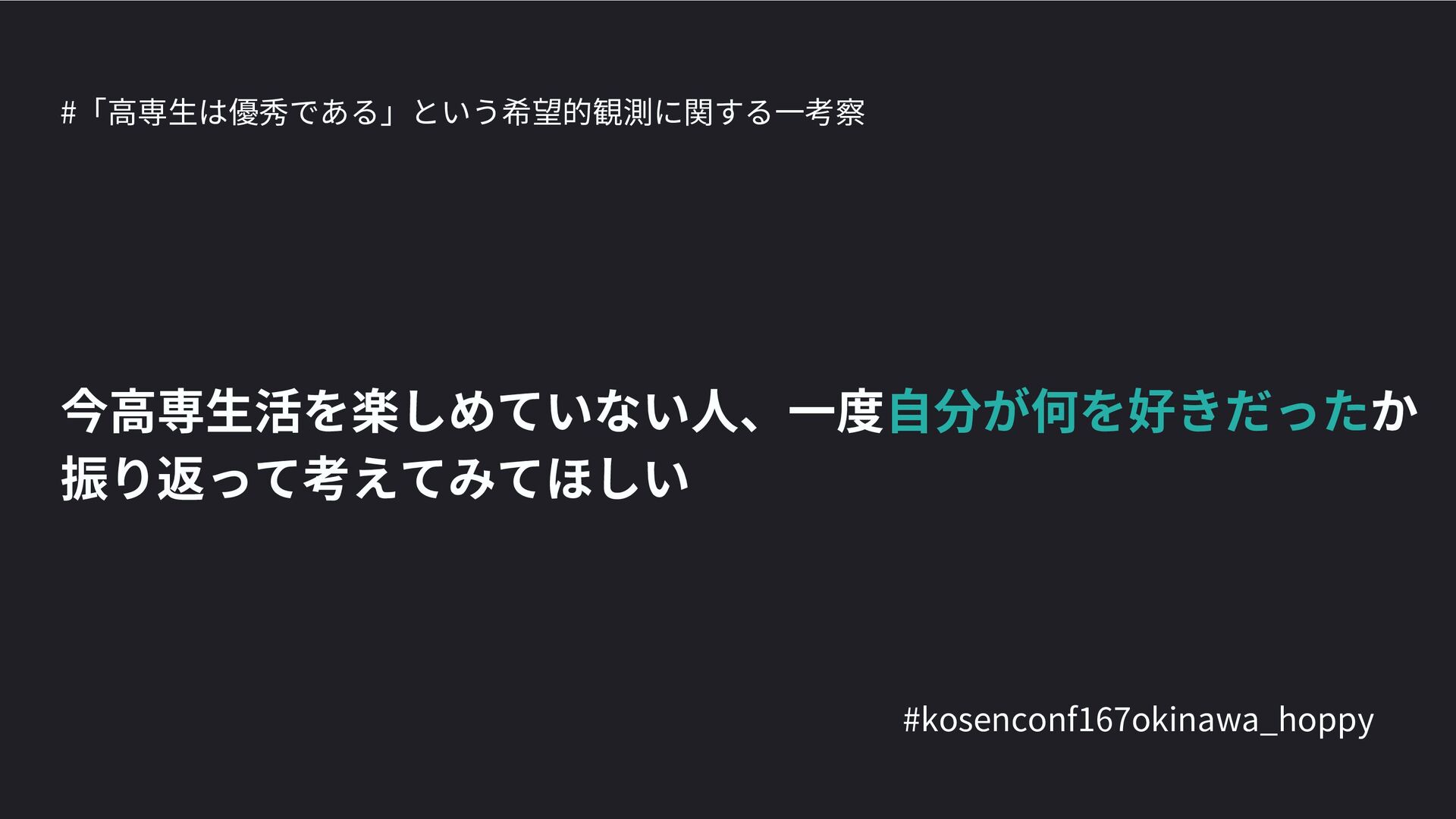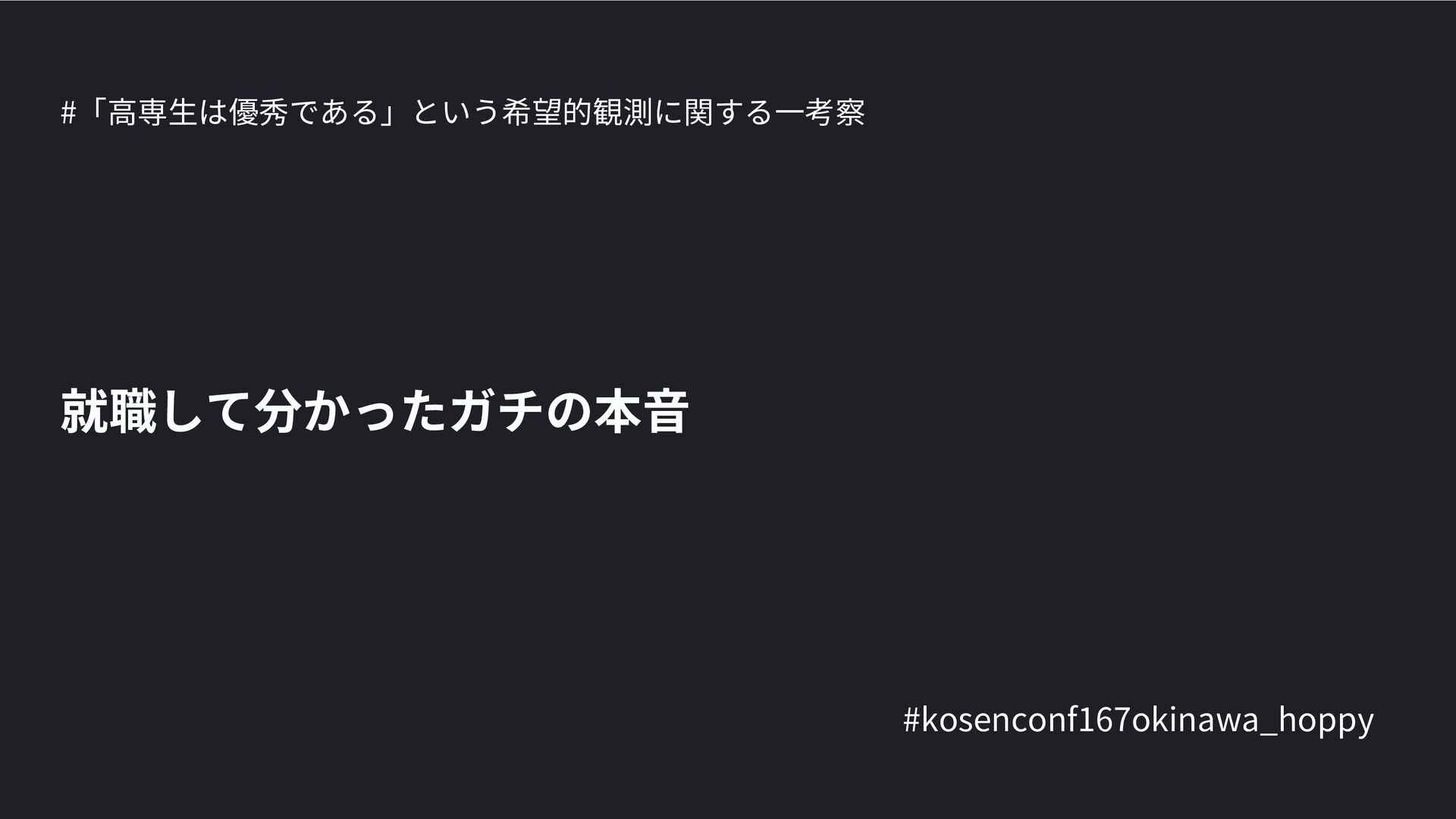 高専カンファレンス167in沖縄2024 にて登壇した際の資料です。 テーマ 高専人(こうせんちゅ)ぬ宝 ~南の島で郷土愛を叫ぶ~ https://connpass.com/event/317340/