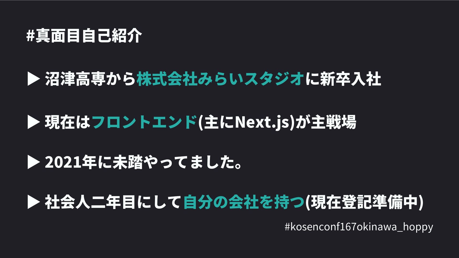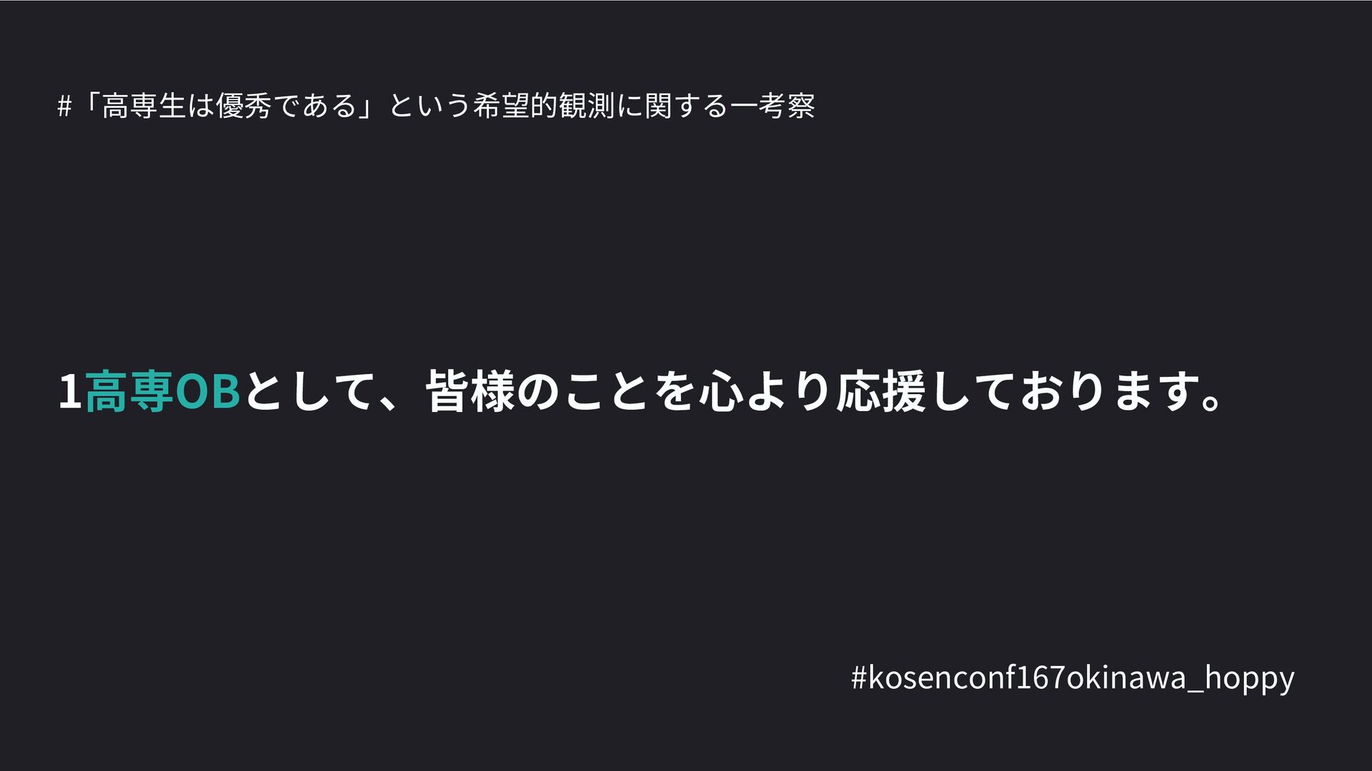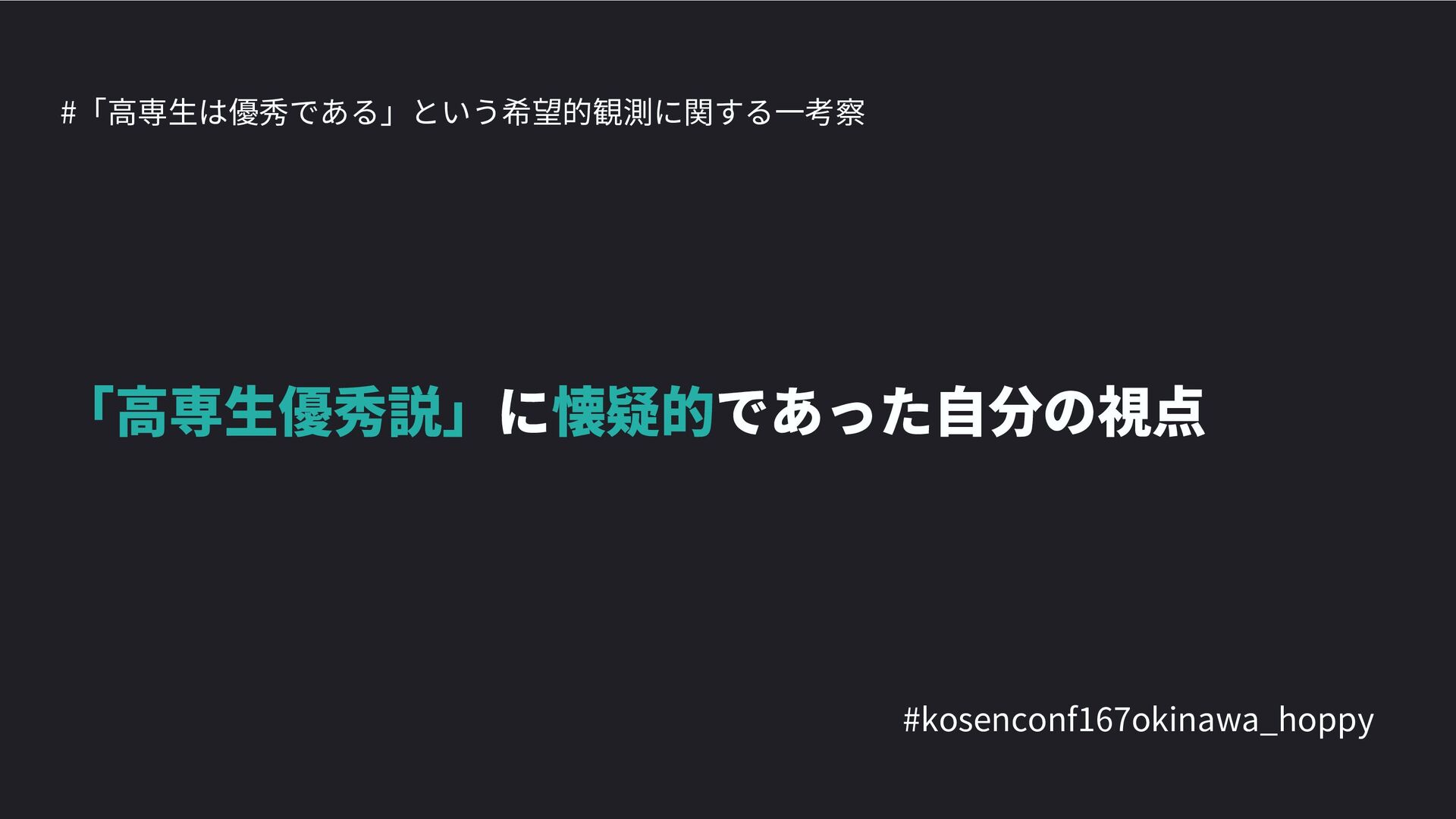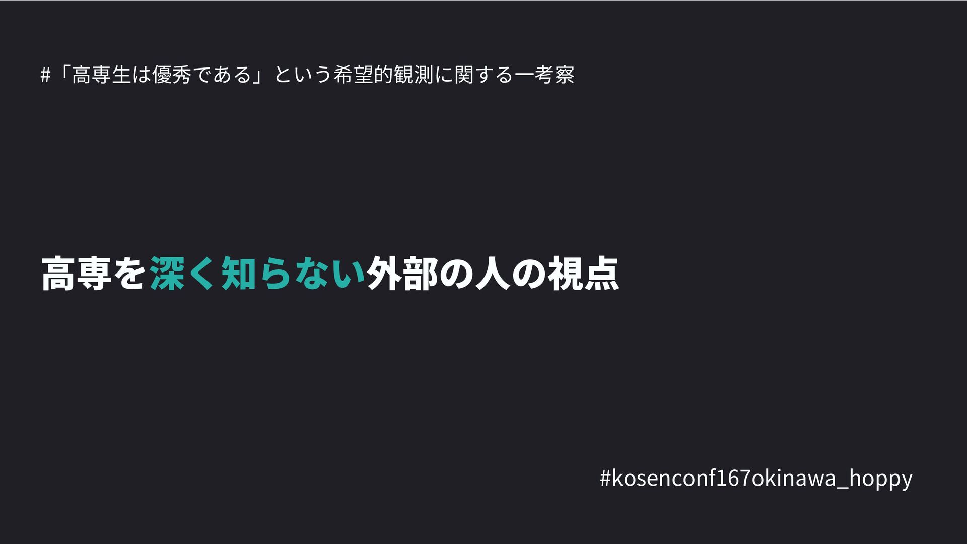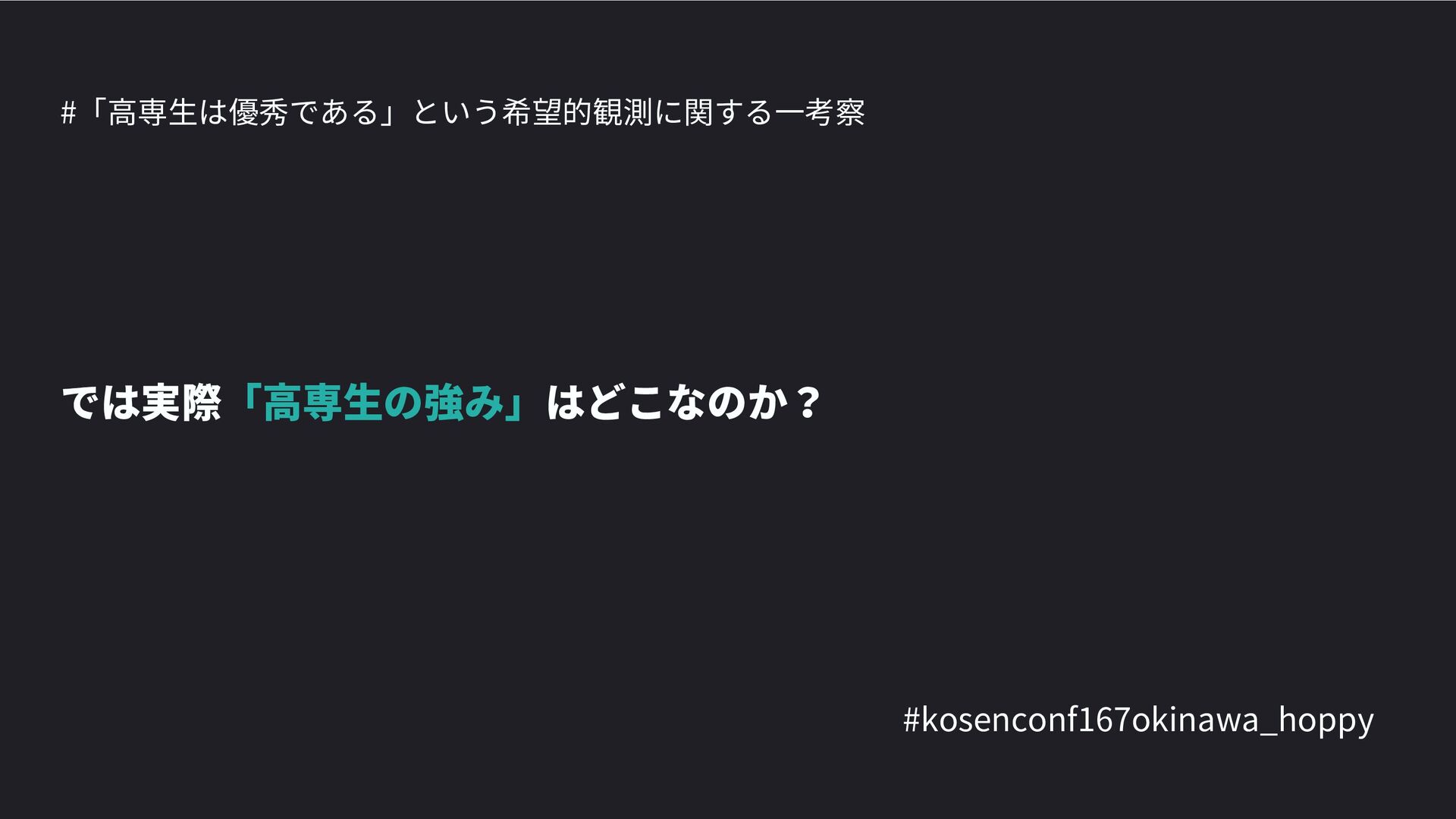 高専カンファレンス167in沖縄2024 にて登壇した際の資料です。 テーマ 高専人(こうせんちゅ)ぬ宝 ~南の島で郷土愛を叫ぶ~ https://connpass.com/event/317340/