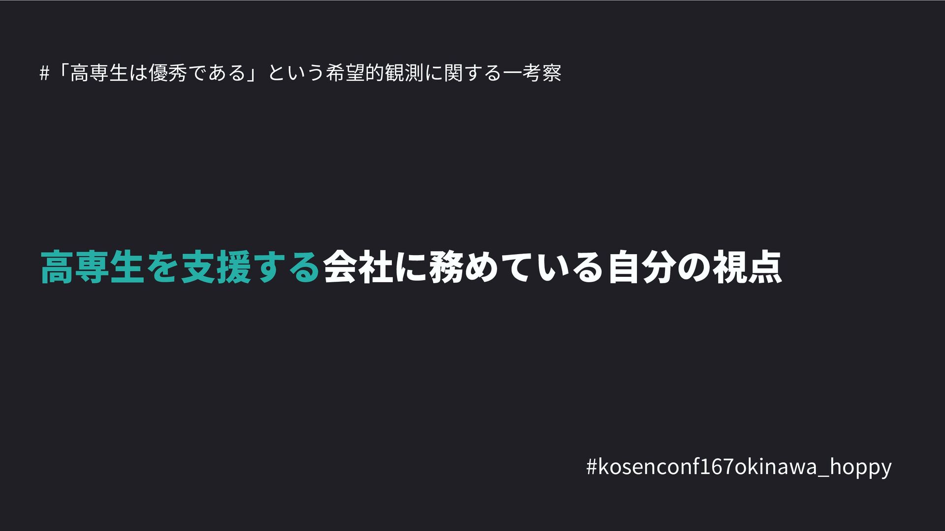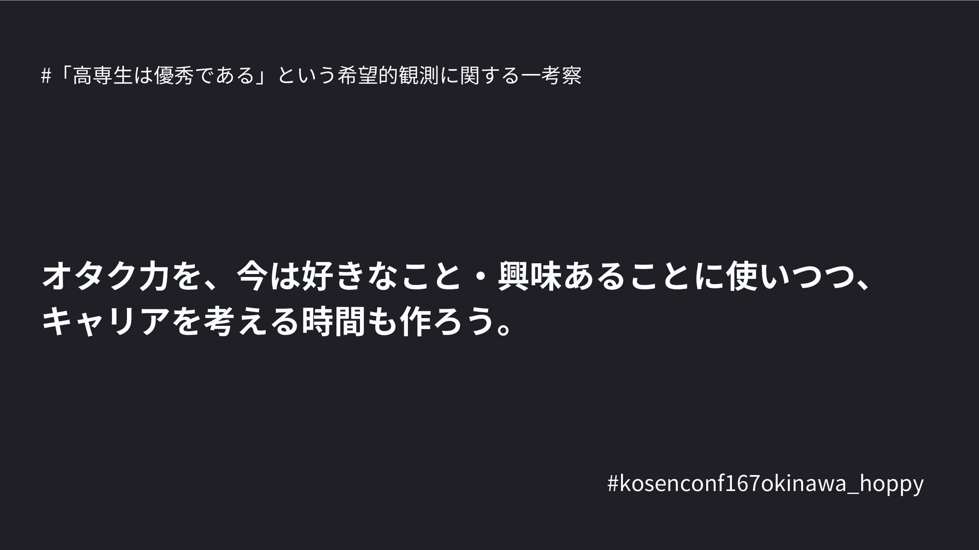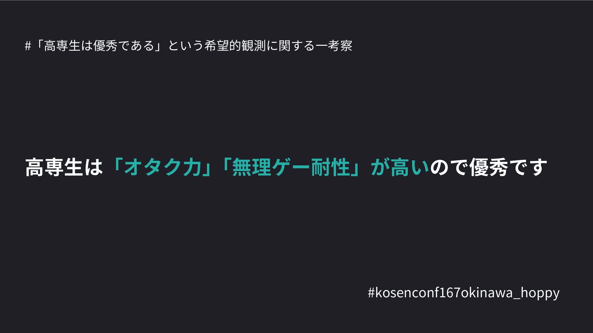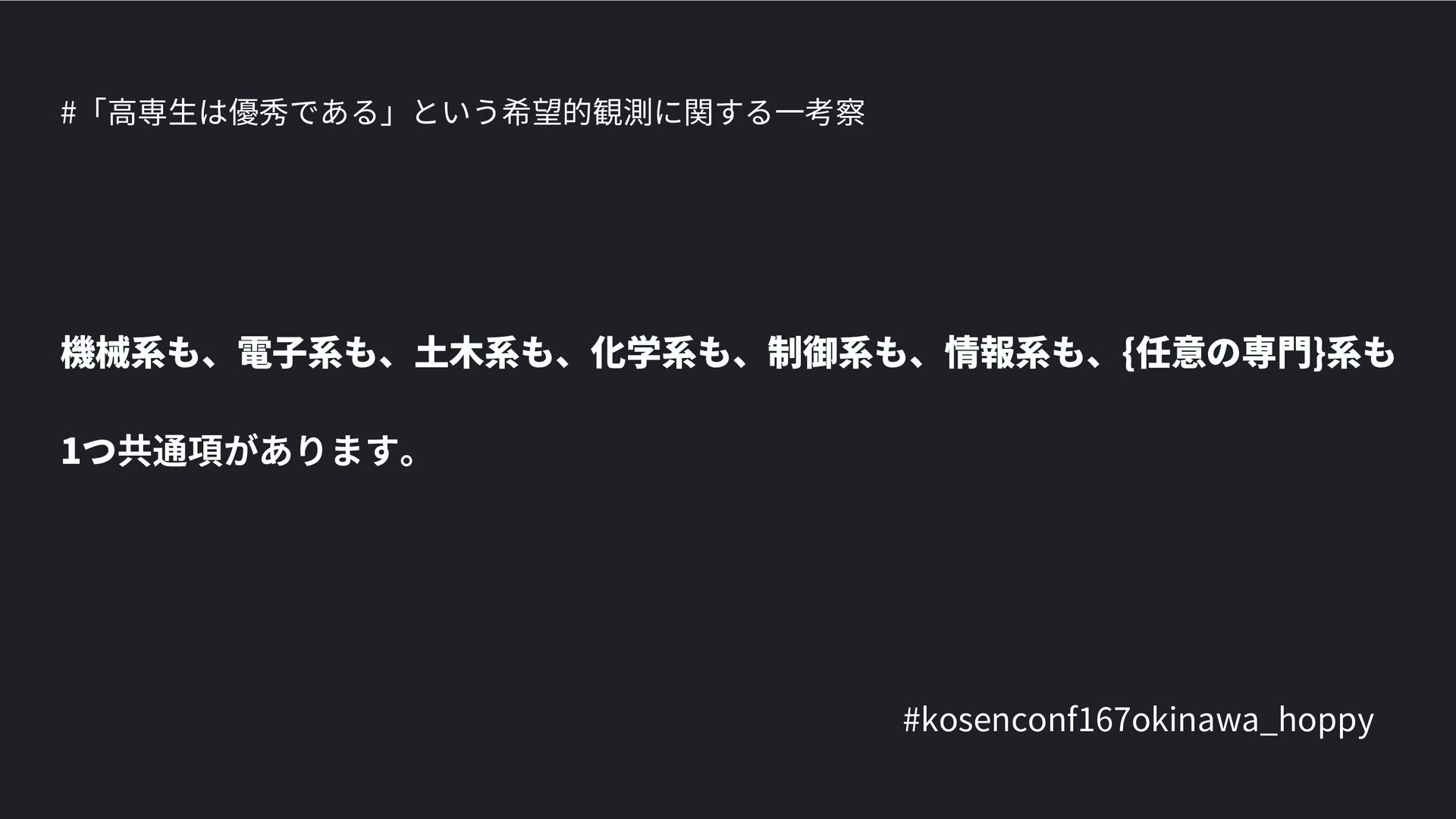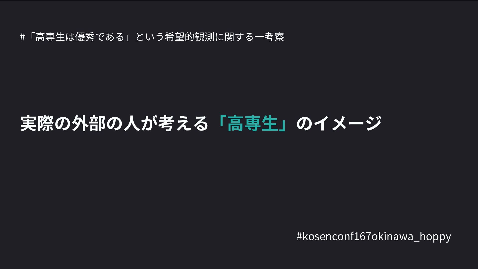 高専カンファレンス167in沖縄2024 にて登壇した際の資料です。 テーマ 高専人(こうせんちゅ)ぬ宝 ~南の島で郷土愛を叫ぶ~ https://connpass.com/event/317340/