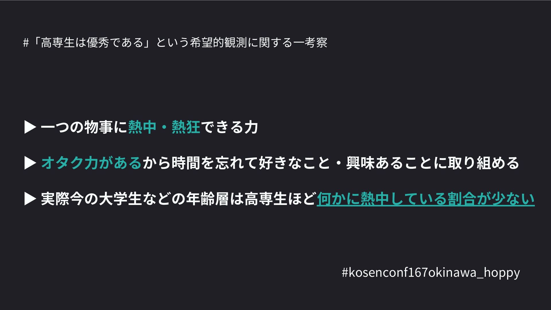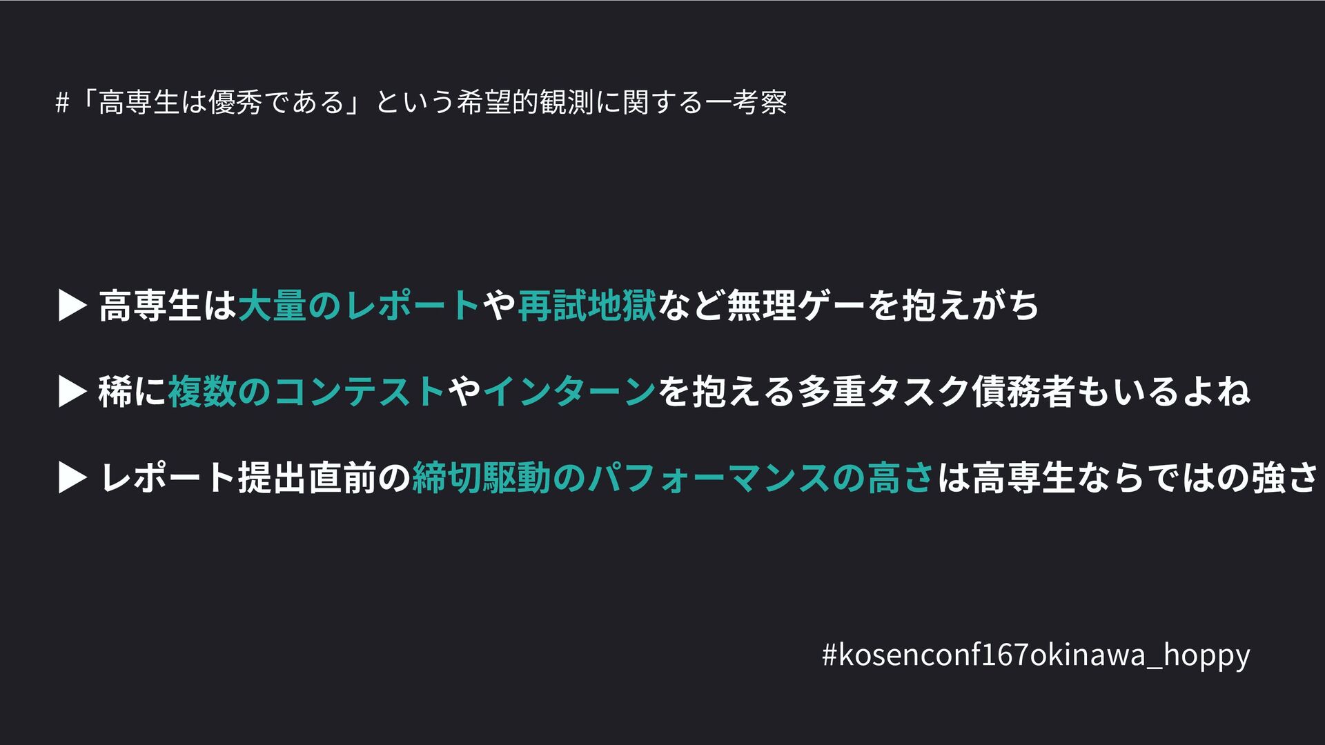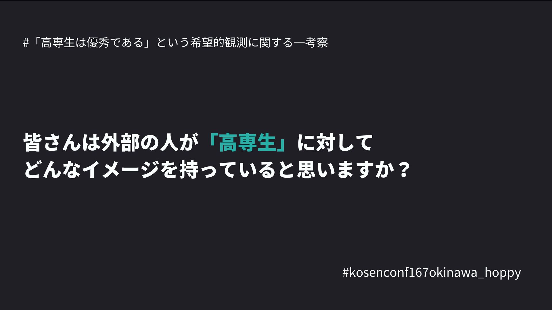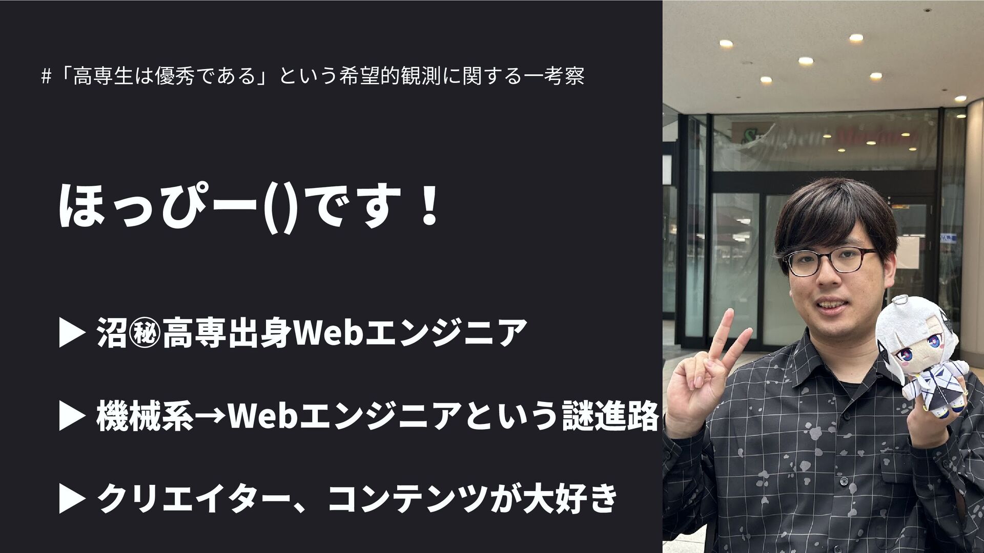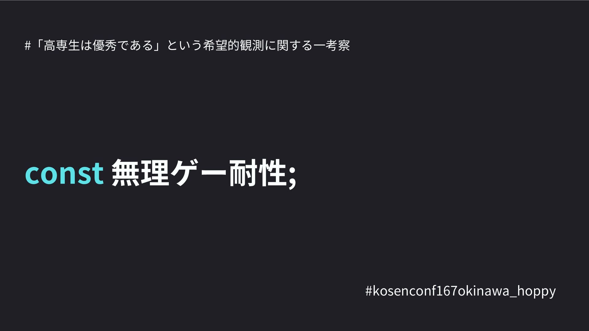 高専カンファレンス167in沖縄2024 にて登壇した際の資料です。 テーマ 高専人(こうせんちゅ)ぬ宝 ~南の島で郷土愛を叫ぶ~ https://connpass.com/event/317340/