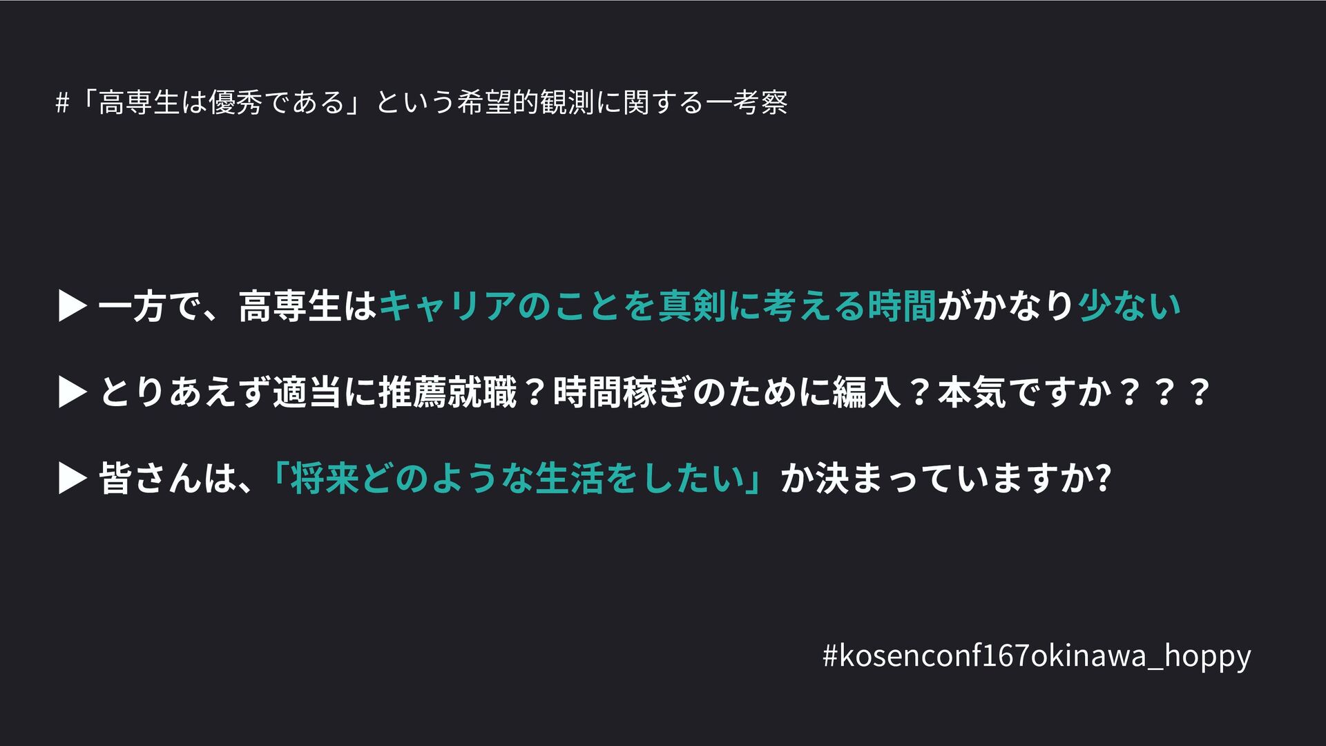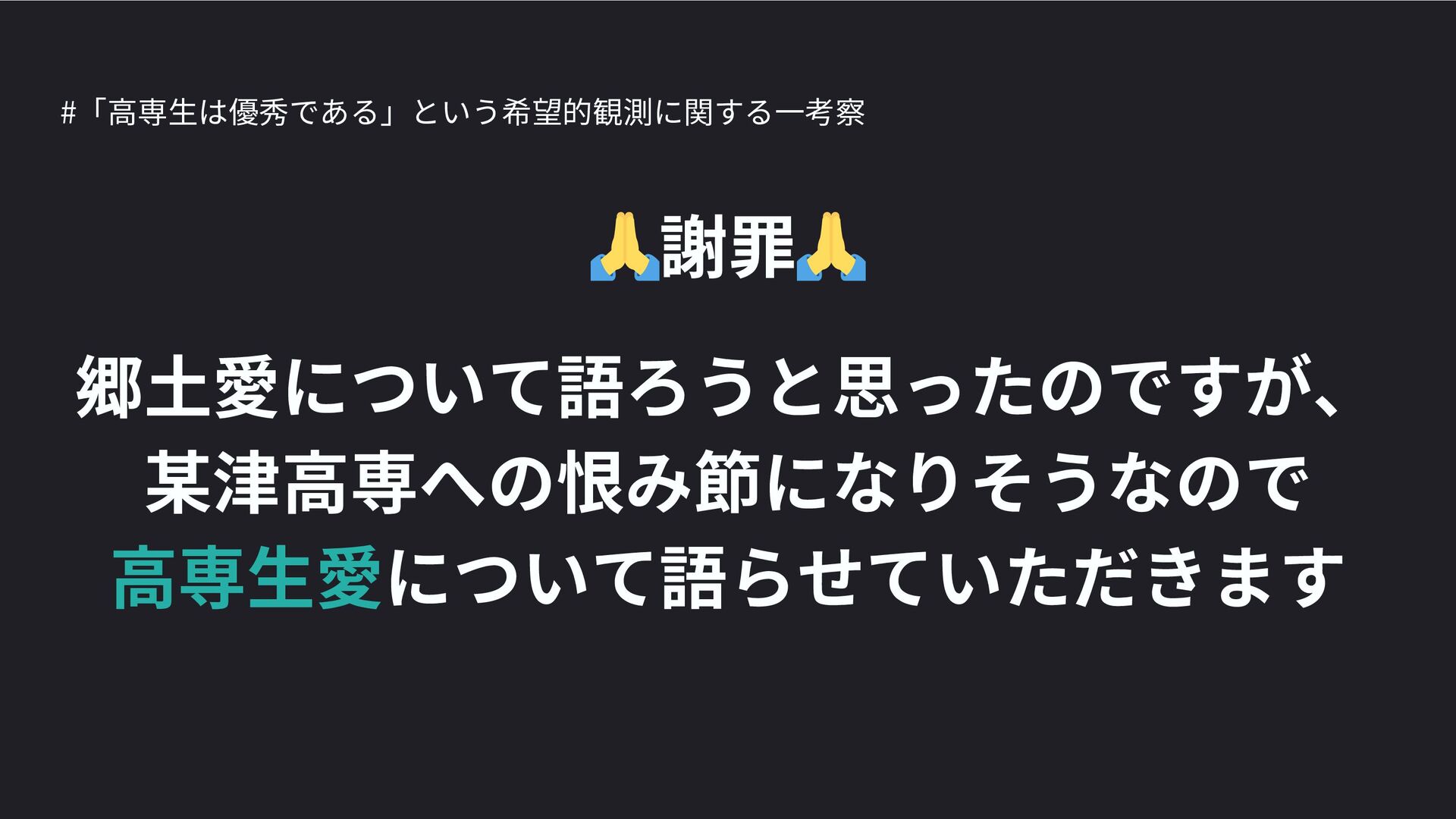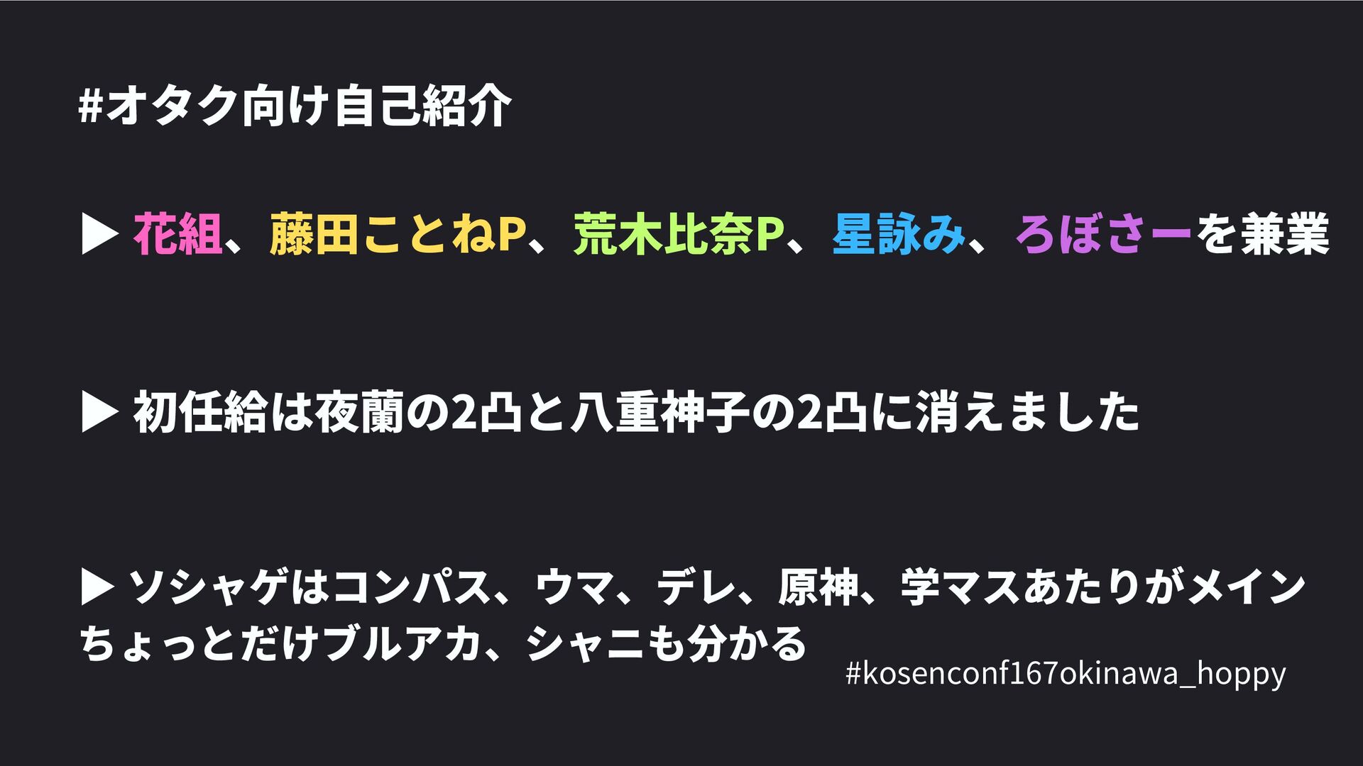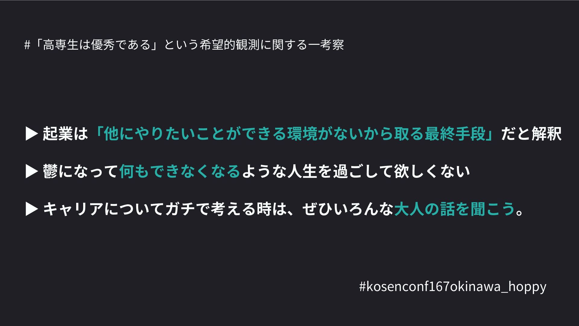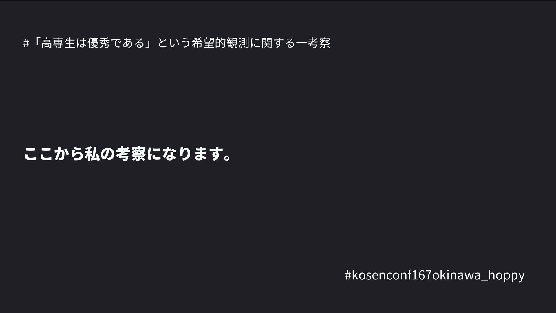高専カンファレンス167in沖縄2024 にて登壇した際の資料です。 テーマ 高専人(こうせんちゅ)ぬ宝 ~南の島で郷土愛を叫ぶ~ https://connpass.com/event/317340/