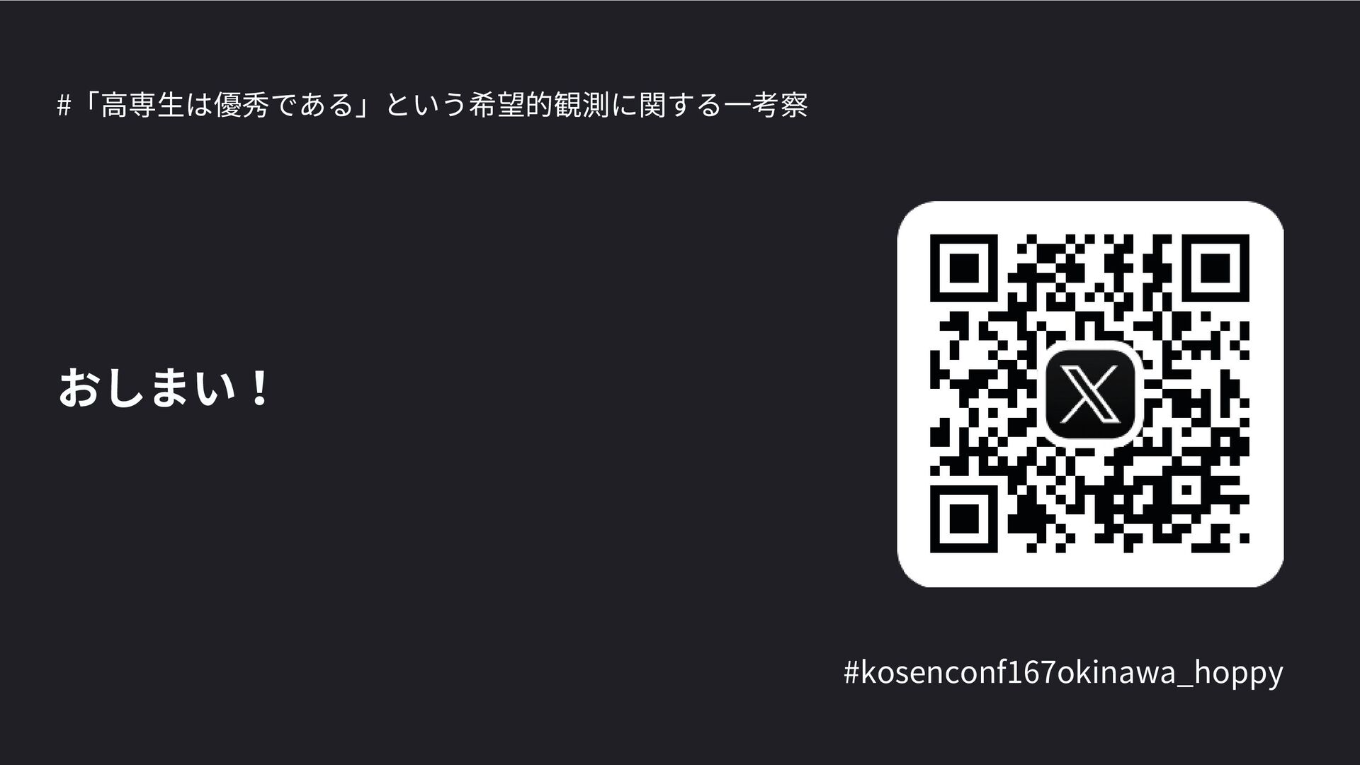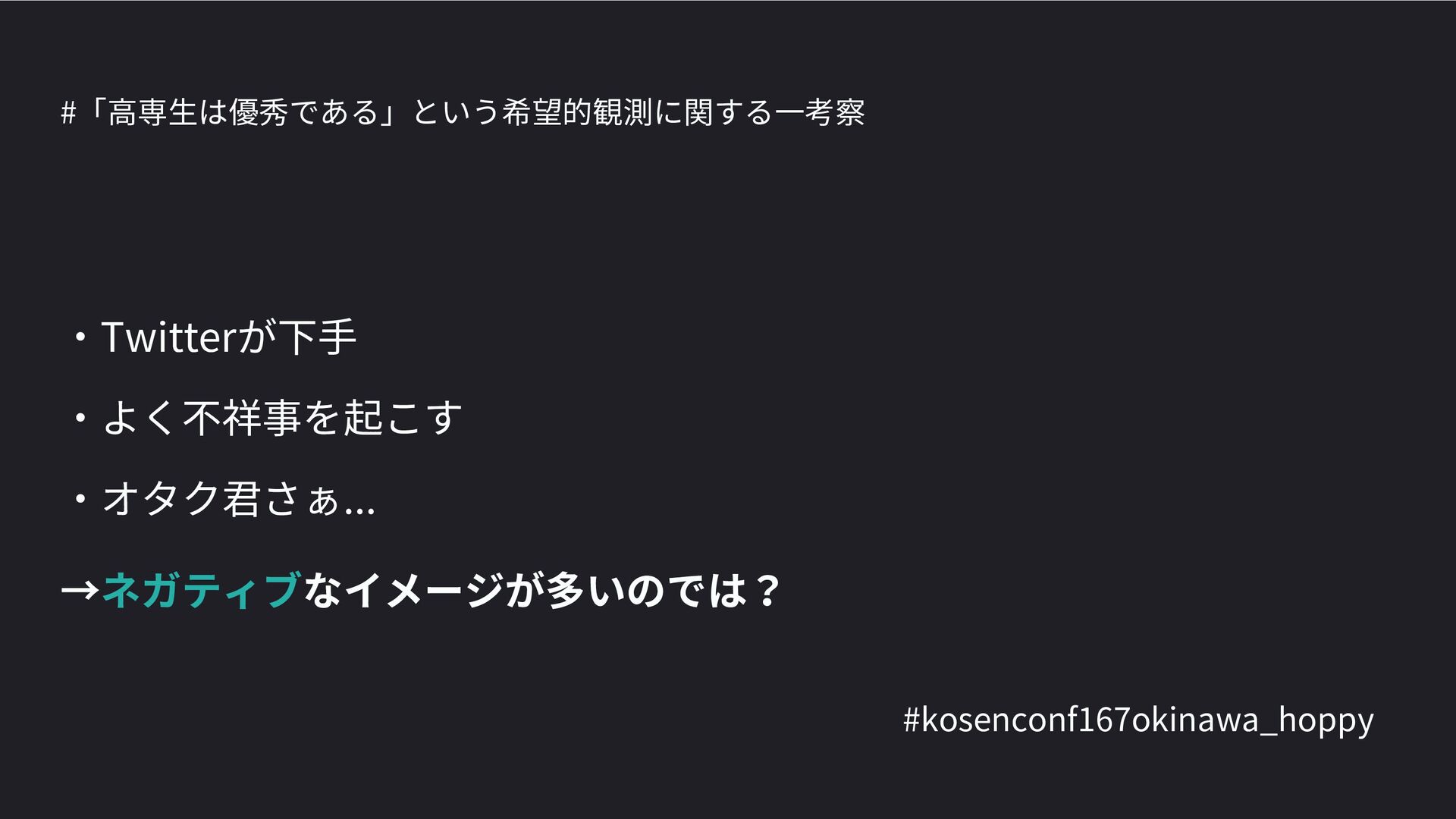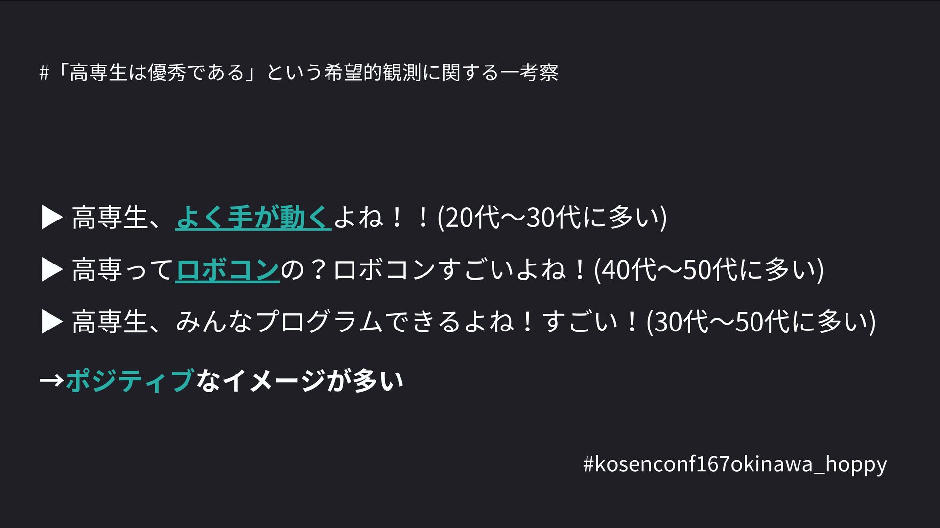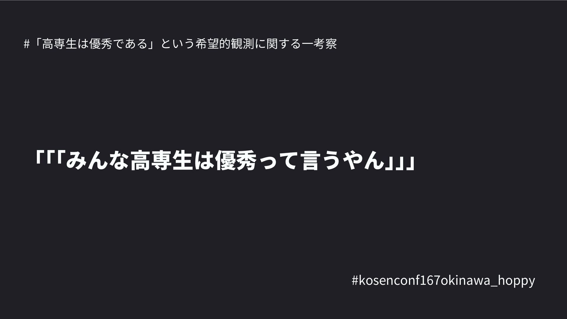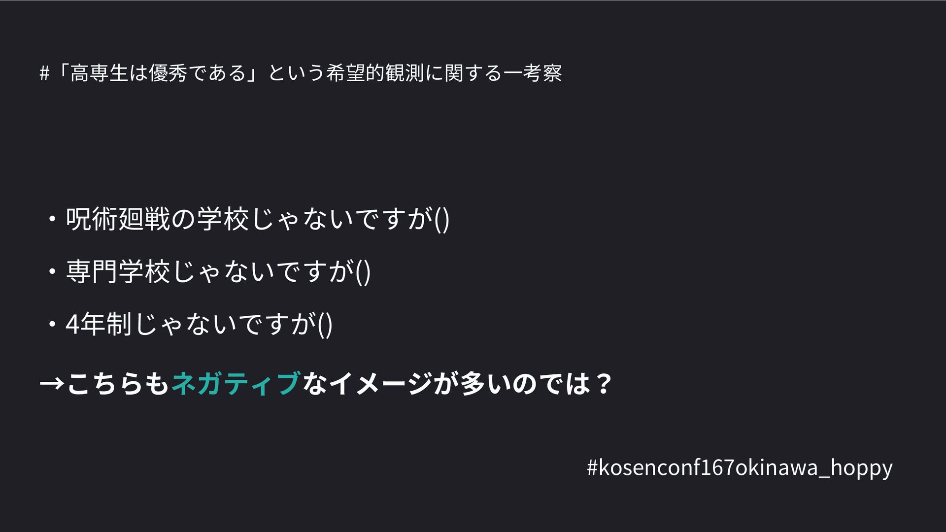 高専カンファレンス167in沖縄2024 にて登壇した際の資料です。 テーマ 高専人(こうせんちゅ)ぬ宝 ~南の島で郷土愛を叫ぶ~ https://connpass.com/event/317340/