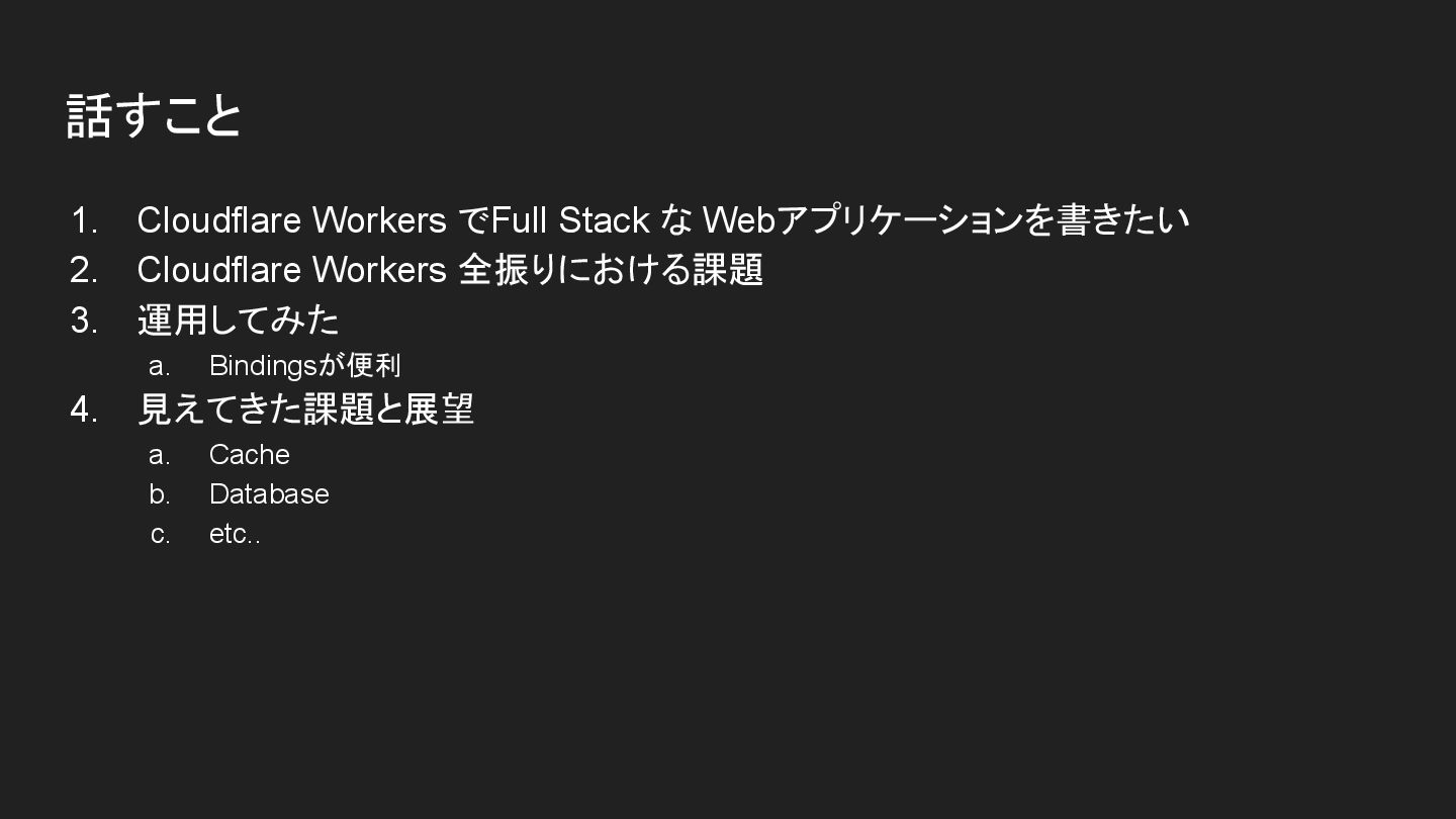 Workers 全振りにおける課題 3. 運用してみた a. Bindingsが便利 4. 見えてきた課題と展望 a. Cache b. Database c. etc..