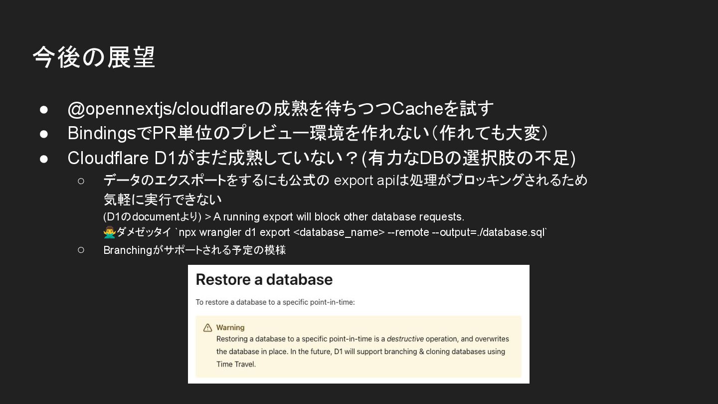 今後の展望 • @opennextjs/cloudflareの成熟を待ちつつCacheを試す • BindingsでPR単位のプレビュー環境を作れない(作れても大変) • Cloudflare D1がまだ成熟していない?(有力なDBの選択肢の不足) ◦ データのエクスポートをするにも公式の