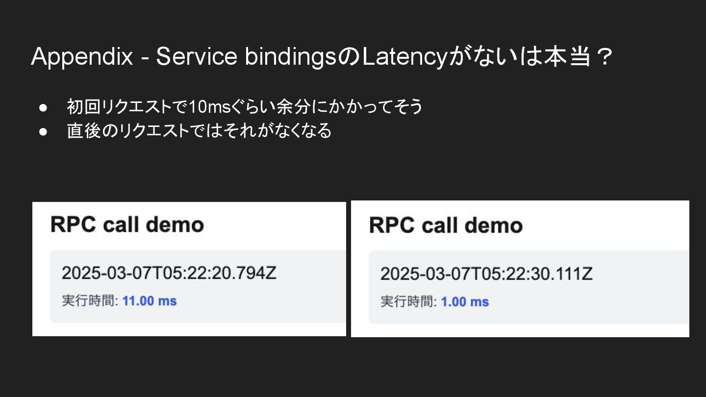 Appendix - Service bindingsのLatencyがないは本当? • 初回リクエストで10msぐらい余分にかかってそう • 直後のリクエストではそれがなくなる