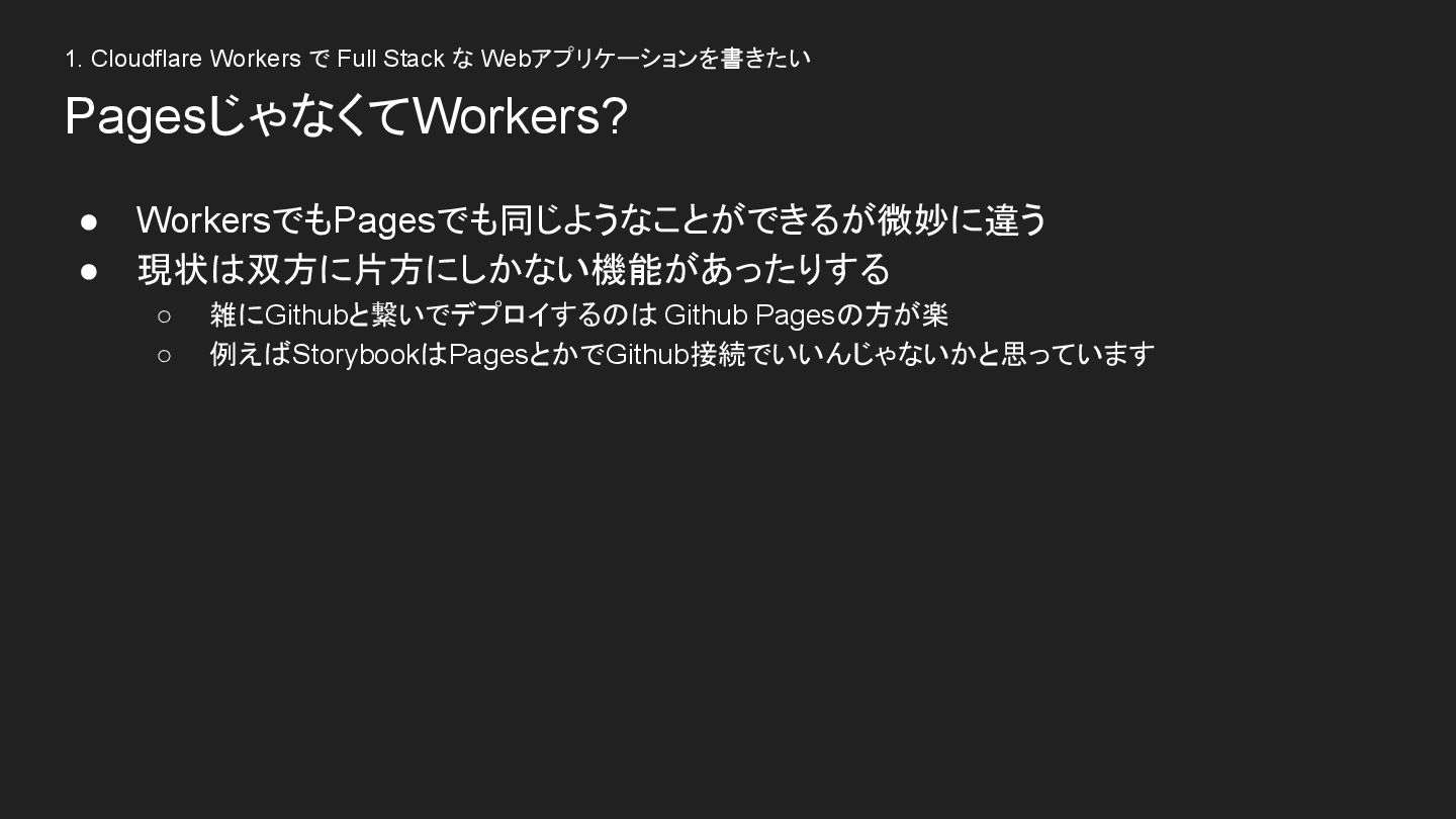 例えばStorybookはPagesとかでGithub接続でいいんじゃないかと思っています 1. Cloudflare Workers で Full Stack な Webアプリケーションを書きたい