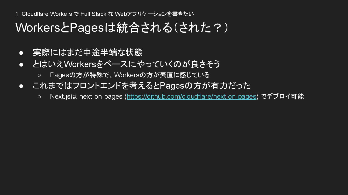 WorkersとPagesは統合される(された?) • 実際にはまだ中途半端な状態 • とはいえWorkersをベースにやっていくのが良さそう ◦ Pagesの方が特殊で、Workersの方が素直に感じている • これまではフロントエンドを考えるとPagesの方が有力だった ◦