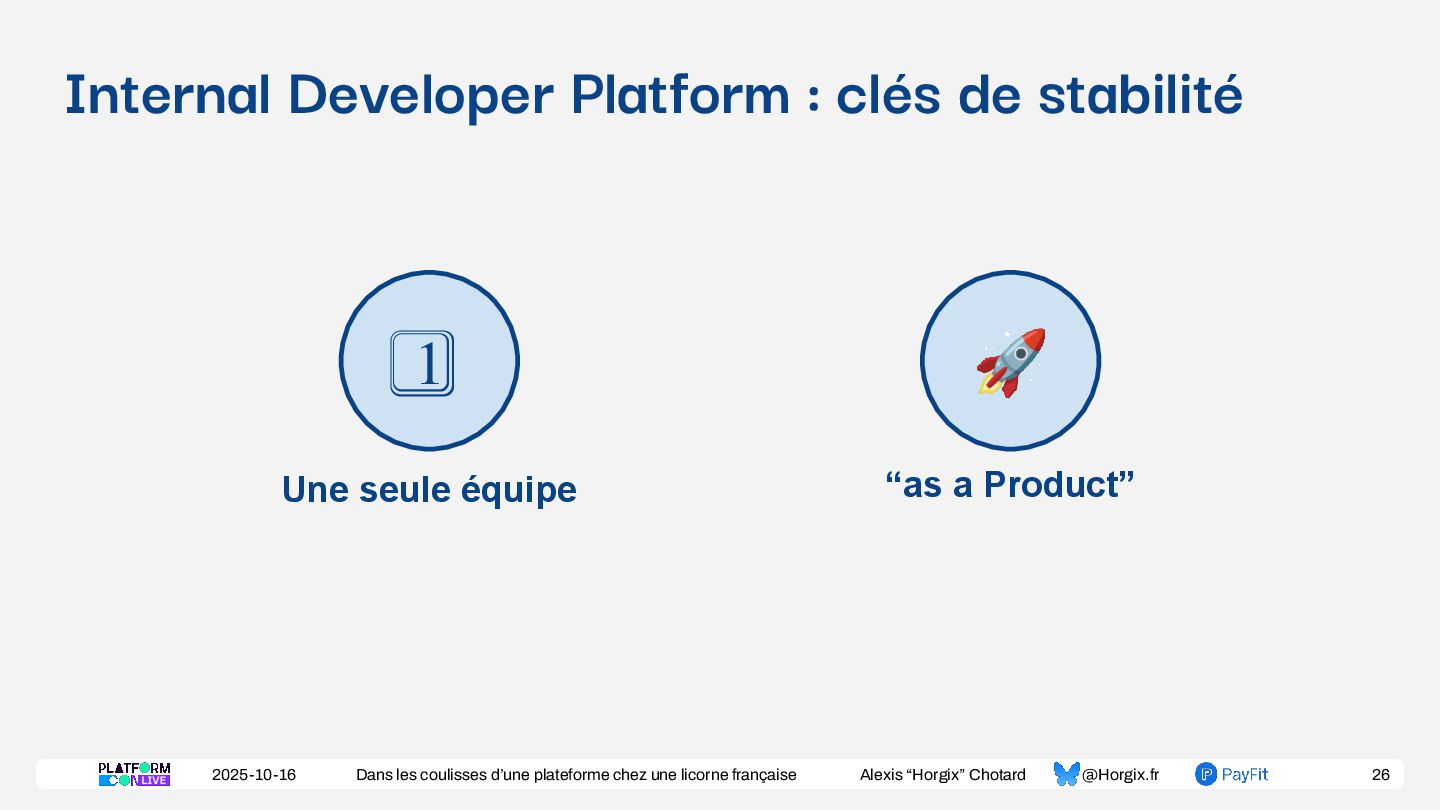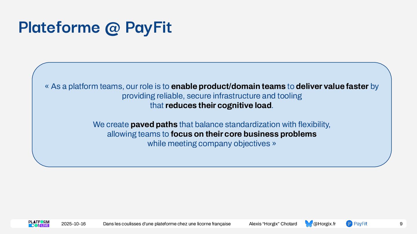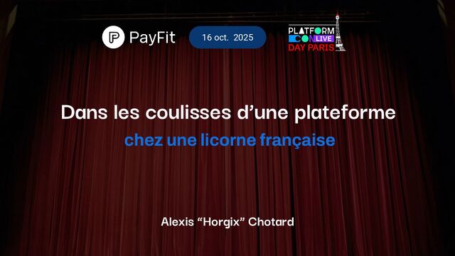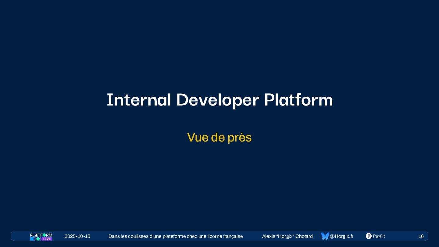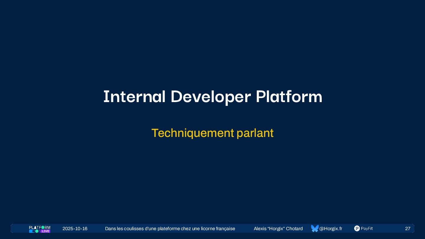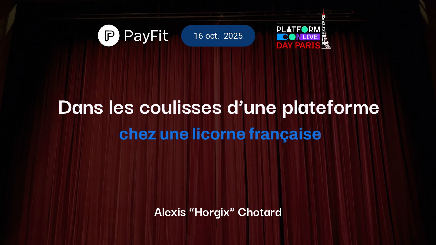 Ceci est le deck de slides d'un talk (30min) présenté à la conférence PlatformCon Live en octobre 2025 à Paris par Alexis "Horgix" Chotard au sujet de la plateforme (dévelopeurs) interne de PayFit.