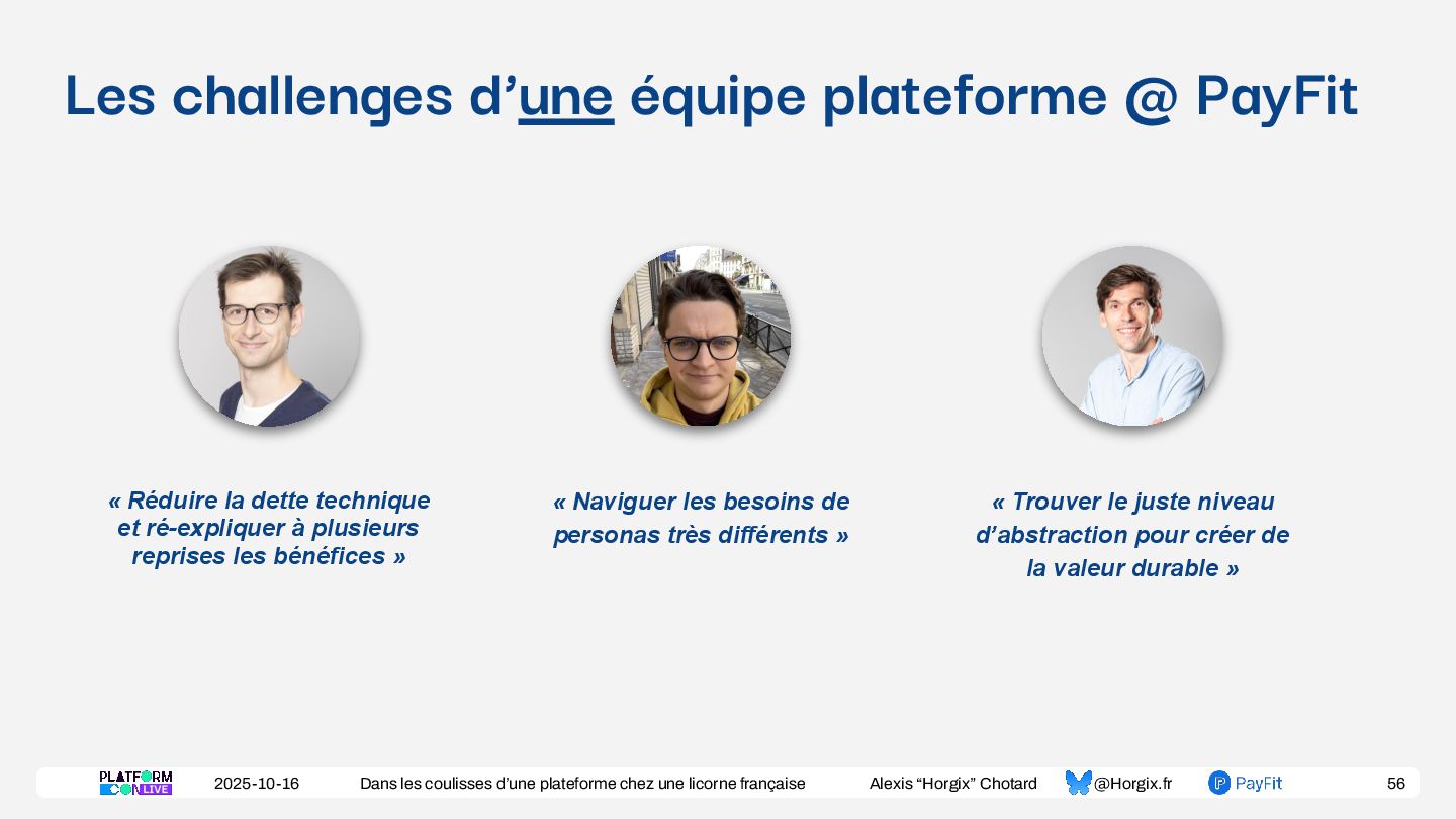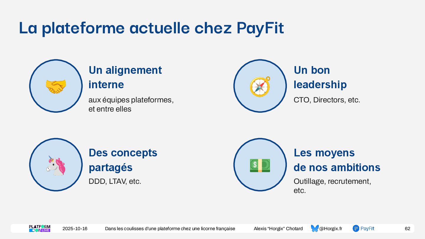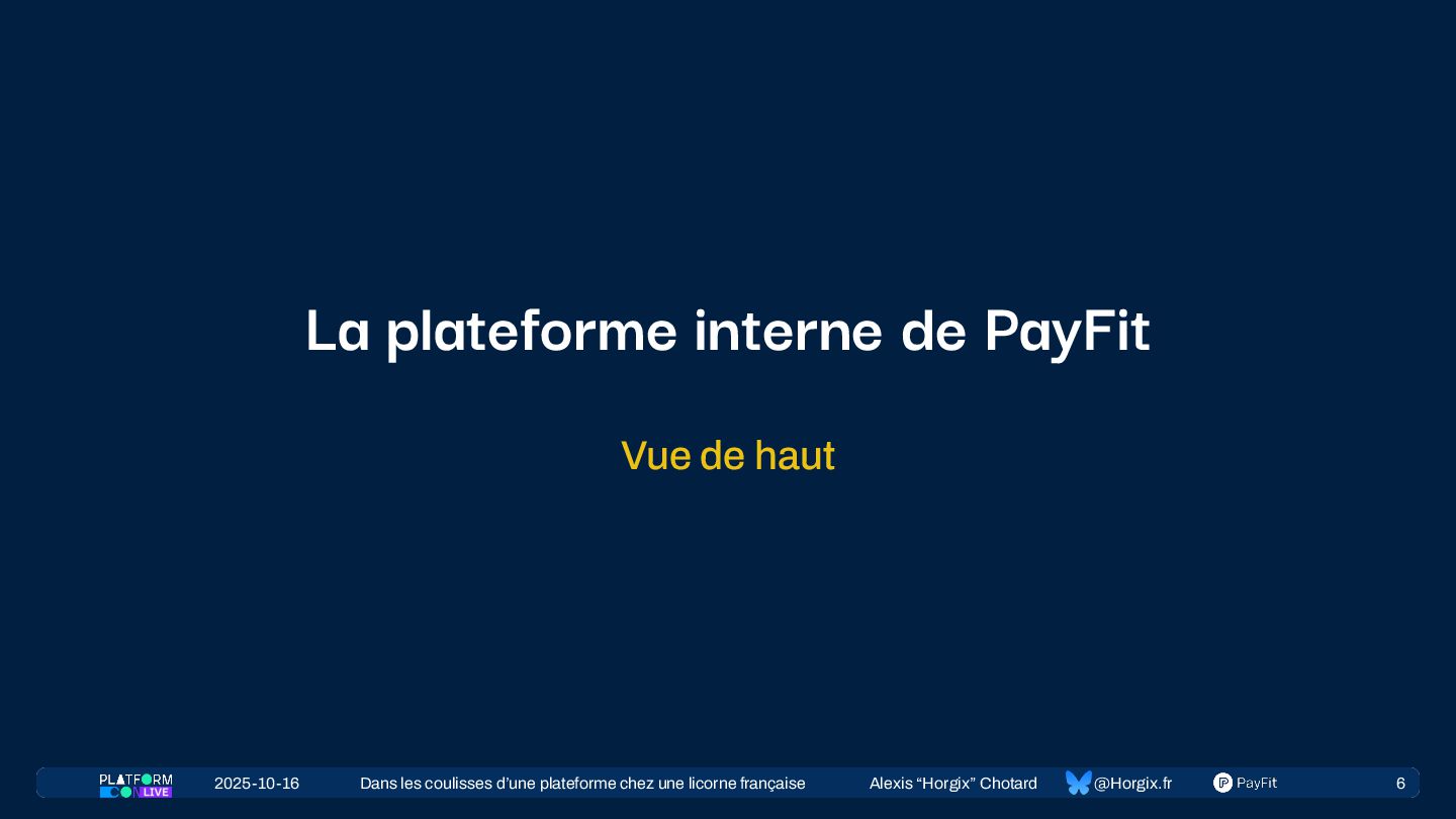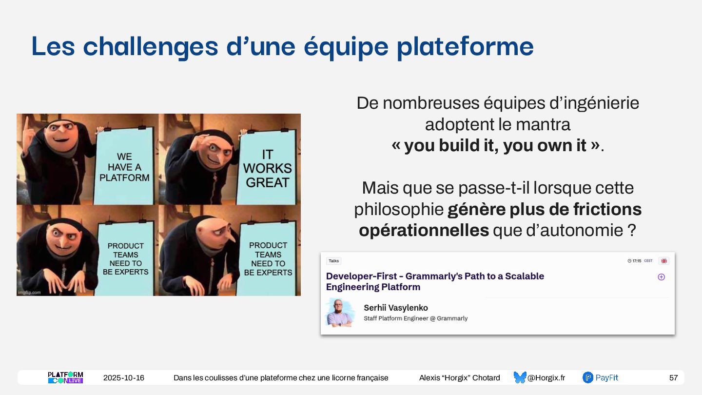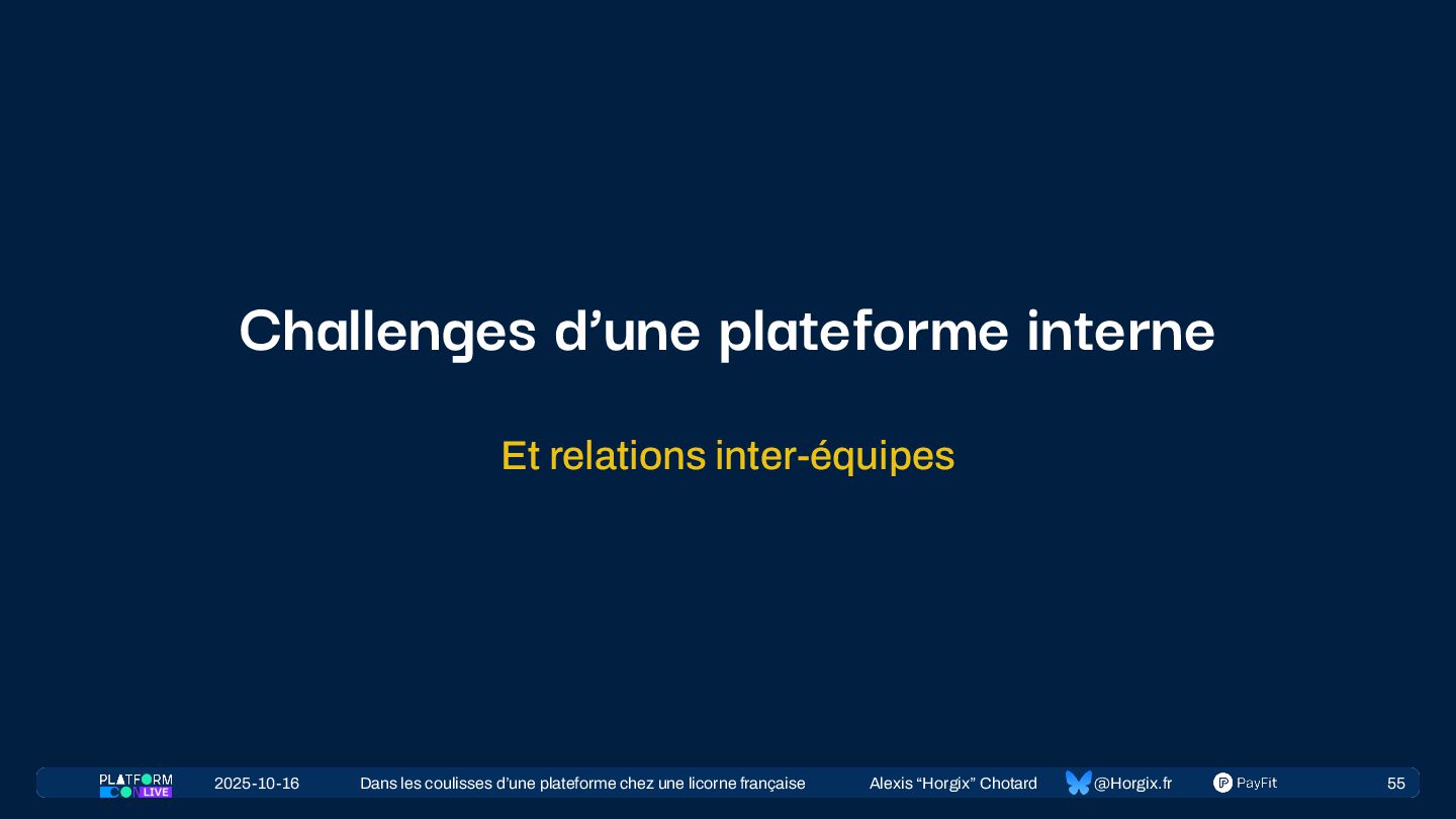 Ceci est le deck de slides d'un talk (30min) présenté à la conférence PlatformCon Live en octobre 2025 à Paris par Alexis "Horgix" Chotard au sujet de la plateforme (dévelopeurs) interne de PayFit.