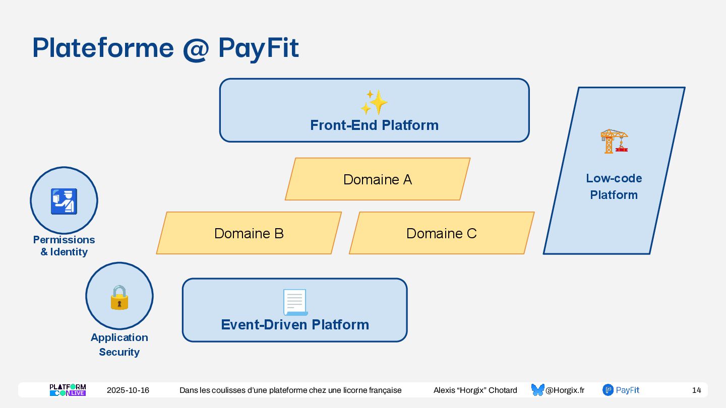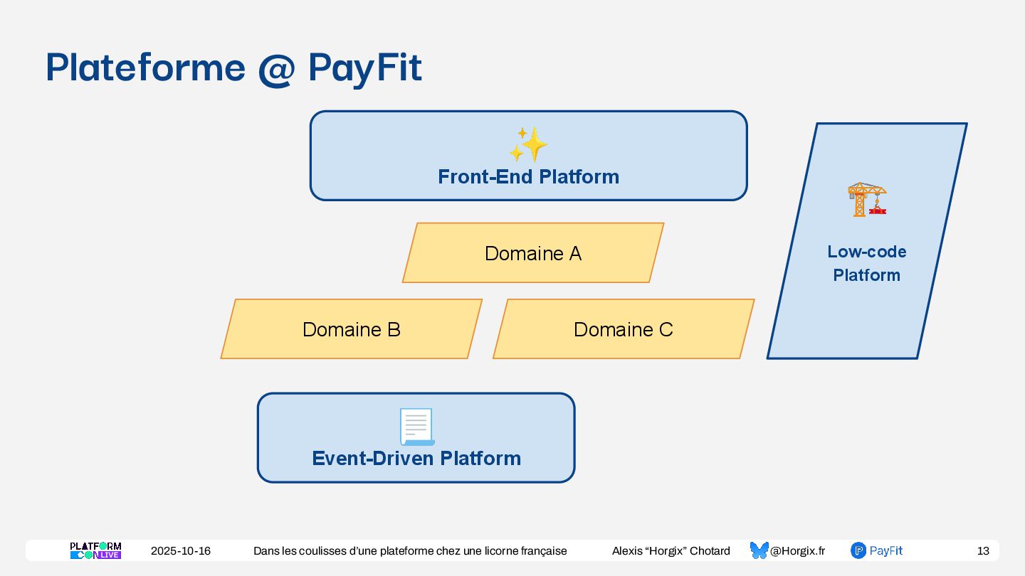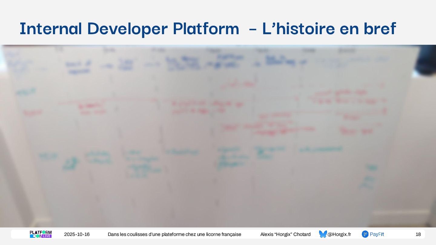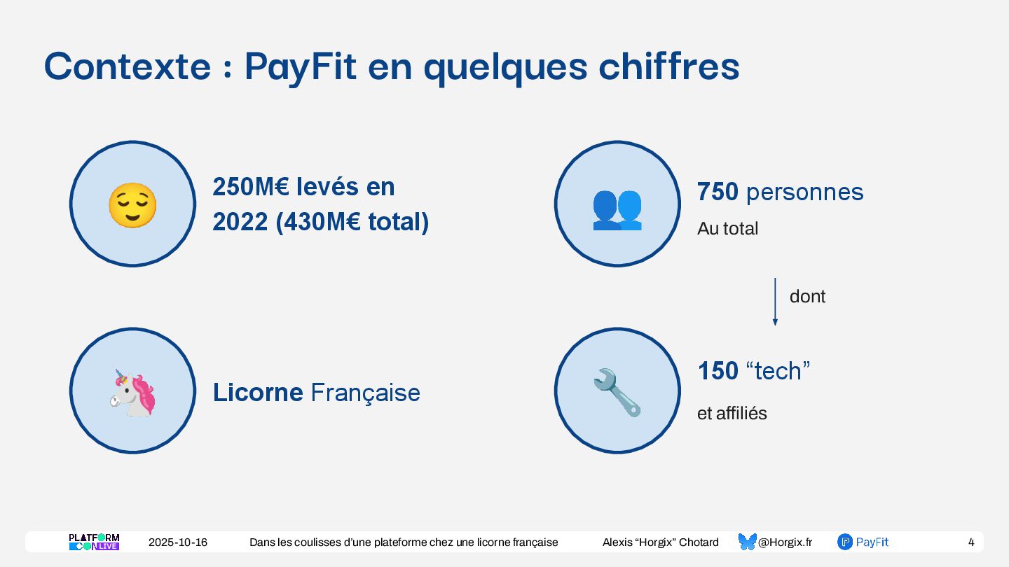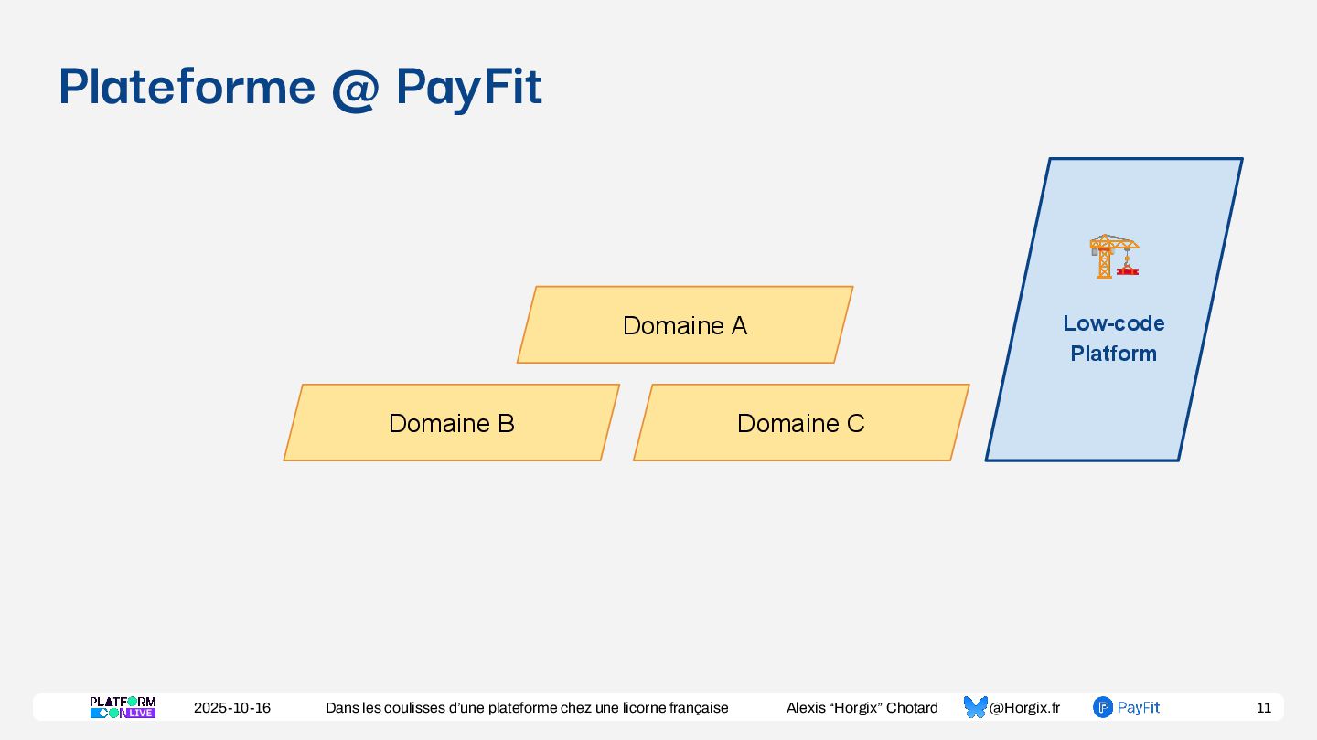 Ceci est le deck de slides d'un talk (30min) présenté à la conférence PlatformCon Live en octobre 2025 à Paris par Alexis "Horgix" Chotard au sujet de la plateforme (dévelopeurs) interne de PayFit.
