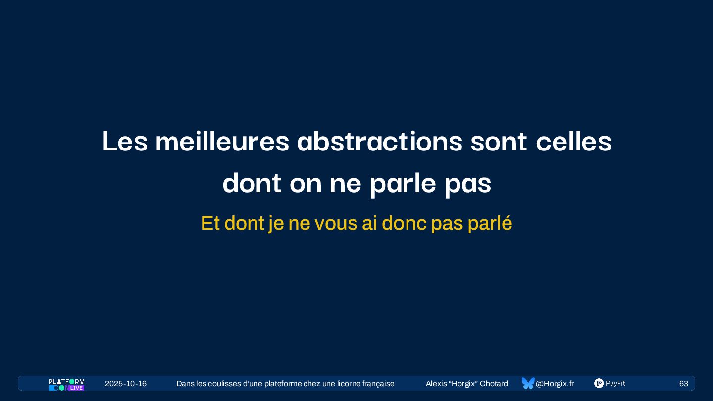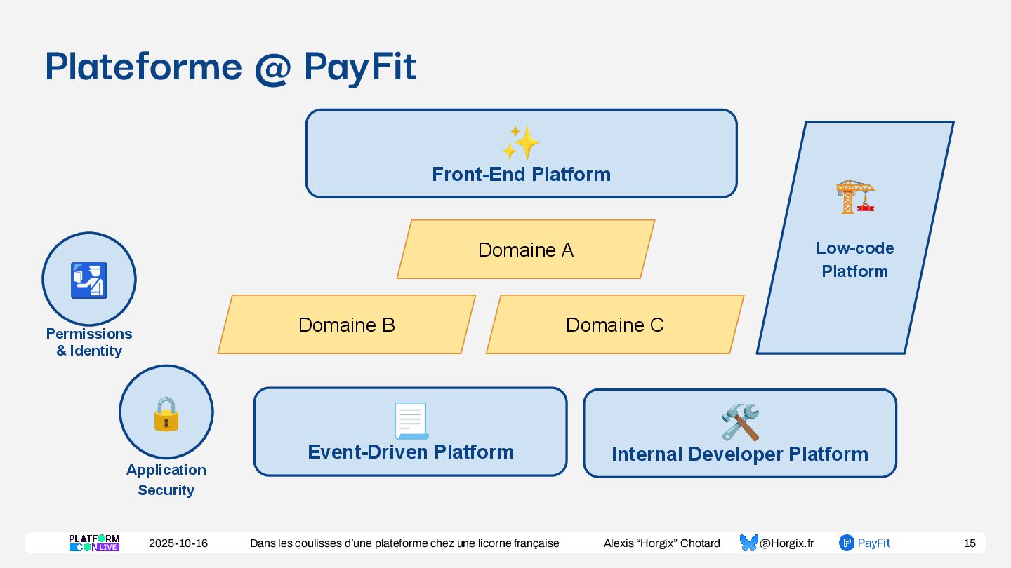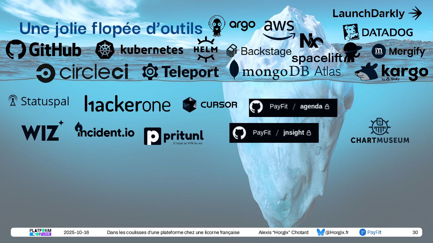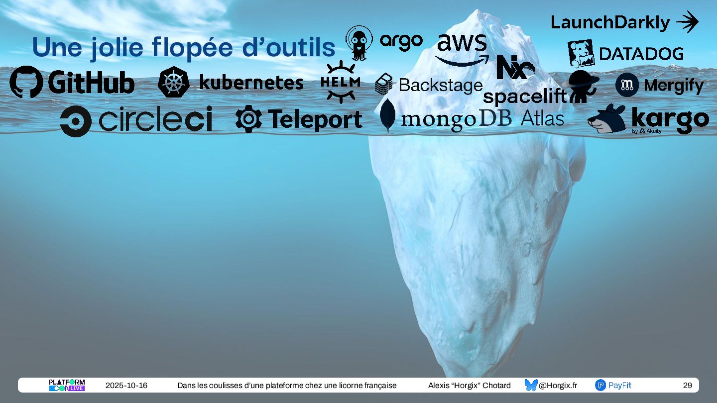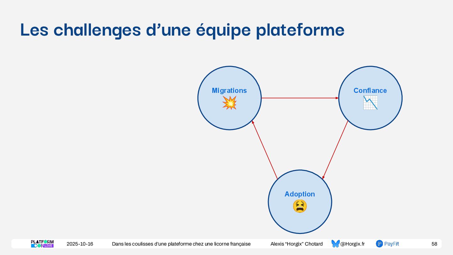 Ceci est le deck de slides d'un talk (30min) présenté à la conférence PlatformCon Live en octobre 2025 à Paris par Alexis "Horgix" Chotard au sujet de la plateforme (dévelopeurs) interne de PayFit.