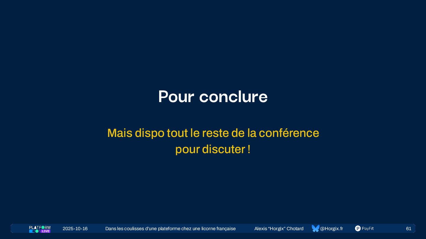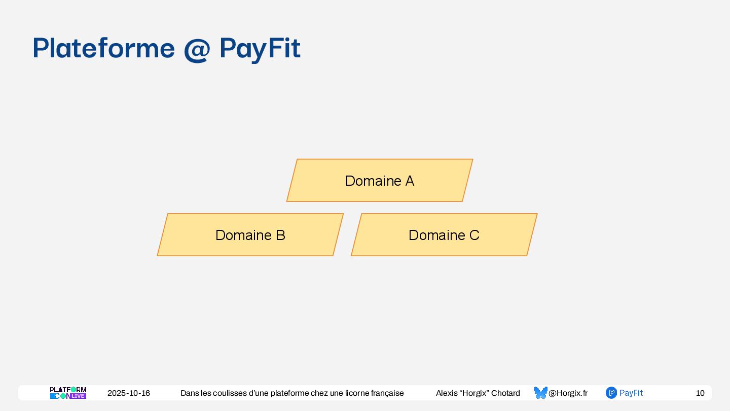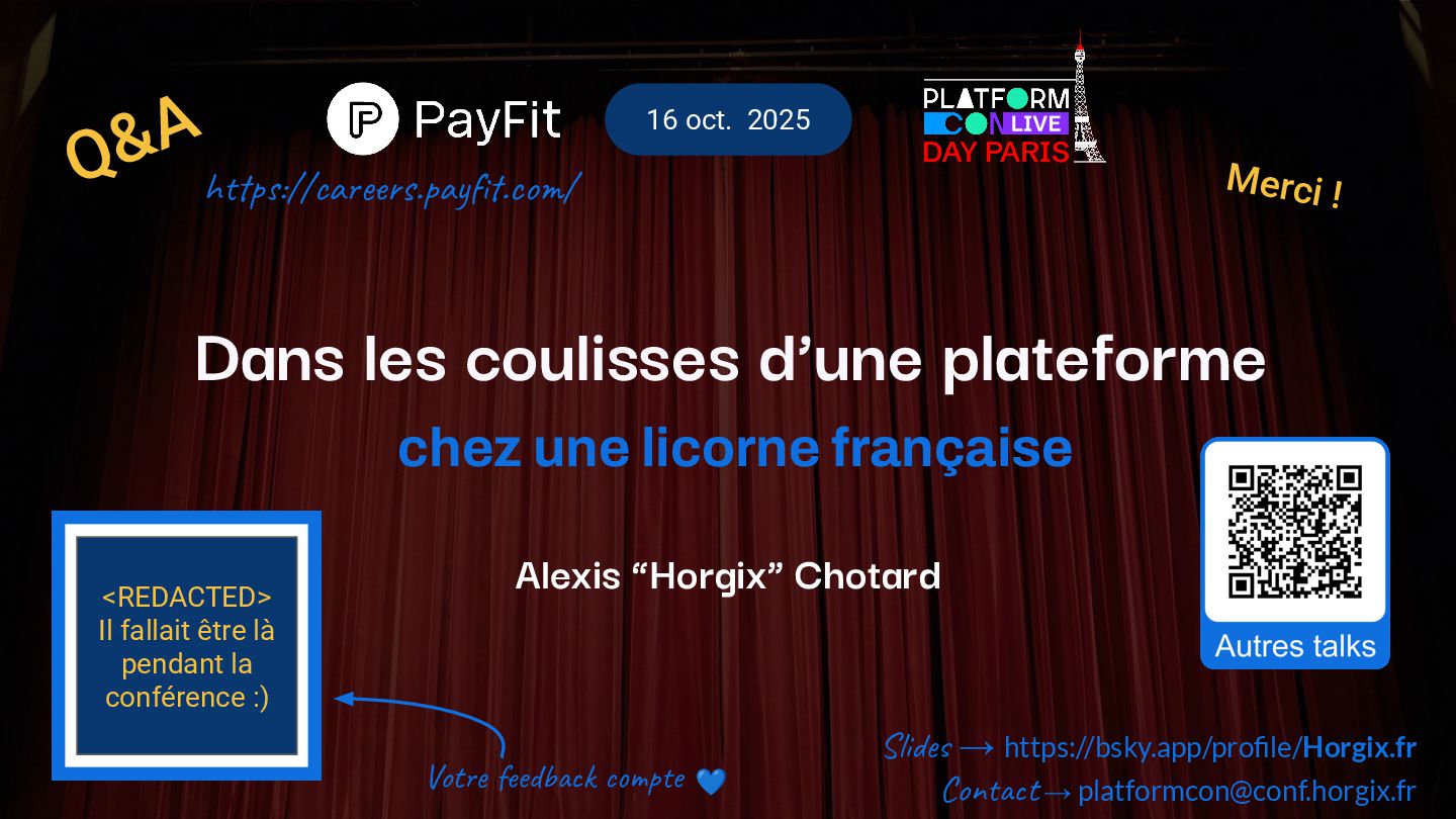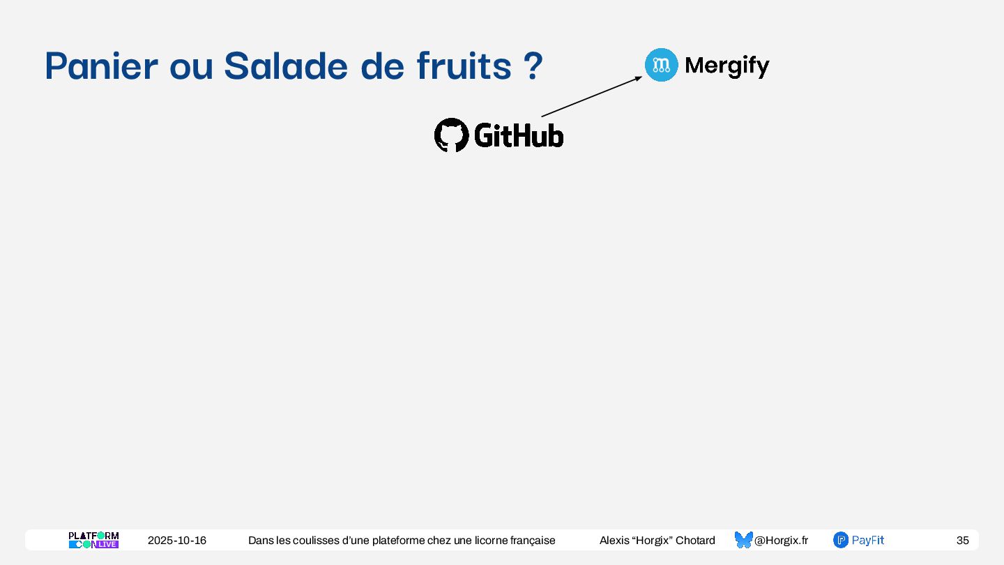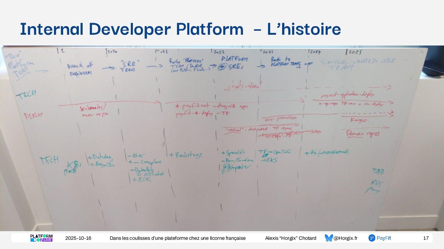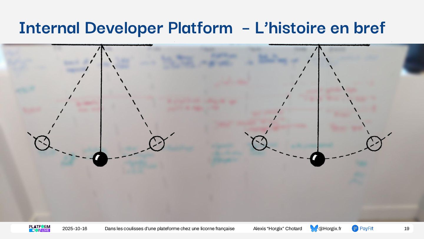 Ceci est le deck de slides d'un talk (30min) présenté à la conférence PlatformCon Live en octobre 2025 à Paris par Alexis "Horgix" Chotard au sujet de la plateforme (dévelopeurs) interne de PayFit.