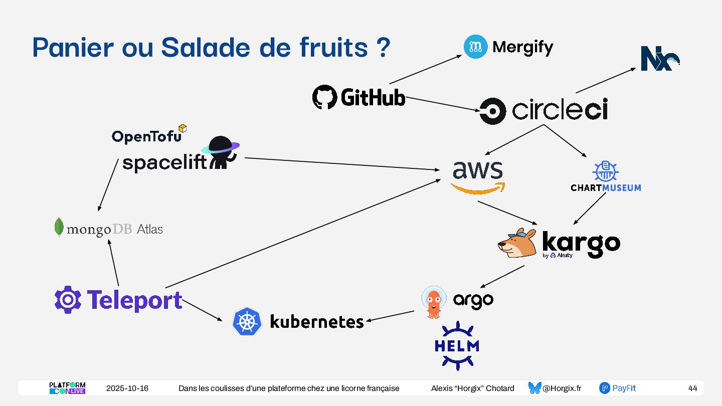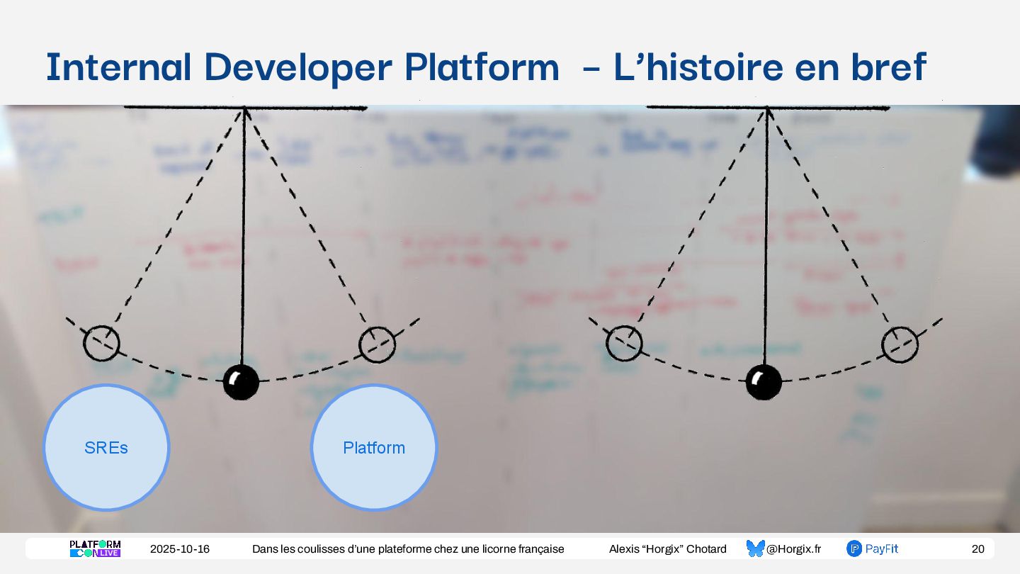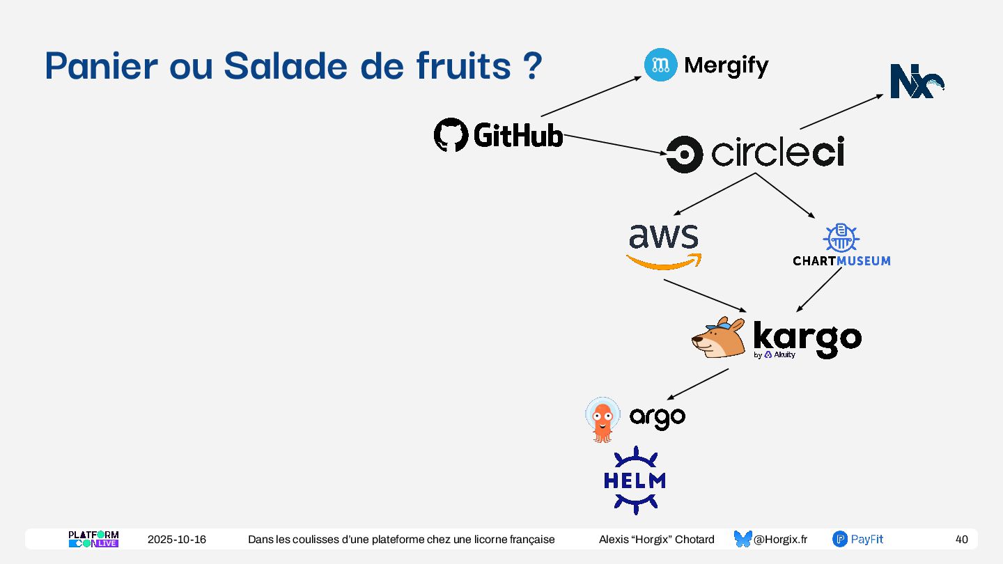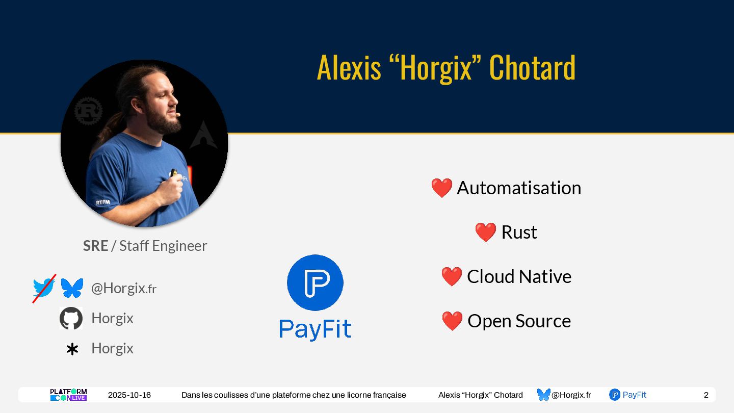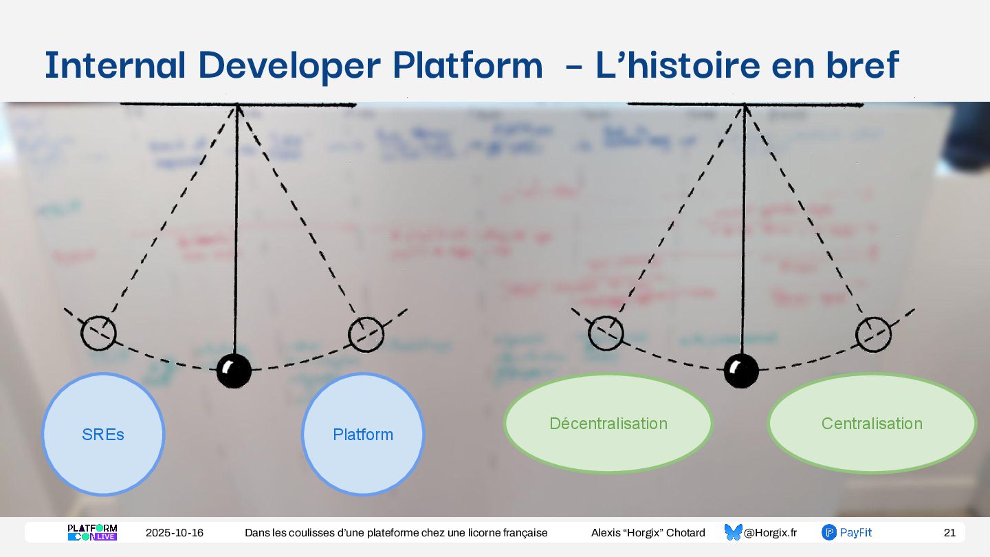 Ceci est le deck de slides d'un talk (30min) présenté à la conférence PlatformCon Live en octobre 2025 à Paris par Alexis "Horgix" Chotard au sujet de la plateforme (dévelopeurs) interne de PayFit.