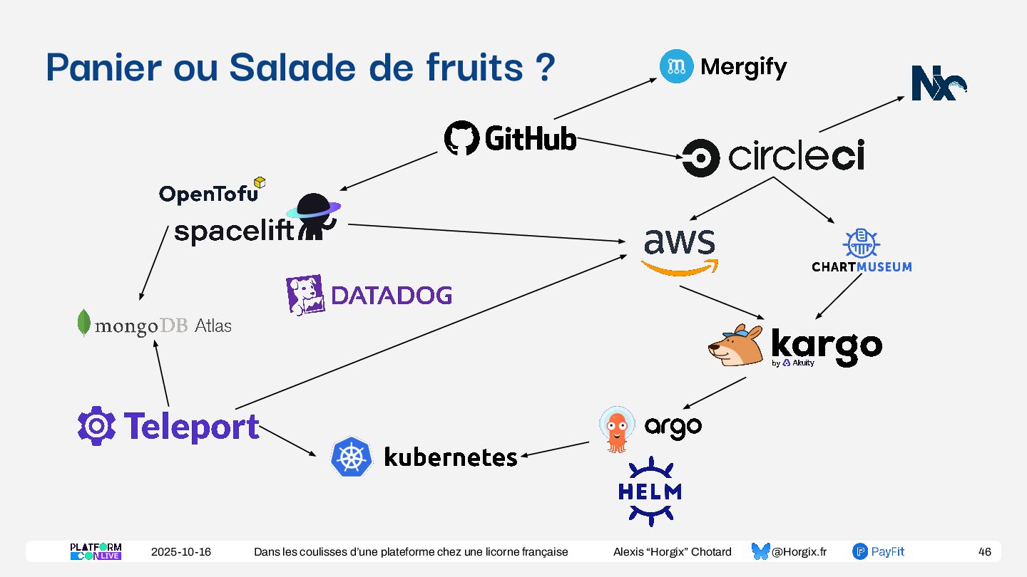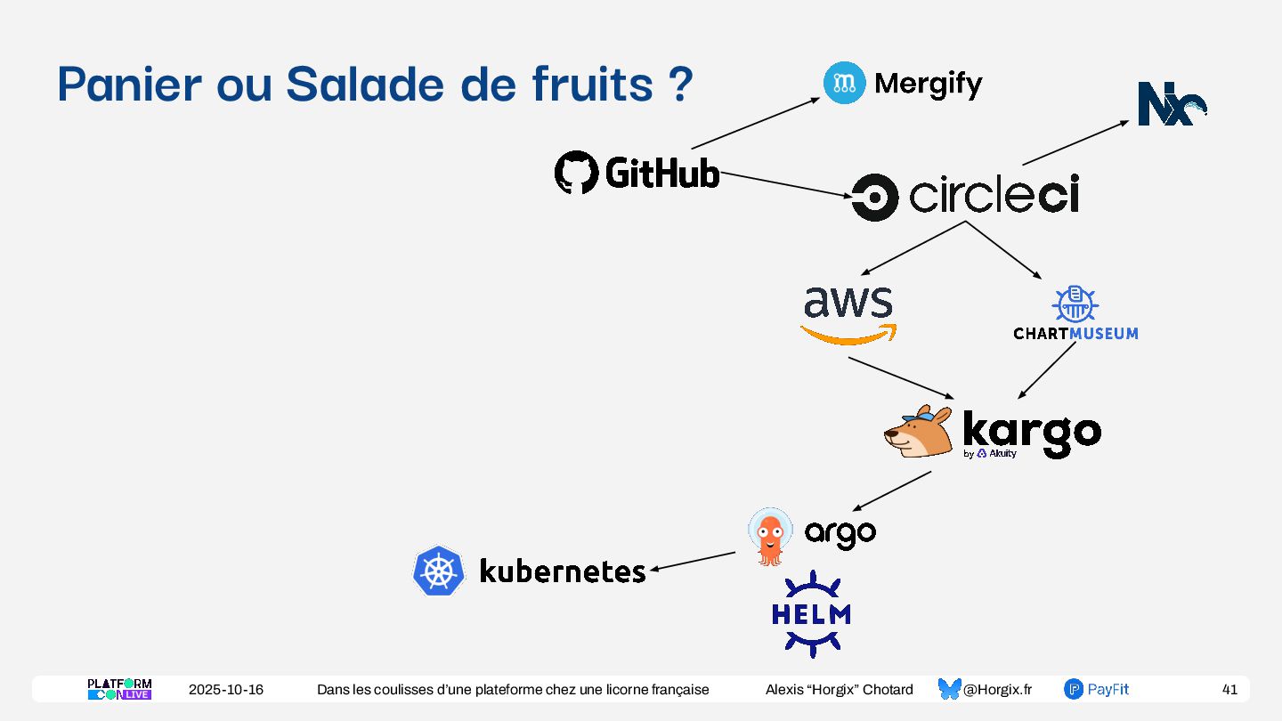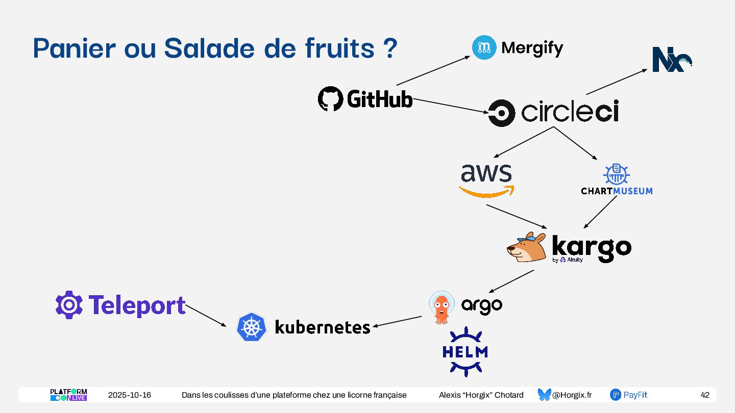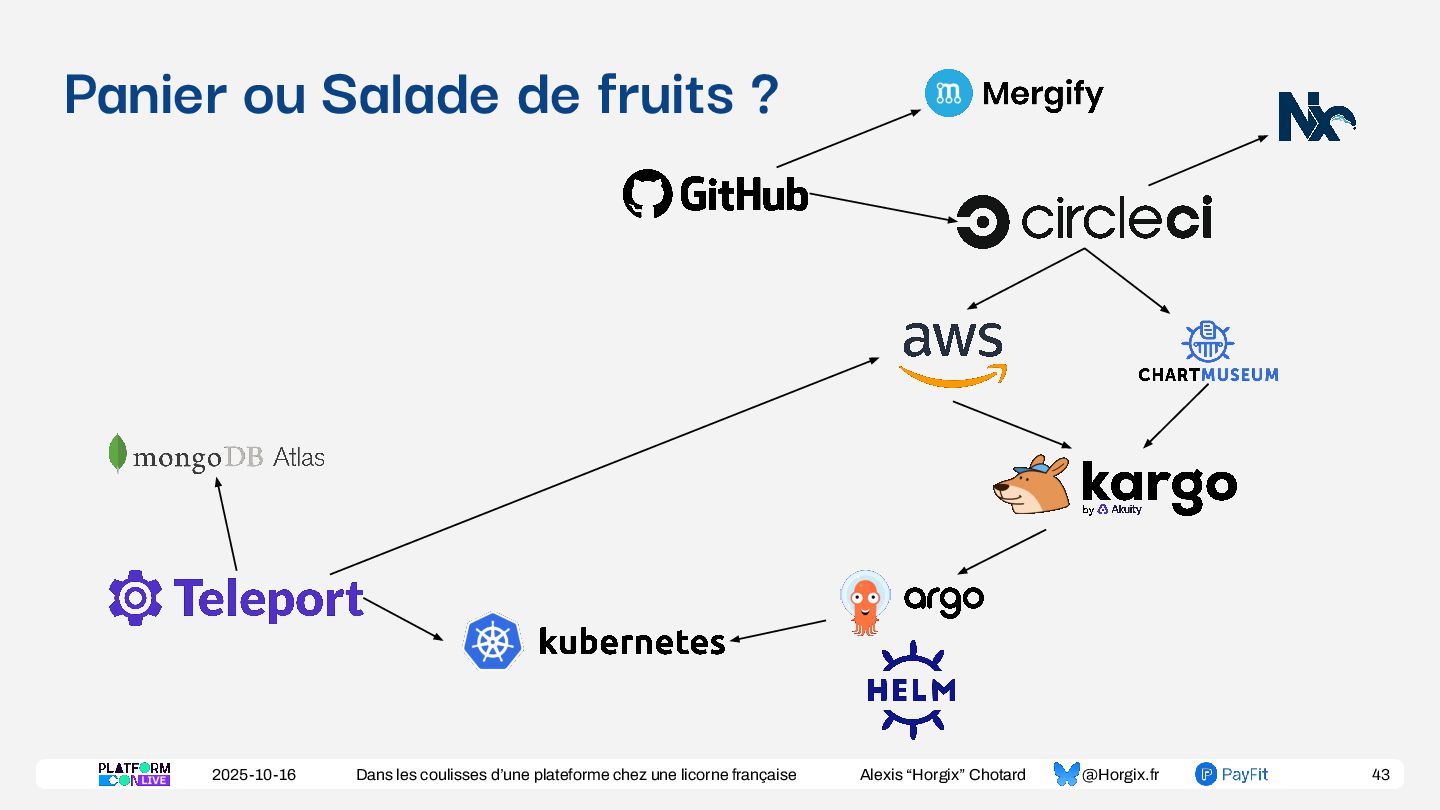 À quoi ressemble une véritable "Internal Developer Platform" dans une scale-up tech française ? Chez PayFit, nous avons construit une plateforme au service des équipes produit, en misant sur des briques existantes comme AWS, Kubernetes, ArgoCD, CircleCI, Kargo, Backstage, Nx, et surtout une conviction forte : ne pas réinventer la roue quand des outils tiers font le job; le tout avec comme objectif principal la vélocité des équipes produits et la facilité de maintenance dans la durée.