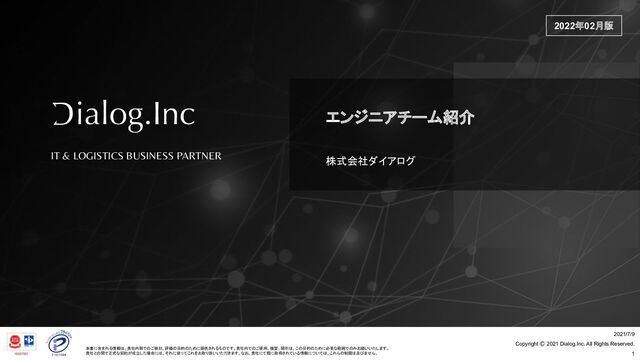 W3 SIRIUS」リリース ✔ 02月 プライバシーマーク(第 21001068号)取得 ✔ 06月 ISO27001(情報セキュリティマネジメントシステム)取得 ✔ 08月 ダイアログラボ開設(東京赤羽橋) ✔ 11月 大阪支社開設 ✔ 05月 SaaS型在庫・倉庫管理サービス「 W3 MIMOSA」リリース ✔ 10月 株式会社 MONOサプライ品販売開始 ✔ 10月 「SMARI」ローソン設置 2000台突破・大阪名古屋サービス開始 ✔ 11月 センター管理会計・請求サービス「 Tariffee」リリース ✔ 12月 W3シリーズ導入企業数 200社突破 ✔ 01月 3PL事業開始 ✔ 01月 D2Cフルフィルメントサービス「 Yellow Tail」リリース ✔ 03月 「SMARI」ローソン設置 3000台突破 ✔ 04月 新卒採用開始 ✔ 05月 ダイアログ川越物流センター開設(予定) ✔ 04月 無人返品サービス「 SMARI」サービスイン ✔ 12月 ロボット・マテハン取扱開始 2013 2014 2015 2016 2017 2018 2019 2020 2021 ✔ 08月 W3シリーズ導入企業数 100社突破 ✔ 11月 東京複数拠点を五反田新オフィスへ集約移転 ✔ 12月 株式会社 MONO設立 物流機器販売・レンタル開始 本社 2021/7/9 Copyright Ⓒ 2021 Dialog.Inc. All Rights Reserved. 3