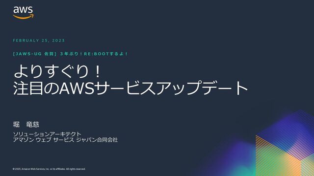rights reserved. よりすぐり︕ 注⽬のAWSサービスアップデート [ J A W S - U G 佐 賀 ] 3 年 ぶ り ︕ R E : B O O T す る よ ︕ 堀 ⻯慈 F E B R U A L Y 2 5 , 2 0 2 3 ソリューションアーキテクト アマゾン ウェブ サービス ジャパン合同会社