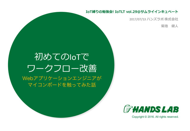 2017/07/13 ハンズラボ 株式会社 菊池 健⼈ 8FCΞϓϦέʔγϣϯΤϯδχΞ͕ ϚΠίϯϘʔυΛ৮ͬͯΈͨ IoT縛りの勉強会! IoTLT vol.29@サムライインキュベート