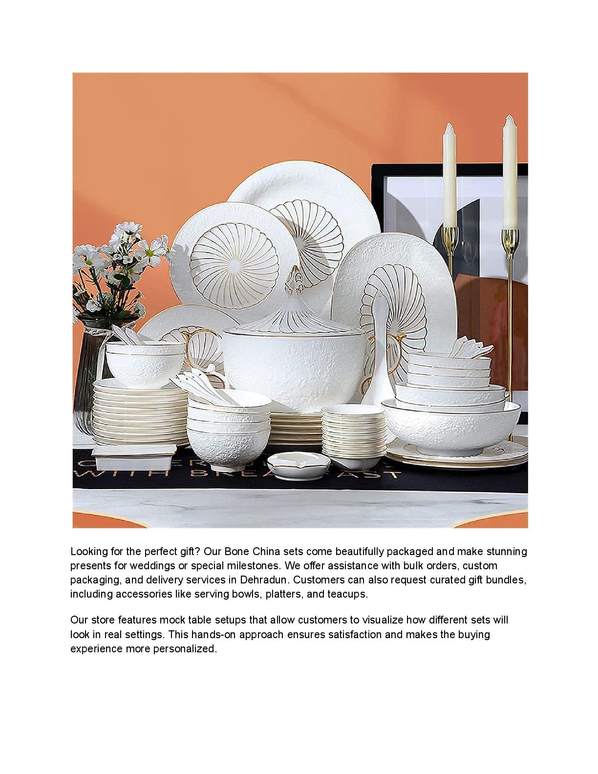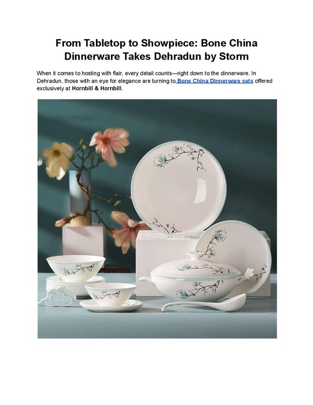strength. Its light, smooth finish makes it both a visual and tactile pleasure. Perfect for formal dinners or everyday refinement, Bone China resists chips, holds its shine, and complements all kinds of table décor. Hornbill & Hornbill has become Dehradun’s go-to destination for premium Bone China sets, offering collections that span minimal modern lines, intricate florals, and timeless gold trims. Whether you're outfitting a new home or adding a statement piece to your existing tableware, we have something for every style. We also offer seasonal collections and limited-edition designs that rotate throughout the year. These exclusive pieces are especially popular among collectors and those who love to refresh their table settings with the seasons.