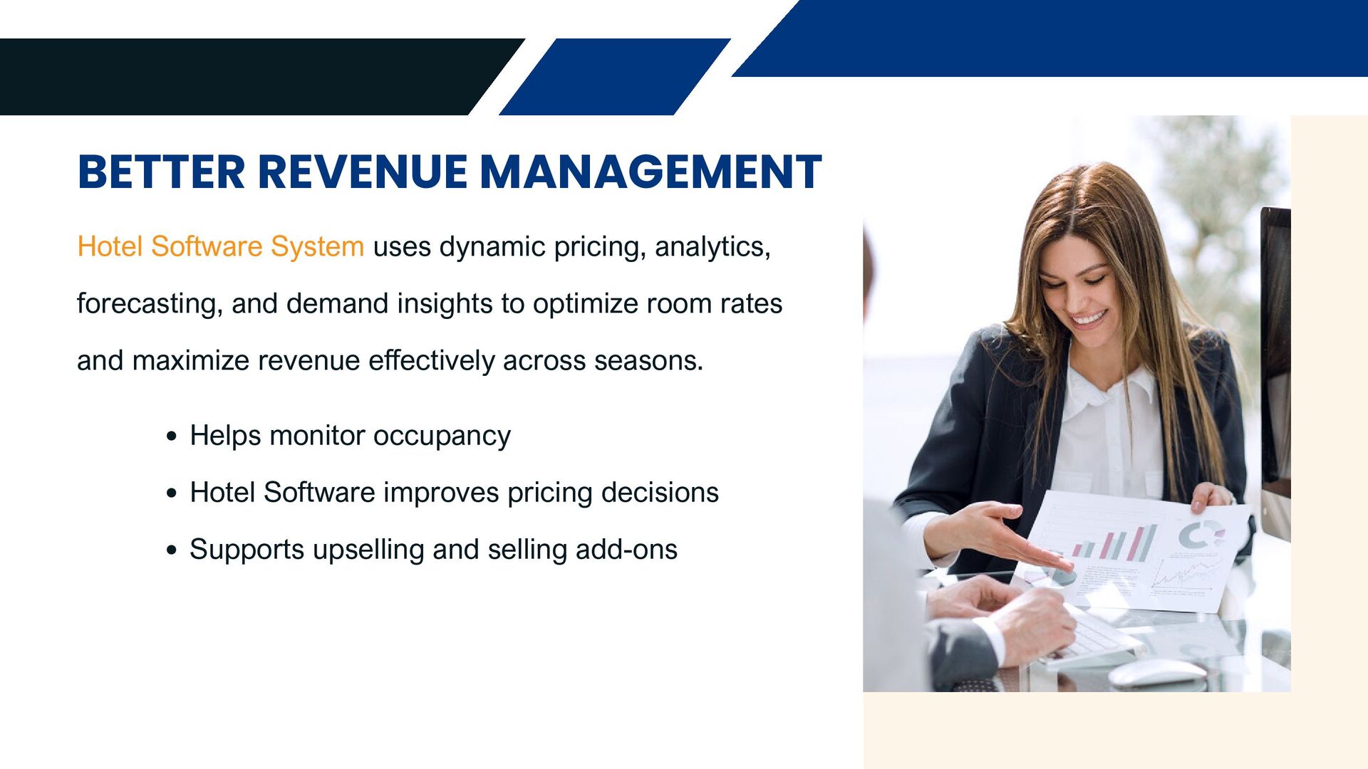 Hotel Management Software streamlines daily operations, improves staff efficiency, and enhances guest experiences. It centralizes reservations, billing, housekeeping, and reporting, reducing manual errors and saving time. With real-time insights and automated workflows, Hotel Management Software helps hotels boost productivity, increase profitability, and deliver seamless, high-quality service.