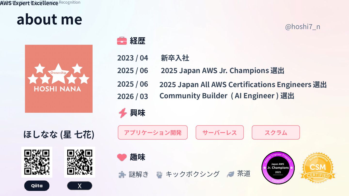 Expert Excellence All Certifications & Jr. Champion Recognition 謎解き キックボクシング 茶道 2023 / 04 2025 / 06 2025 / 06 新卒⼊社 2025 Japan AWS Jr. Champions 選出 2025 Japan All AWS Certifications Engineers 選出 2026 / 03 Community Builder ( AI Engineer ) 選出 X アプリケーション開発 サーバーレス スクラム