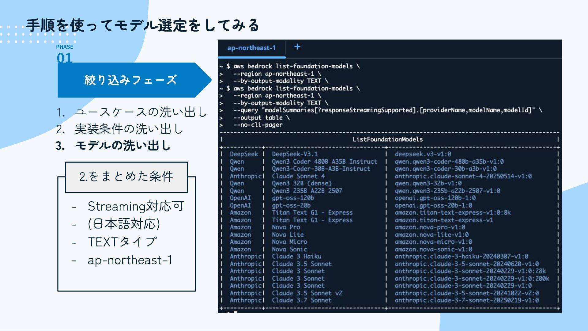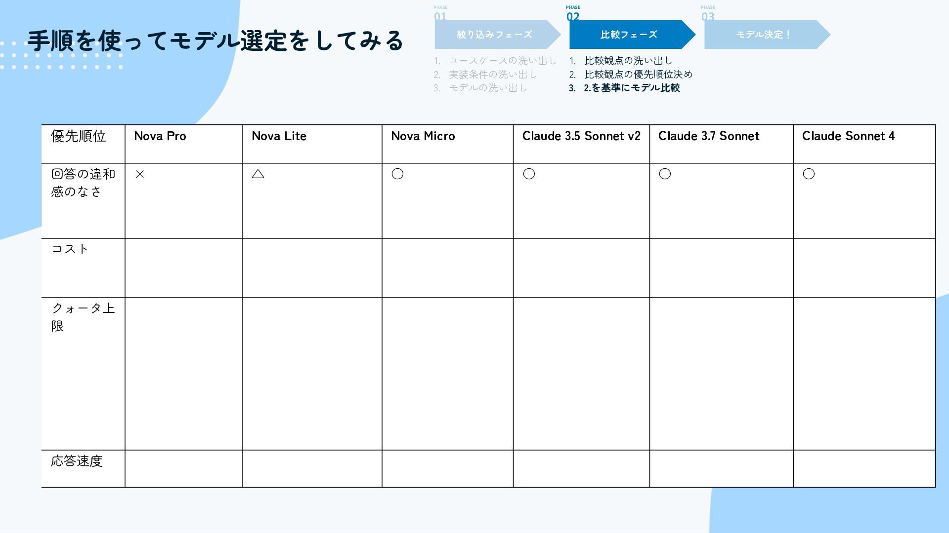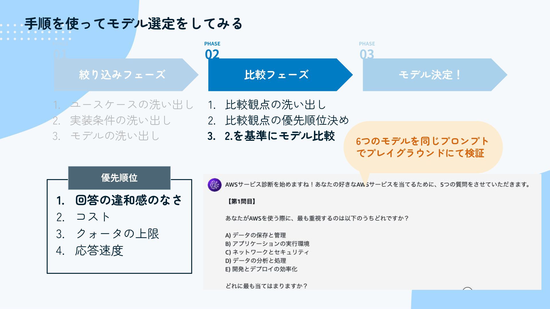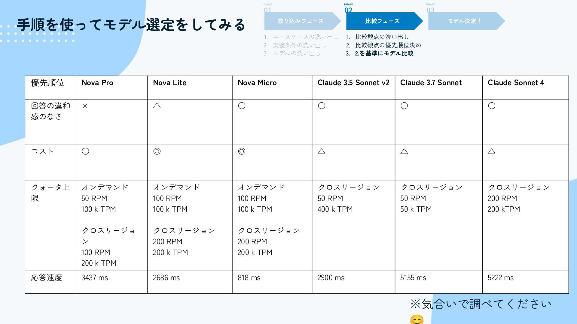 Sonnet v2 Claude 3.7 Sonnet Claude Sonnet 4 回答の違和 感のなさ × △ ◦ ◦ ◦ ◦ コスト ◦ ◎ ◎ △ △ △ クォータ上 限 オンデマンド 50 RPM 100 k TPM クロスリージョ ン 100 RPM 200 k TPM オンデマンド 100 RPM 100 k TPM クロスリージョン 200 RPM 200 k TPM オンデマンド 100 RPM 100 k TPM クロスリージョン 200 RPM 200 k TPM クロスリージョン 50 RPM 400 k TPM クロスリージョン 50 RPM 50 k TPM クロスリージョン 200 RPM 200 kTPM 応答速度 3437 ms 2686 ms 818 ms 2900 ms 5155 ms 5222 ms 絞り込みフェーズ 比較フェーズ PHASE 01 PHASE 02 1. ユースケースの洗い出し 2. 実装条件の洗い出し 3. モデルの洗い出し 1. 比較観点の洗い出し 2. 比較観点の優先順位決め 3. 2.を基準にモデル比較 モデル決定! PHASE 03 ※気合いで調べてください