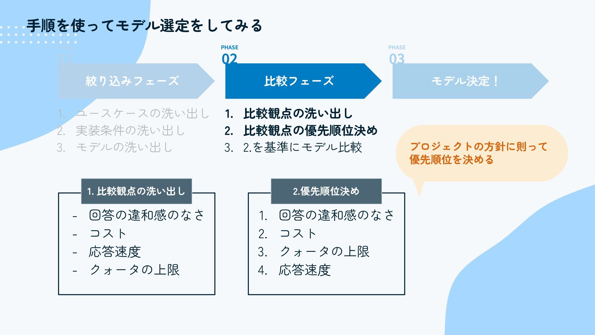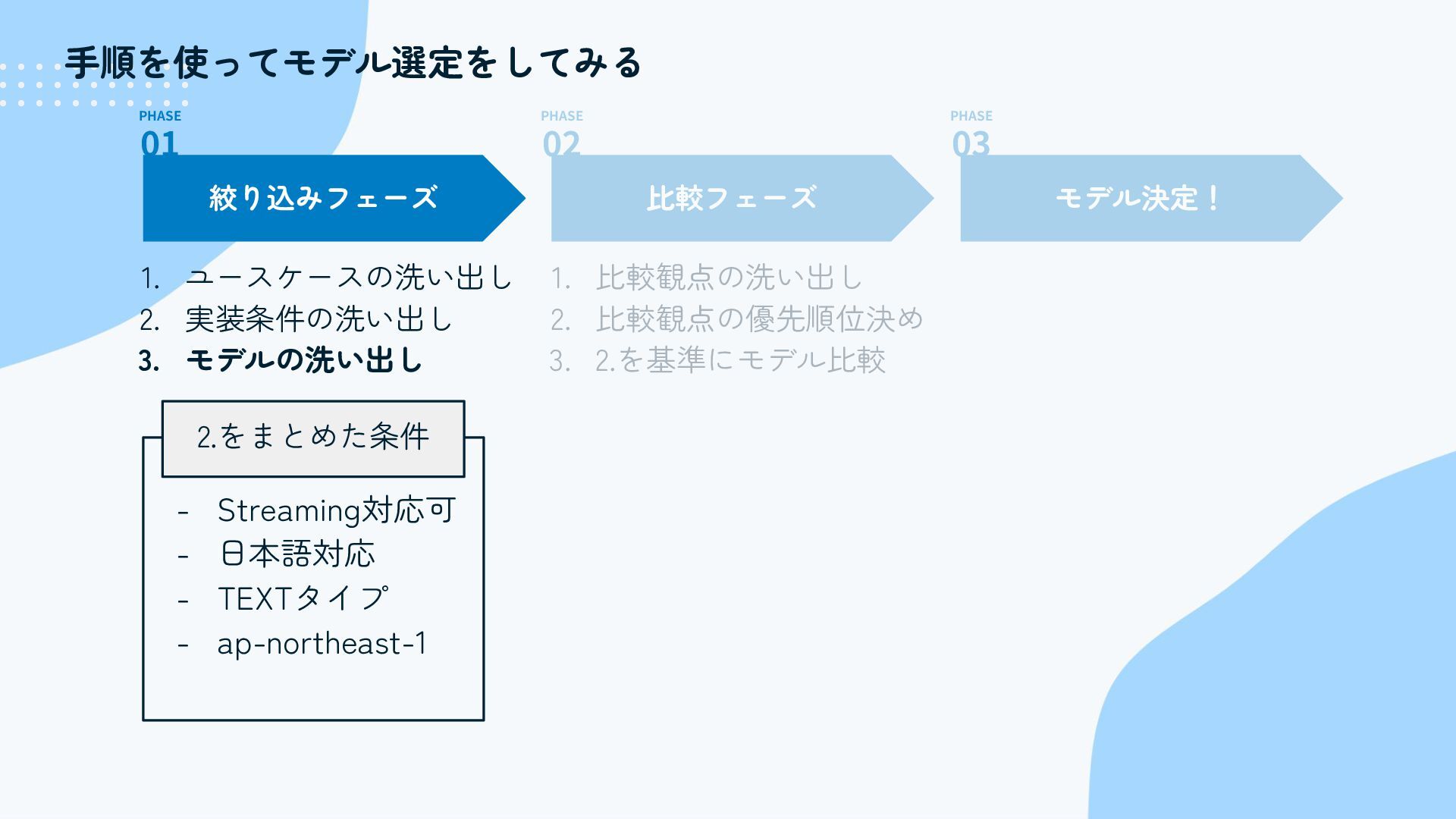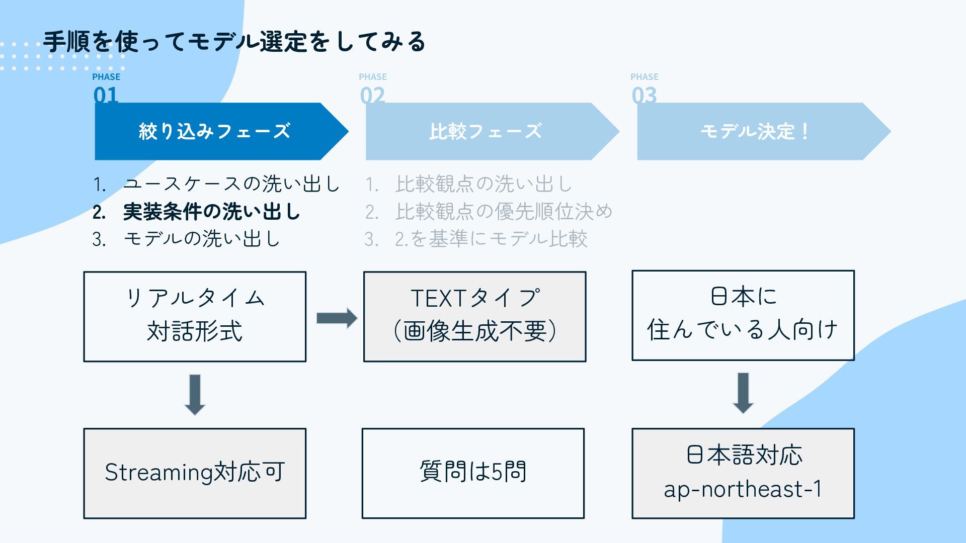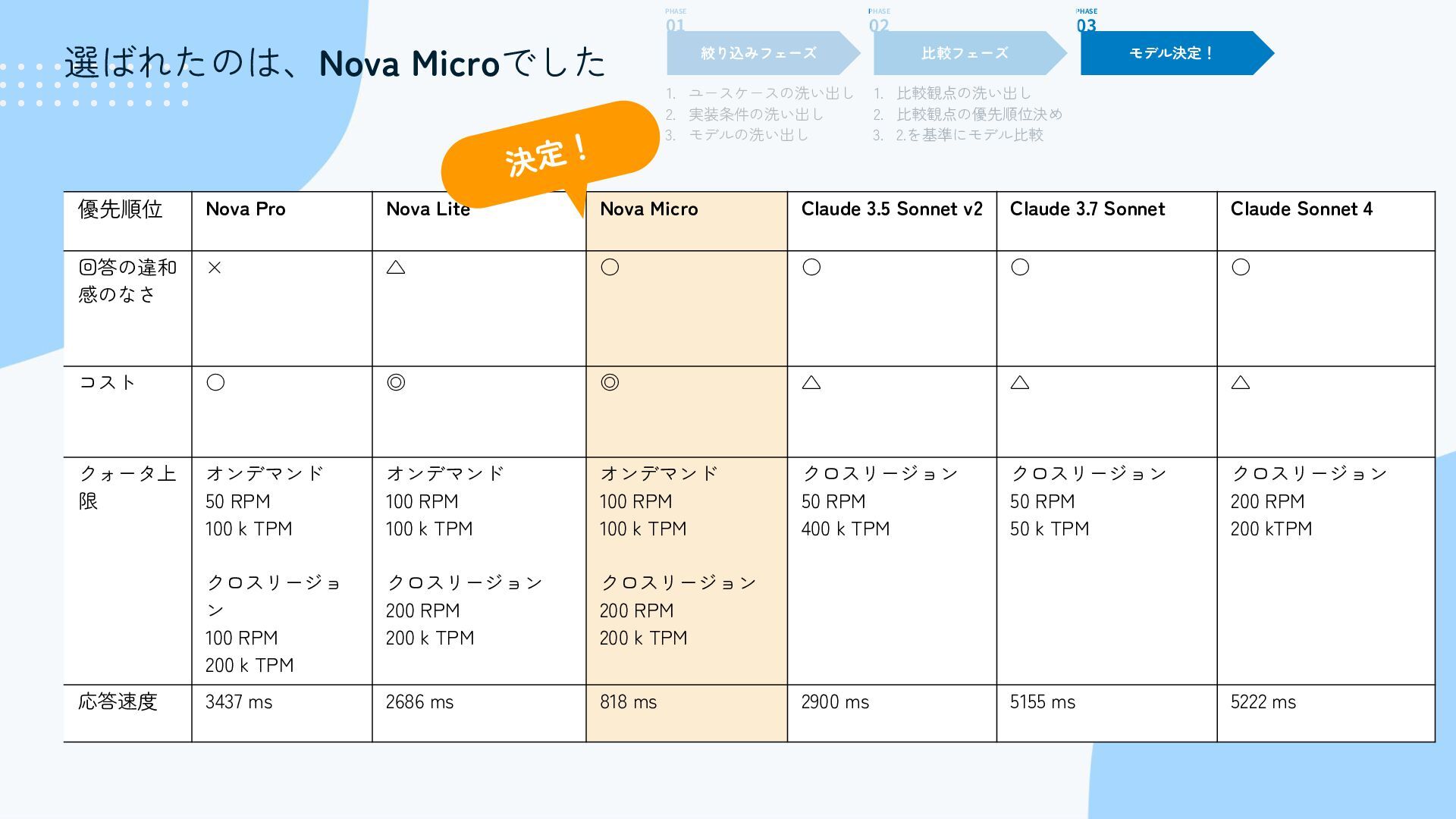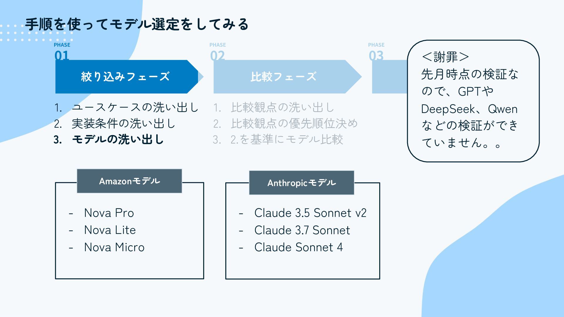 Sonnet v2 Claude 3.7 Sonnet Claude Sonnet 4 回答の違和 感のなさ × △ ◦ ◦ ◦ ◦ コスト ◦ ◎ ◎ △ △ △ クォータ上 限 オンデマンド 50 RPM 100 k TPM クロスリージョ ン 100 RPM 200 k TPM オンデマンド 100 RPM 100 k TPM クロスリージョン 200 RPM 200 k TPM オンデマンド 100 RPM 100 k TPM クロスリージョン 200 RPM 200 k TPM クロスリージョン 50 RPM 400 k TPM クロスリージョン 50 RPM 50 k TPM クロスリージョン 200 RPM 200 kTPM 応答速度 3437 ms 2686 ms 818 ms 2900 ms 5155 ms 5222 ms 絞り込みフェーズ 比較フェーズ PHASE 01 PHASE 02 1. ユースケースの洗い出し 2. 実装条件の洗い出し 3. モデルの洗い出し 1. 比較観点の洗い出し 2. 比較観点の優先順位決め 3. 2.を基準にモデル比較 モデル決定! PHASE 03 ※気合いで調べてください