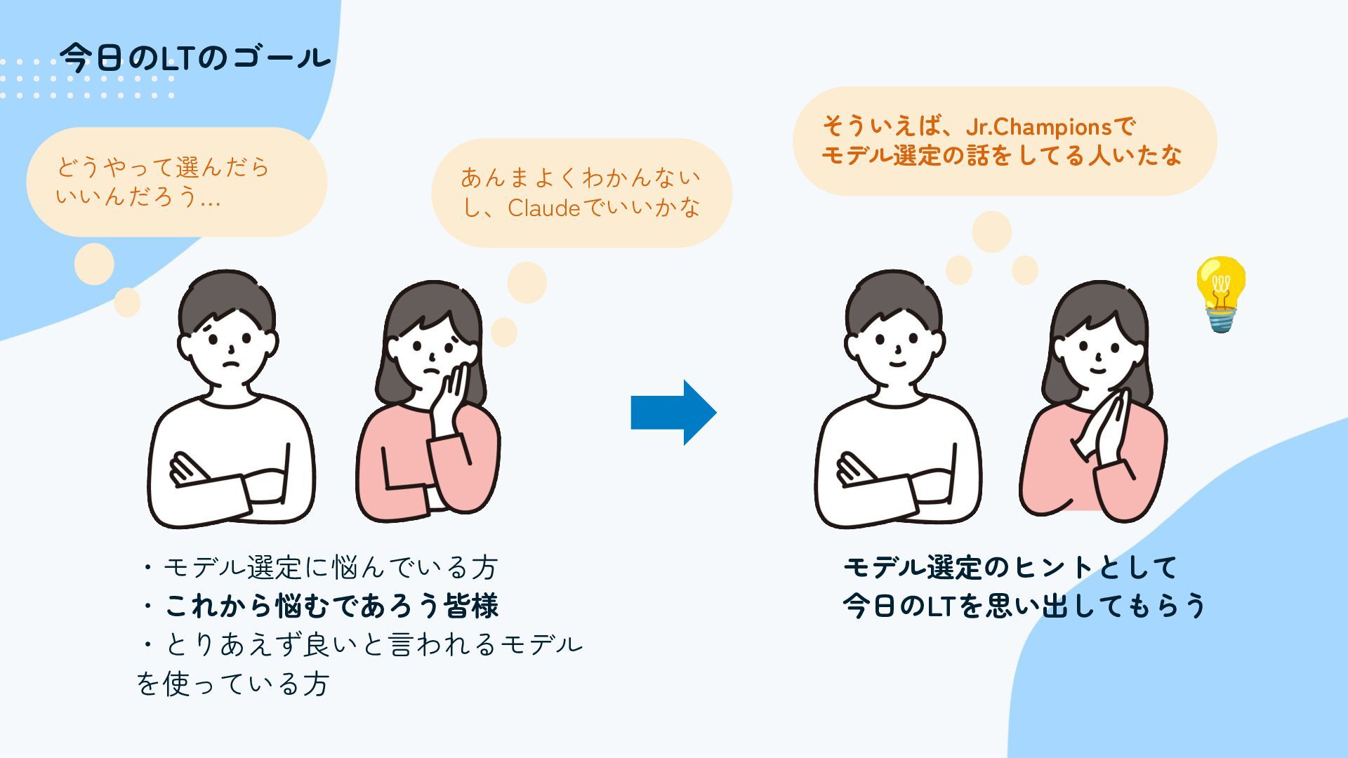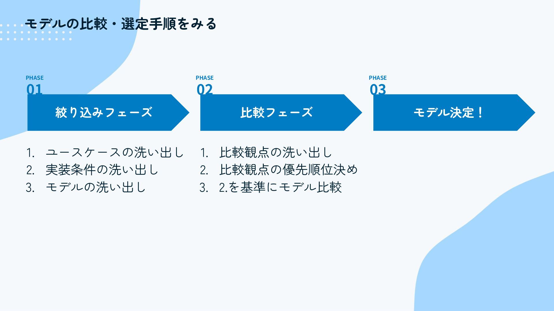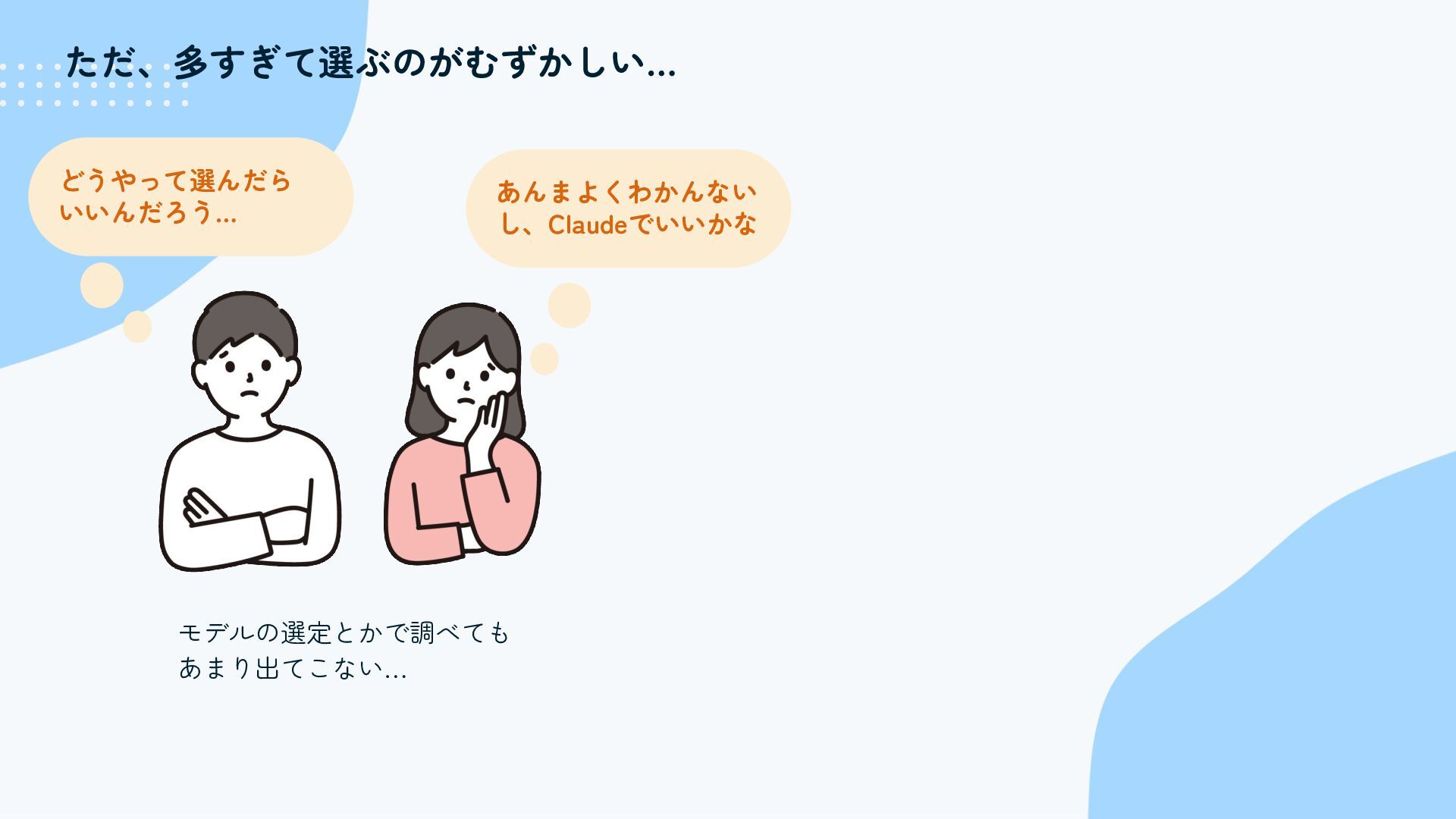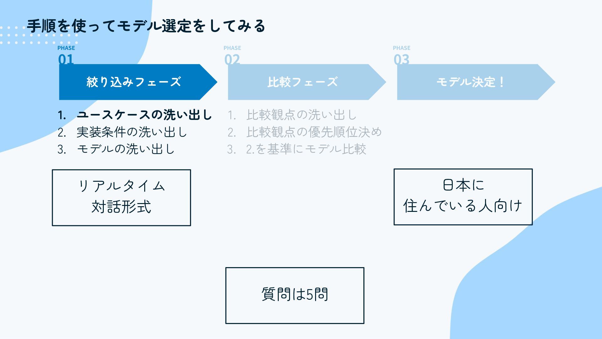 Sonnet v2 Claude 3.7 Sonnet Claude Sonnet 4 回答の違和 感のなさ × △ ◦ ◦ ◦ ◦ コスト ◦ ◎ ◎ △ △ △ クォータ上 限 オンデマンド 50 RPM 100 k TPM クロスリージョ ン 100 RPM 200 k TPM オンデマンド 100 RPM 100 k TPM クロスリージョン 200 RPM 200 k TPM オンデマンド 100 RPM 100 k TPM クロスリージョン 200 RPM 200 k TPM クロスリージョン 50 RPM 400 k TPM クロスリージョン 50 RPM 50 k TPM クロスリージョン 200 RPM 200 kTPM 応答速度 3437 ms 2686 ms 818 ms 2900 ms 5155 ms 5222 ms 絞り込みフェーズ 比較フェーズ PHASE 01 PHASE 02 1. ユースケースの洗い出し 2. 実装条件の洗い出し 3. モデルの洗い出し 1. 比較観点の洗い出し 2. 比較観点の優先順位決め 3. 2.を基準にモデル比較 モデル決定! PHASE 03 ※気合いで調べてください