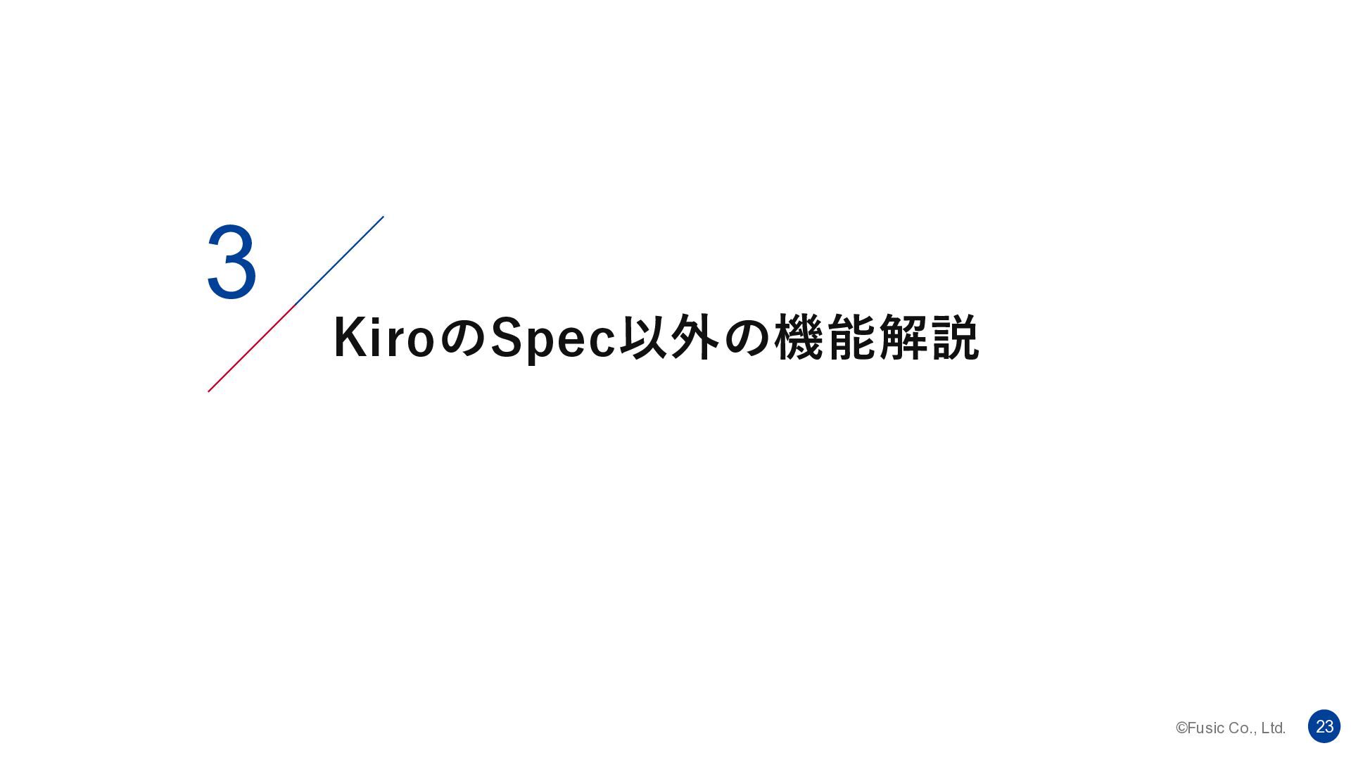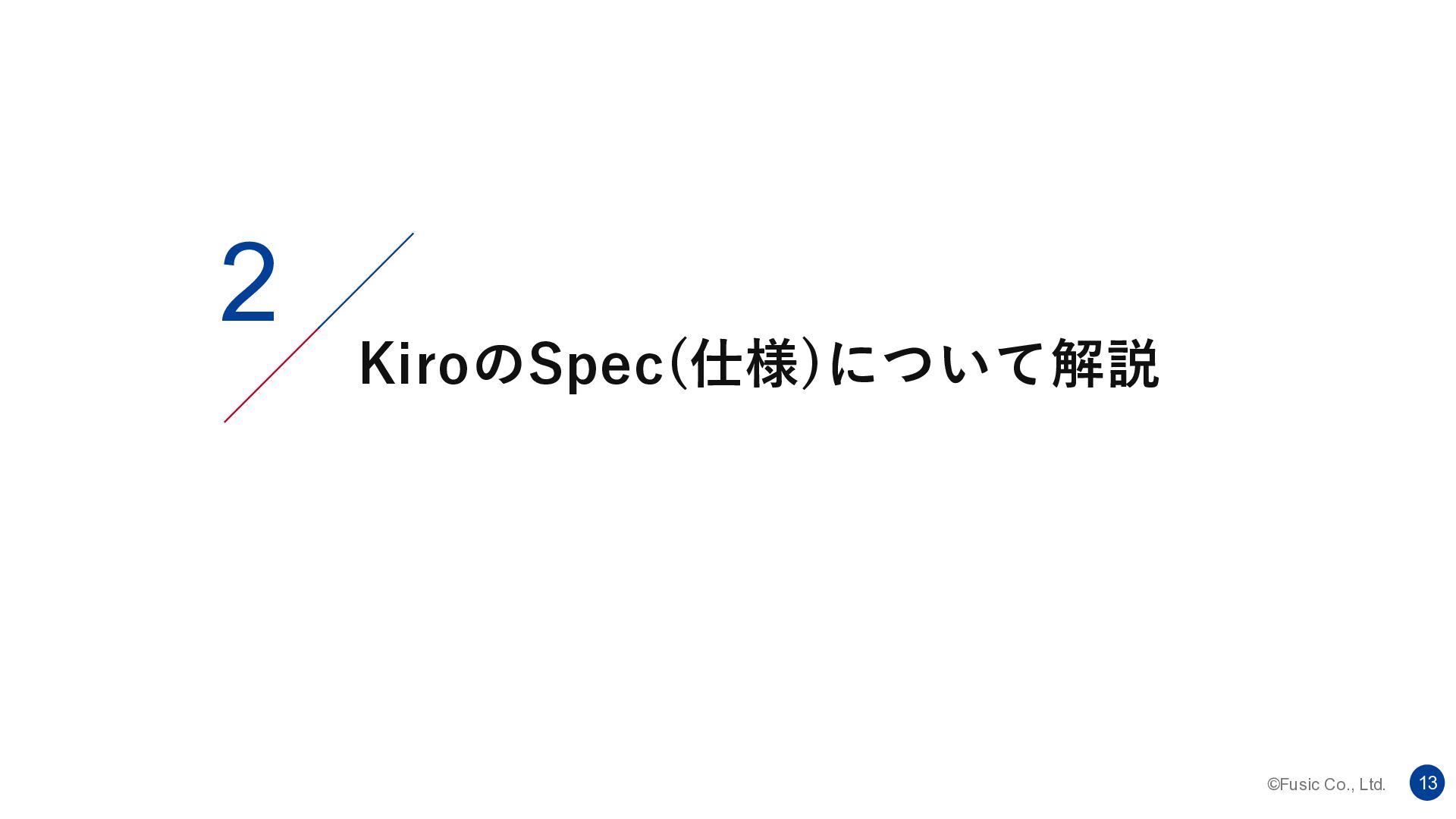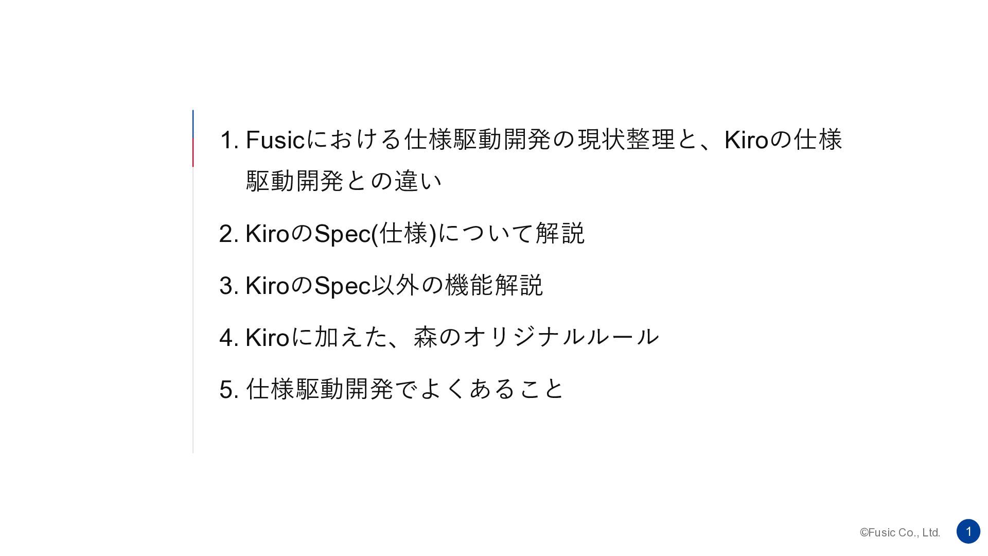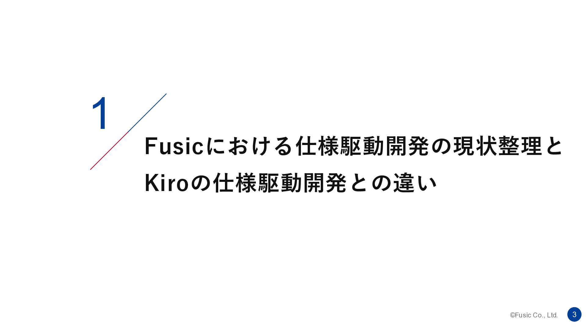 ©Fusic Co., Ltd. 1 1. Fusicにおける仕様駆動開発の現状整理と、Kiroの仕様 駆動開発との違い 2. KiroのSpec(仕様)について解説 3.