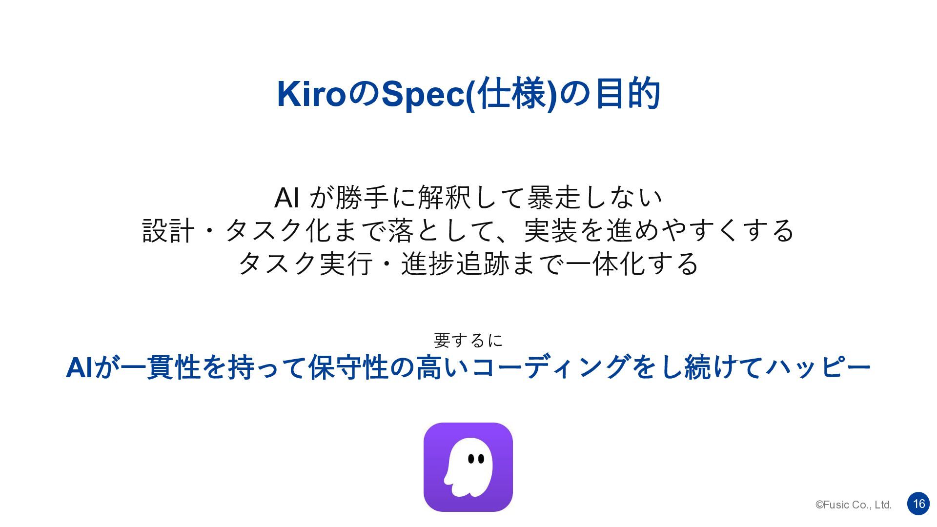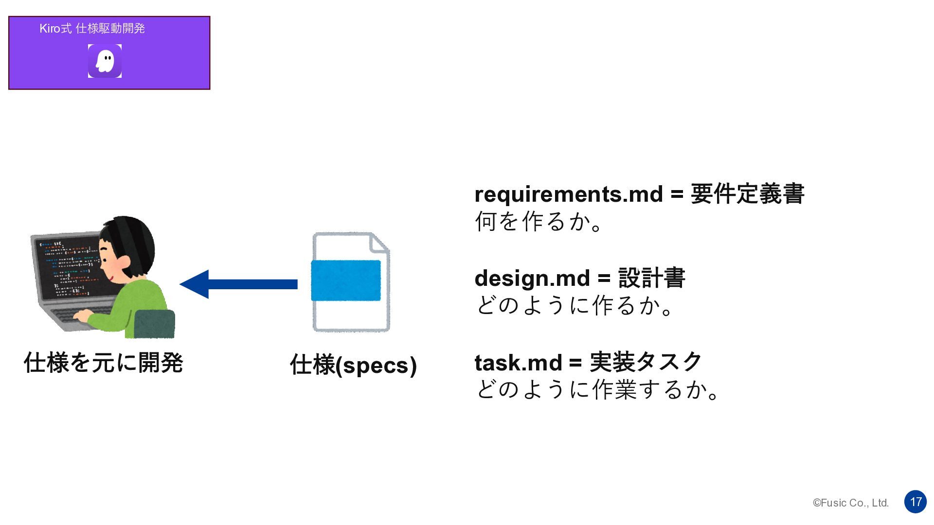 ©Fusic Co., Ltd. 16 要するに AIが一貫性を持って保守性の高いコーディングをし続けてハッピー AI が勝手に解釈して暴走しない 設計・タスク化まで落として、実装を進めやすくする タスク実行・進捗追跡まで一体化する