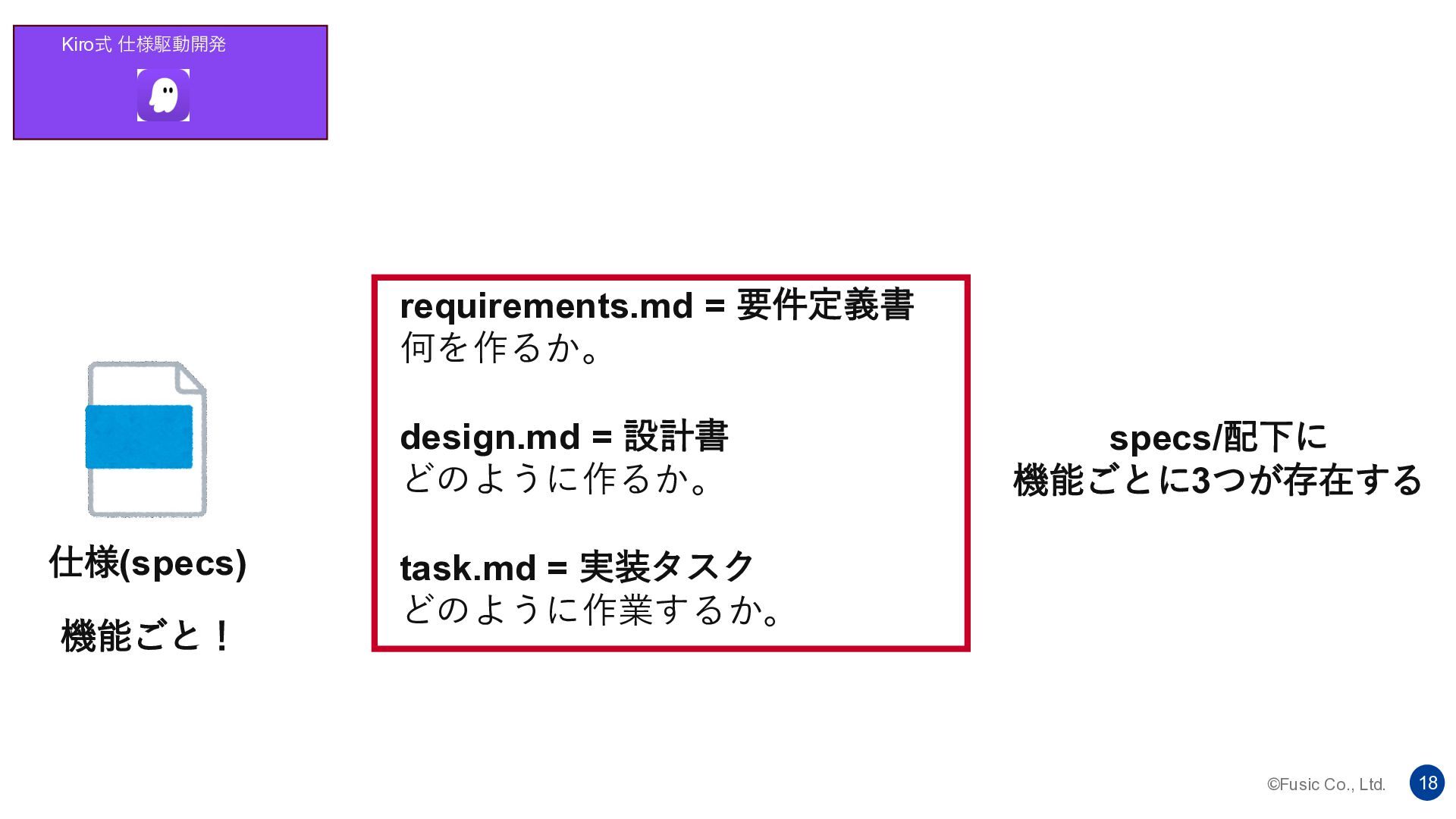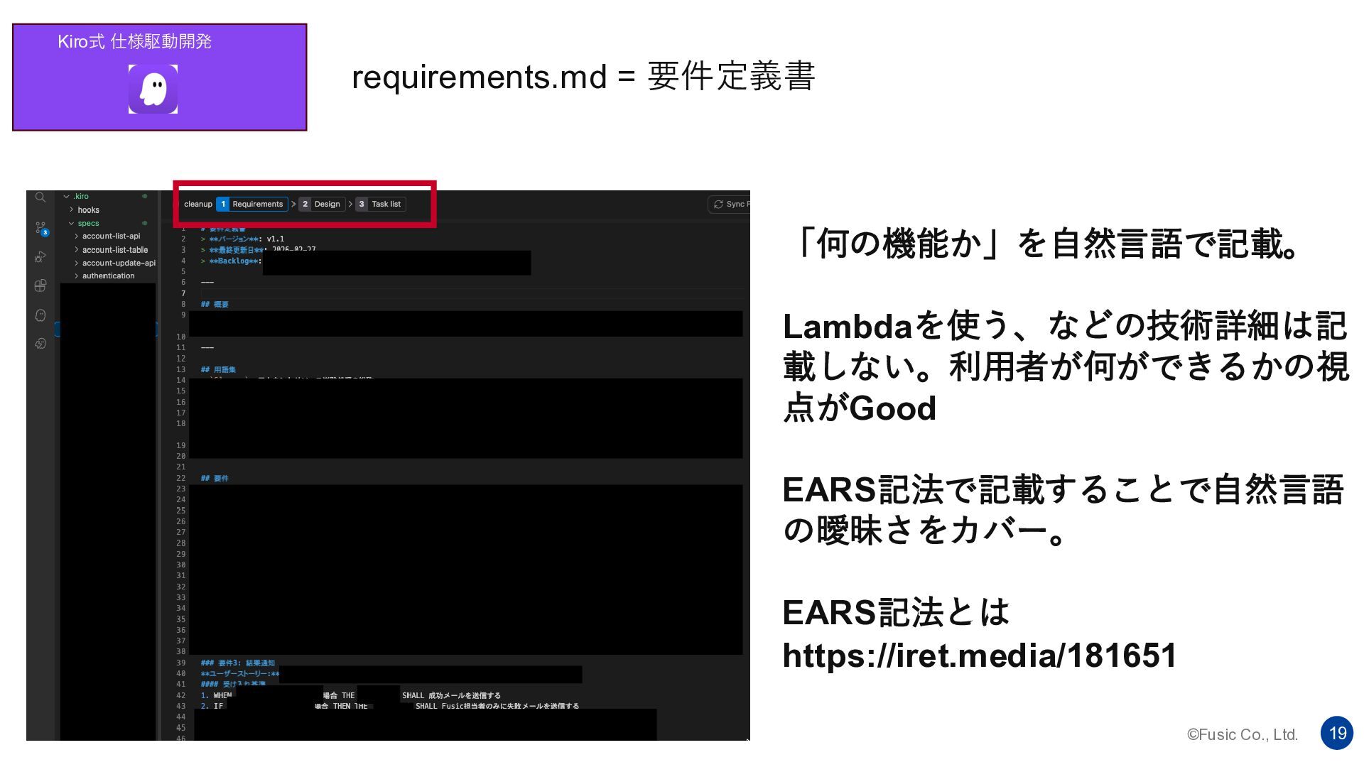 ©Fusic Co., Ltd. 18 仕様(specs) Kiro式 仕様駆動開発 specs/配下に 機能ごとに3つが存在する requirements.md