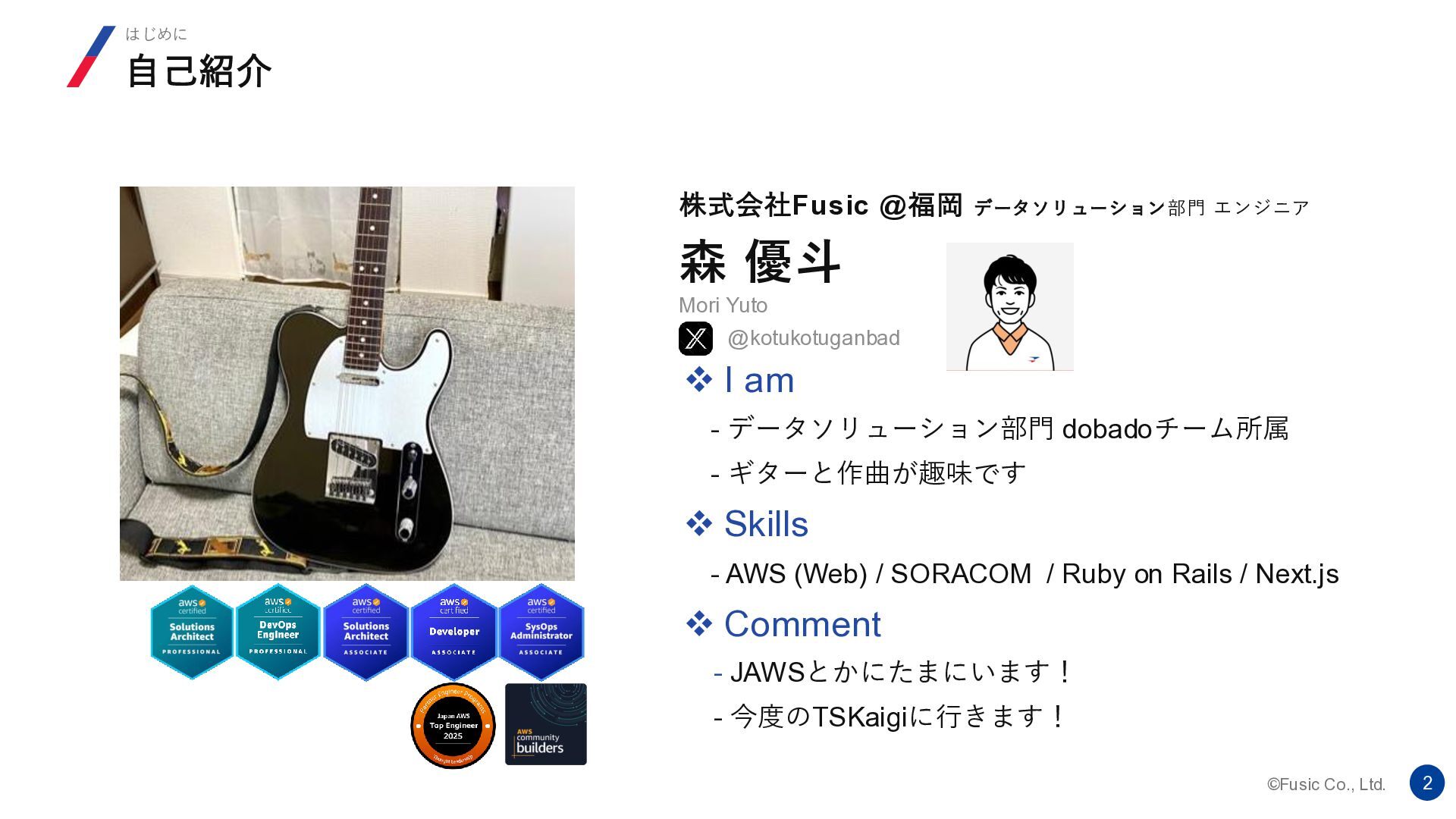 am - データソリューション部門 dobadoチーム所属 - ギターと作曲が趣味です ❖ Skills - AWS (Web) / SORACOM / Ruby on Rails / Next.js ❖ Comment - JAWSとかにたまにいます! - 今度のTSKaigiに行きます! 自己紹介 はじめに 株式会社Fusic @福岡 データソリューション部門 エンジニア @kotukotuganbad