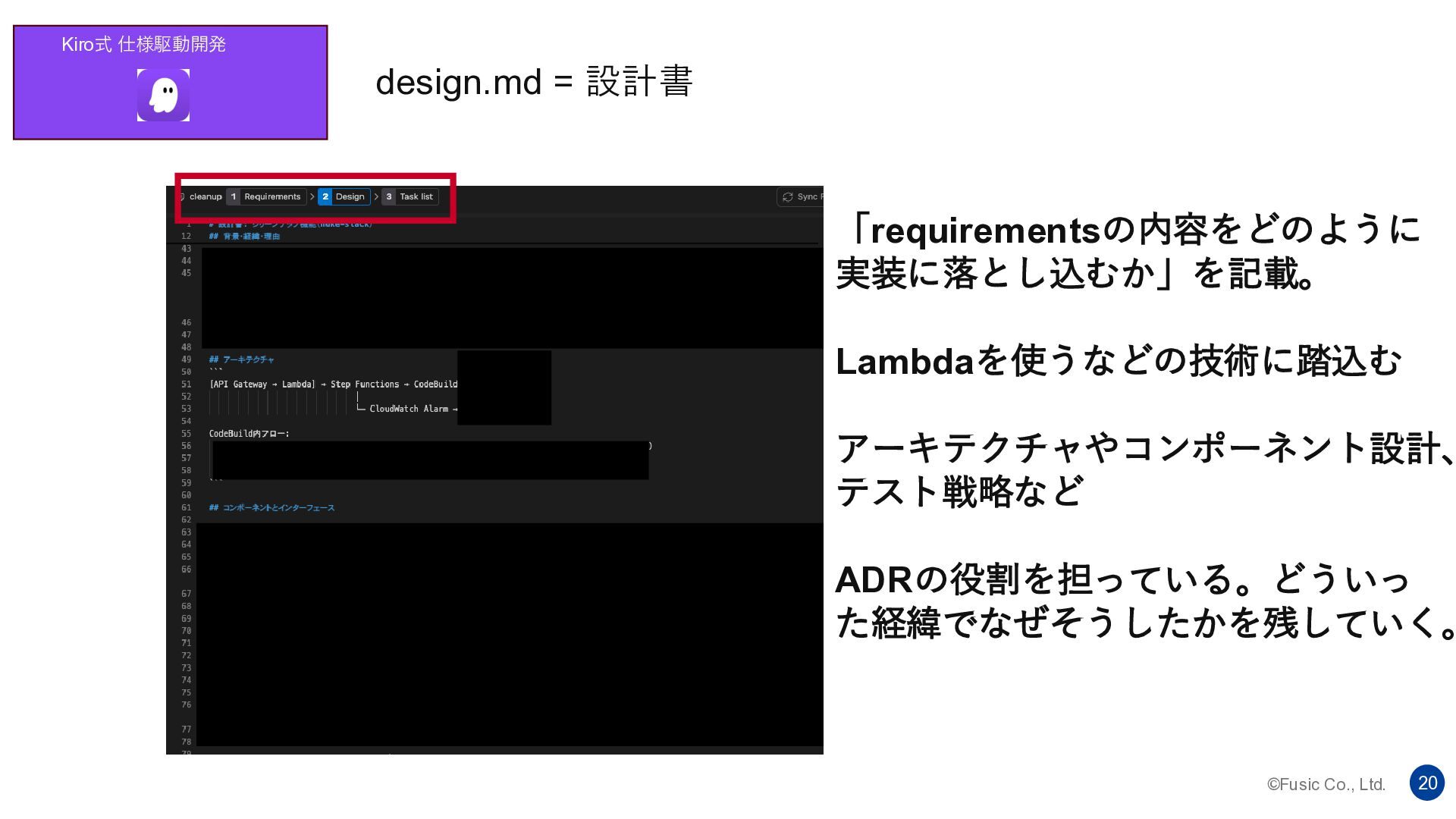 ©Fusic Co., Ltd. 20 Kiro式 仕様駆動開発 design.md = 設計書 「requirementsの内容をどのように