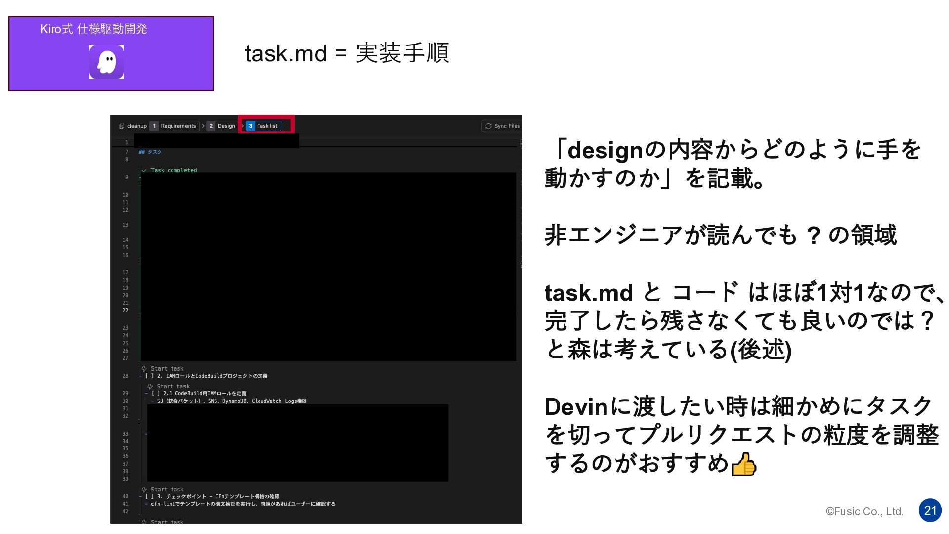©Fusic Co., Ltd. 21 Kiro式 仕様駆動開発 task.md = 実装手順 「designの内容からどのように手を