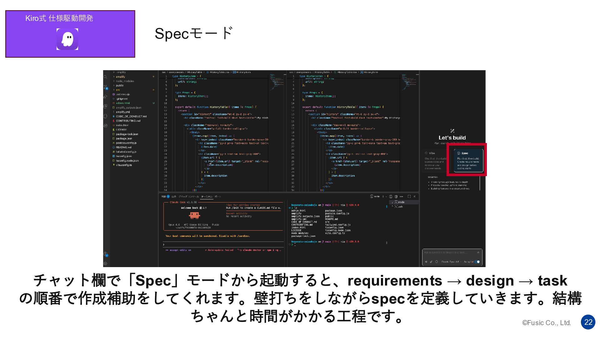 ©Fusic Co., Ltd. 22 Kiro式 仕様駆動開発 Specモード チャット欄で「Spec」モードから起動すると、requirements → design