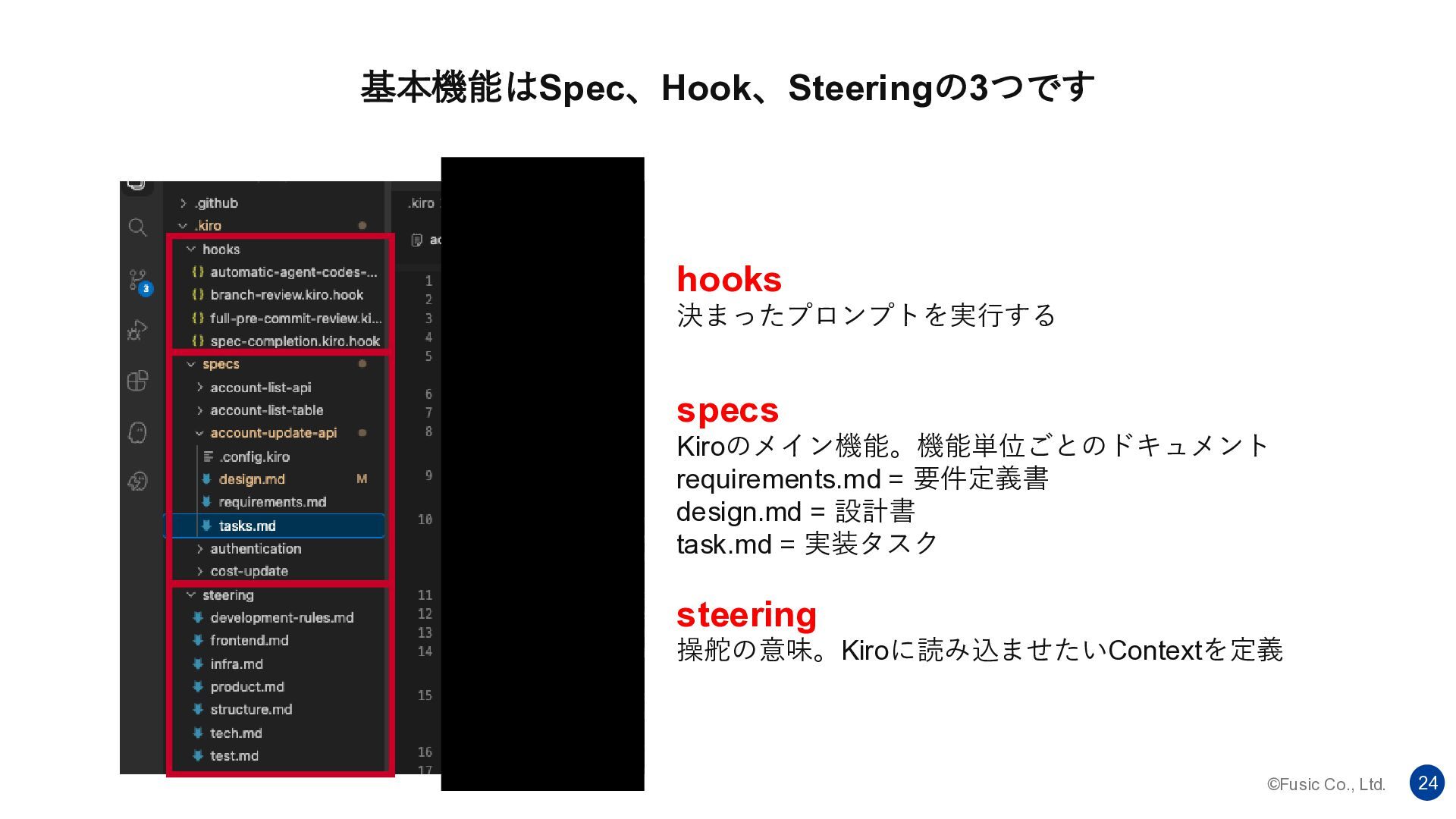 ©Fusic Co., Ltd. 24 hooks 決まったプロンプトを実行する specs Kiroのメイン機能。機能単位ごとのドキュメント requirements.md =