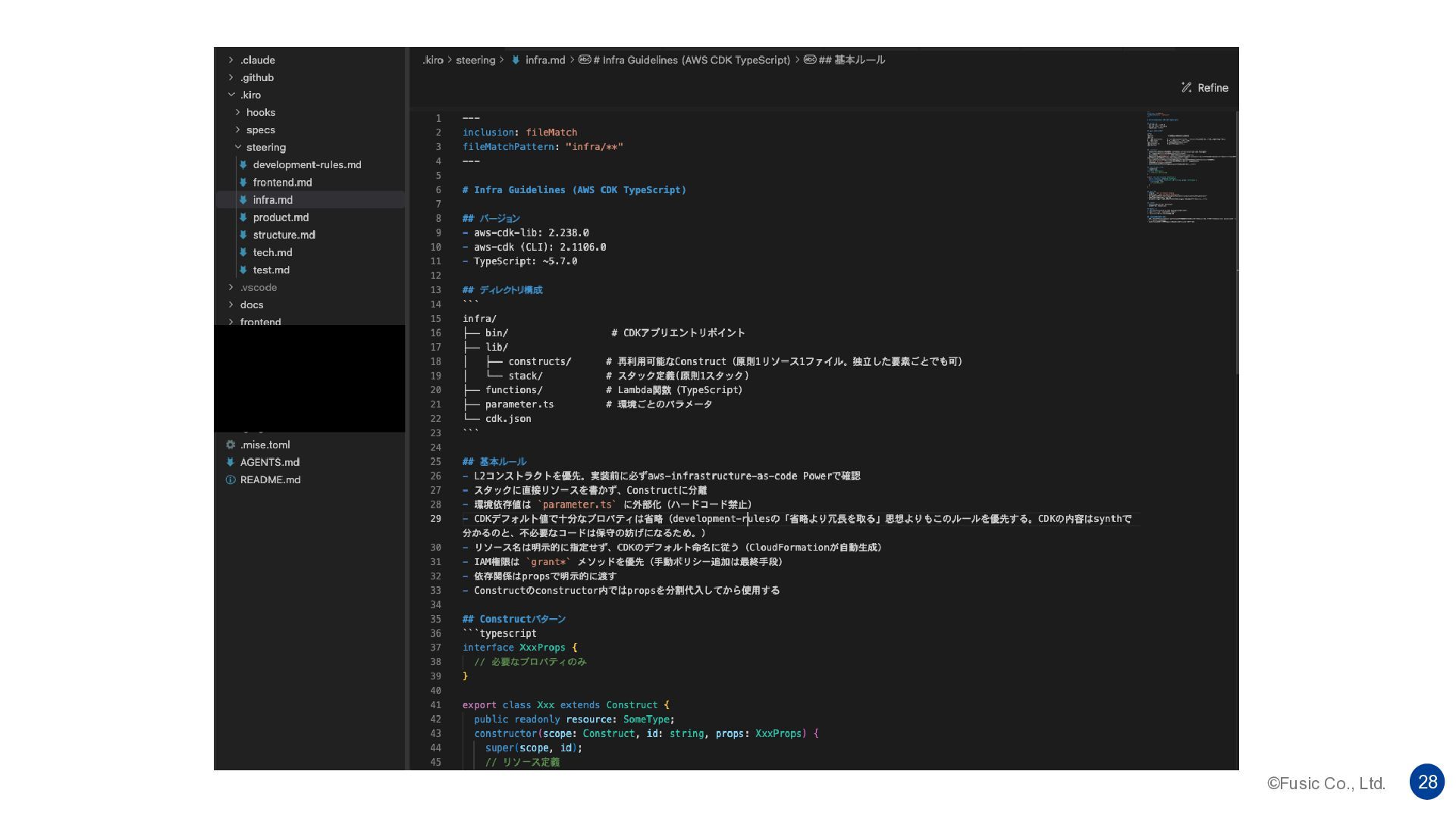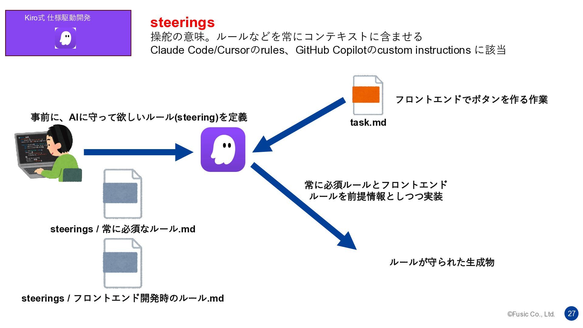 ©Fusic Co., Ltd. 27 Kiro式 仕様駆動開発 steerings 操舵の意味。ルールなどを常にコンテキストに含ませる Claude Code/Cursorのrules、GitHub