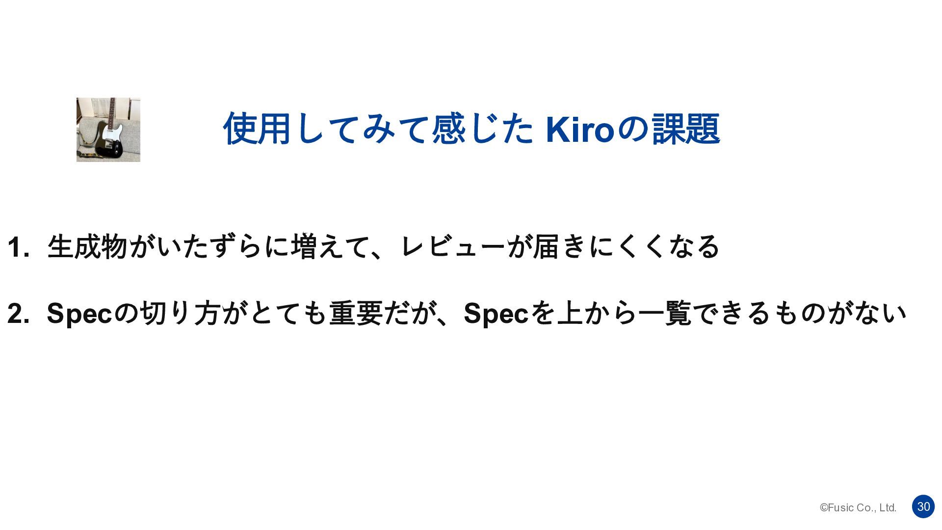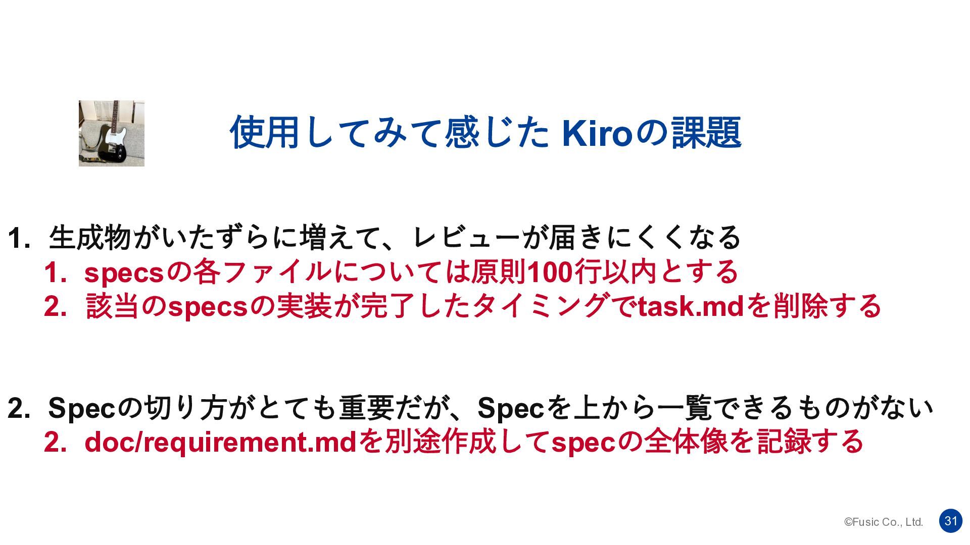 ©Fusic Co., Ltd. 30 使用してみて感じた Kiroの課題 1. 生成物がいたずらに増えて、レビューが届きにくくなる 2. Specの切り方がとても重要だが、Specを上から一覧できるものがない