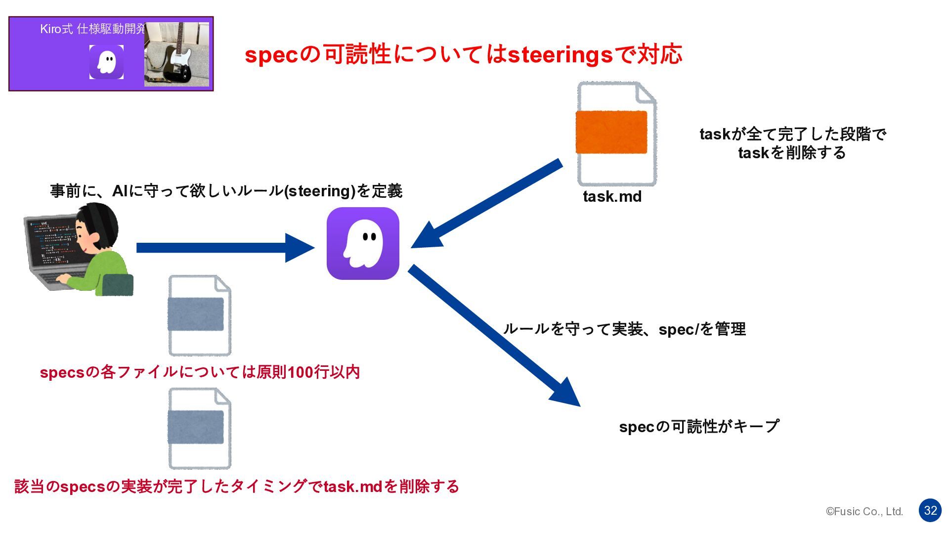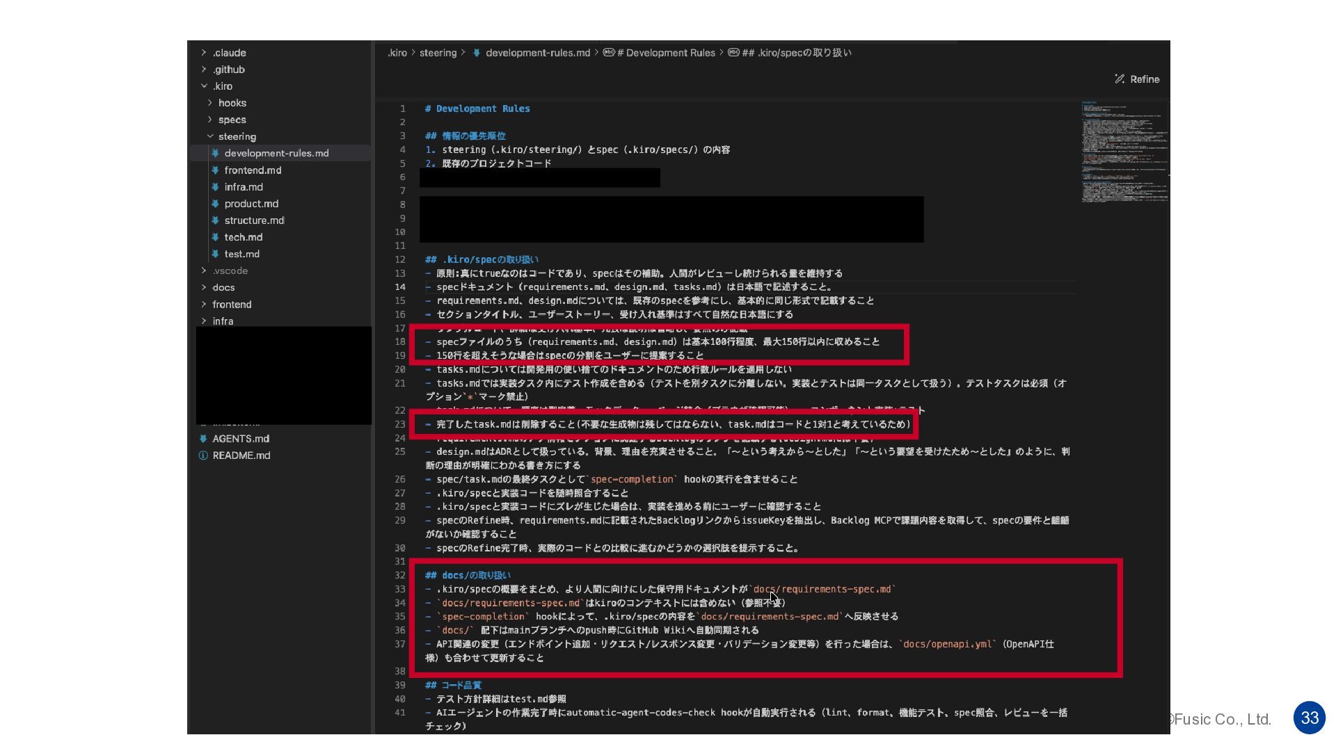 ©Fusic Co., Ltd. 32 Kiro式 仕様駆動開発 specの可読性についてはsteeringsで対応 specsの各ファイルについては原則100行以内 事前に、AIに守って欲しいルール(steering)を定義 該当のspecsの実装が完了したタイミングでtask.mdを削除する