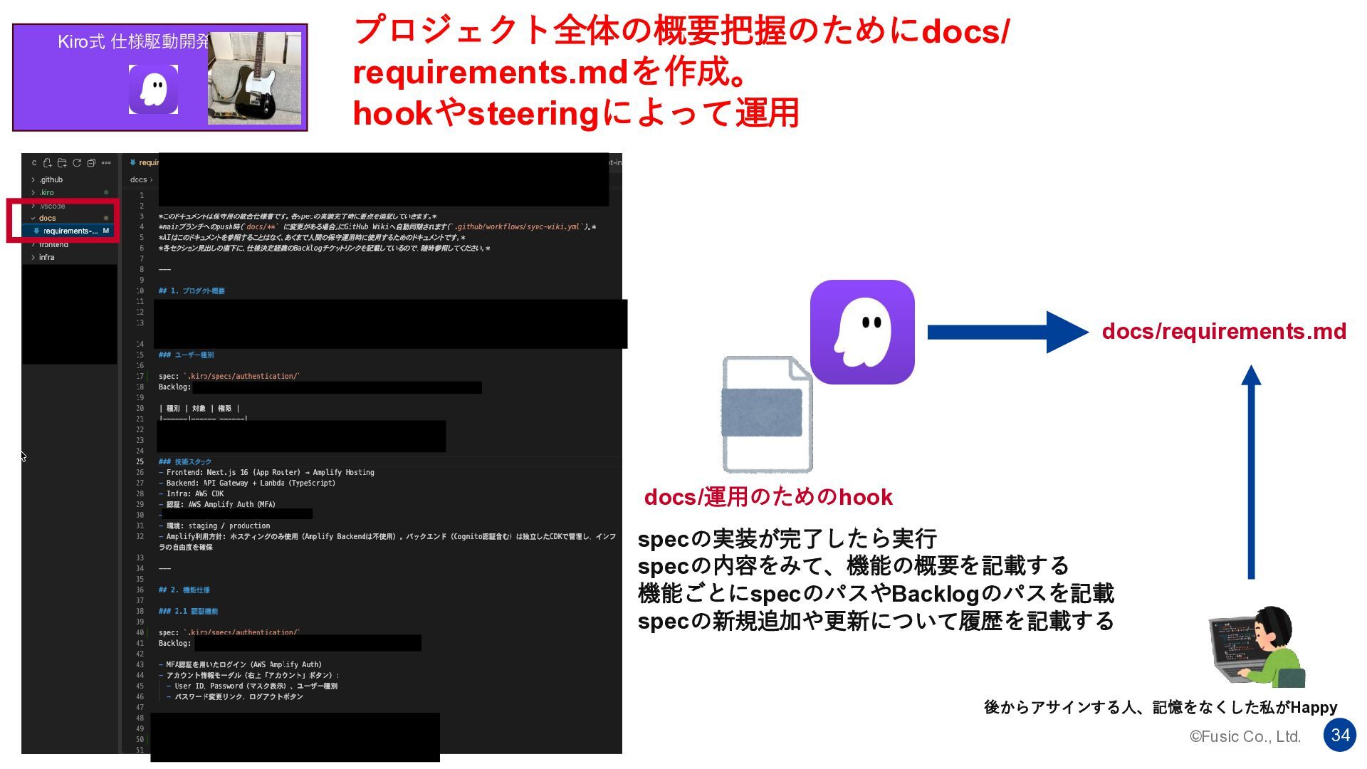 ©Fusic Co., Ltd. 34 Kiro式 仕様駆動開発 プロジェクト全体の概要把握のためにdocs/ requirements.mdを作成。 hookやsteeringによって運用 docs/運用のためのhook
