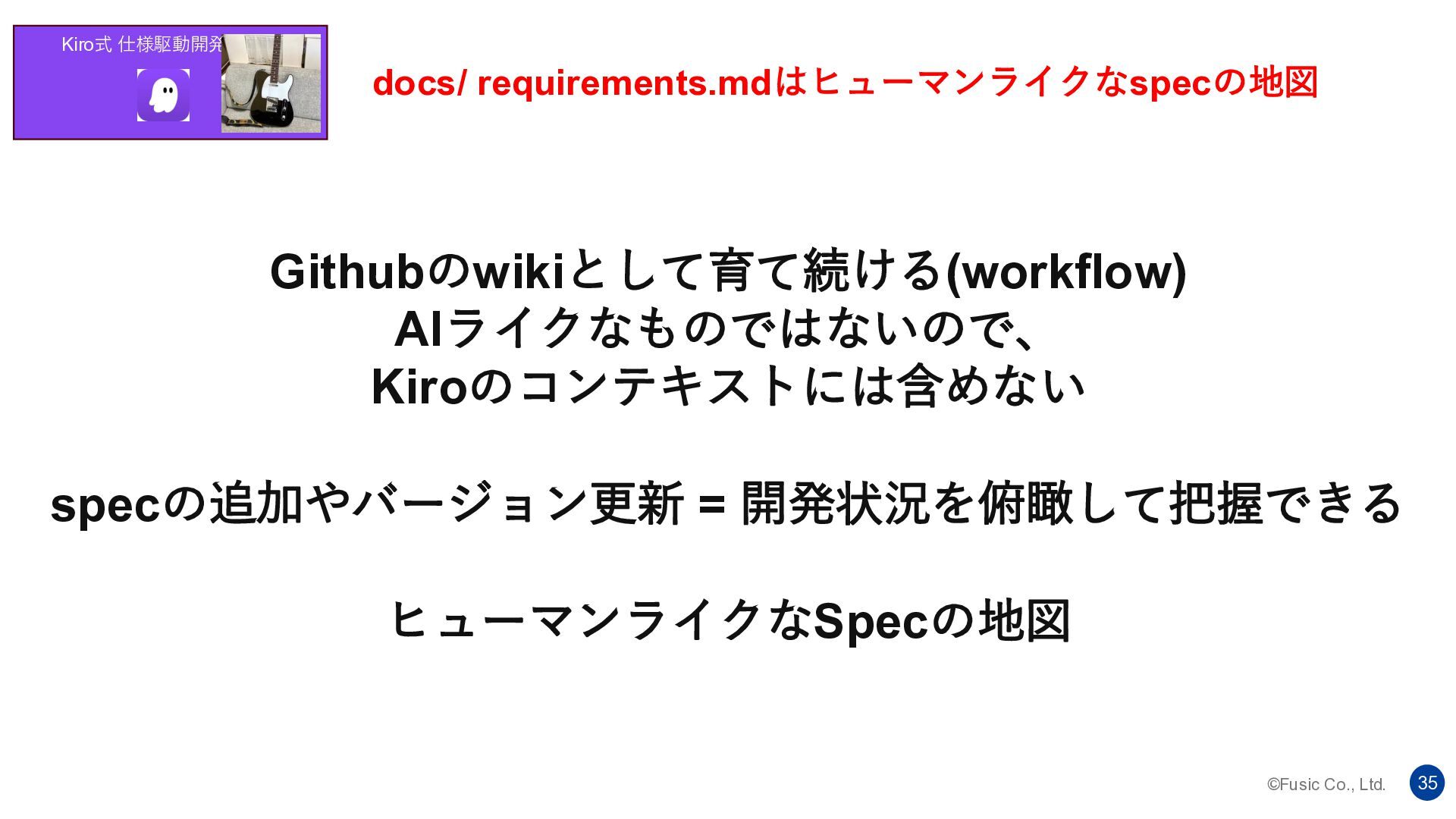 ©Fusic Co., Ltd. 35 Kiro式 仕様駆動開発 docs/ requirements.mdはヒューマンライクなspecの地図 Githubのwikiとして育て続ける(workflow) AIライクなものではないので、