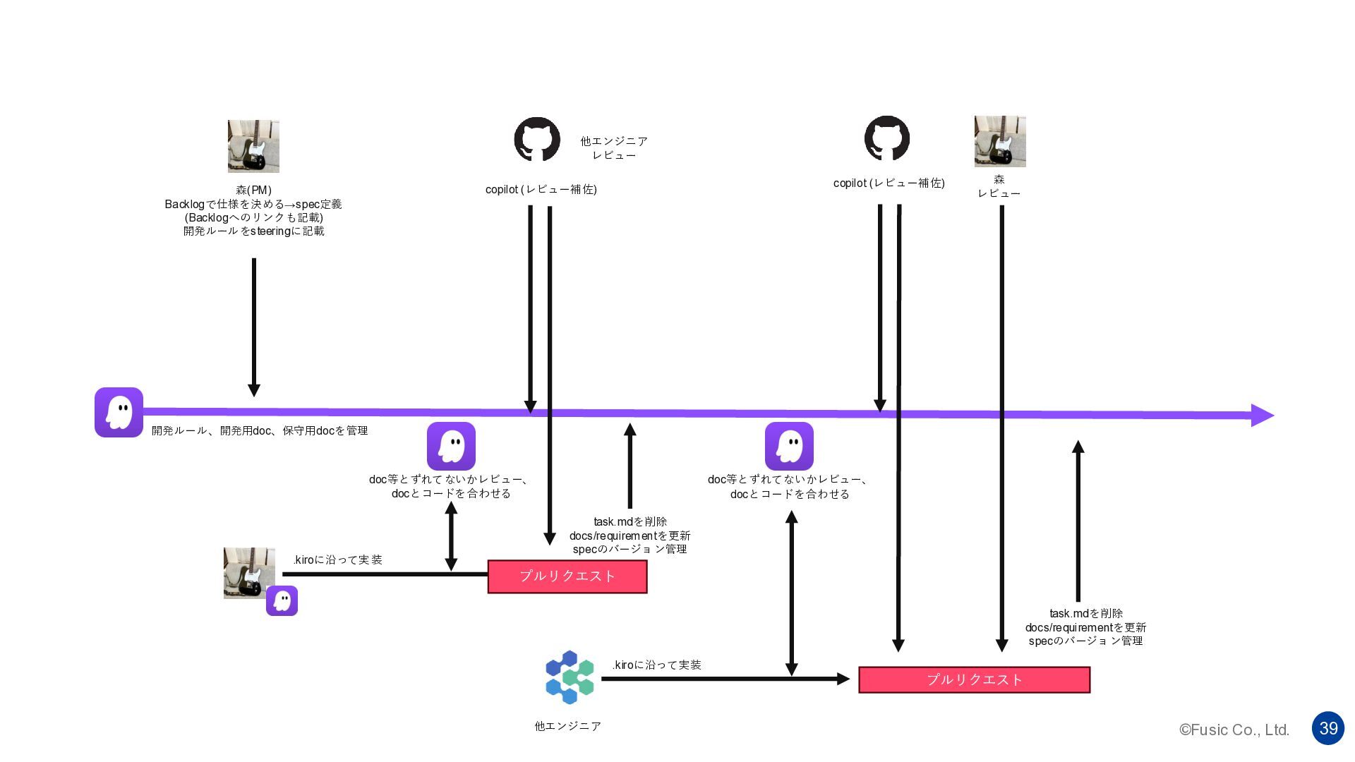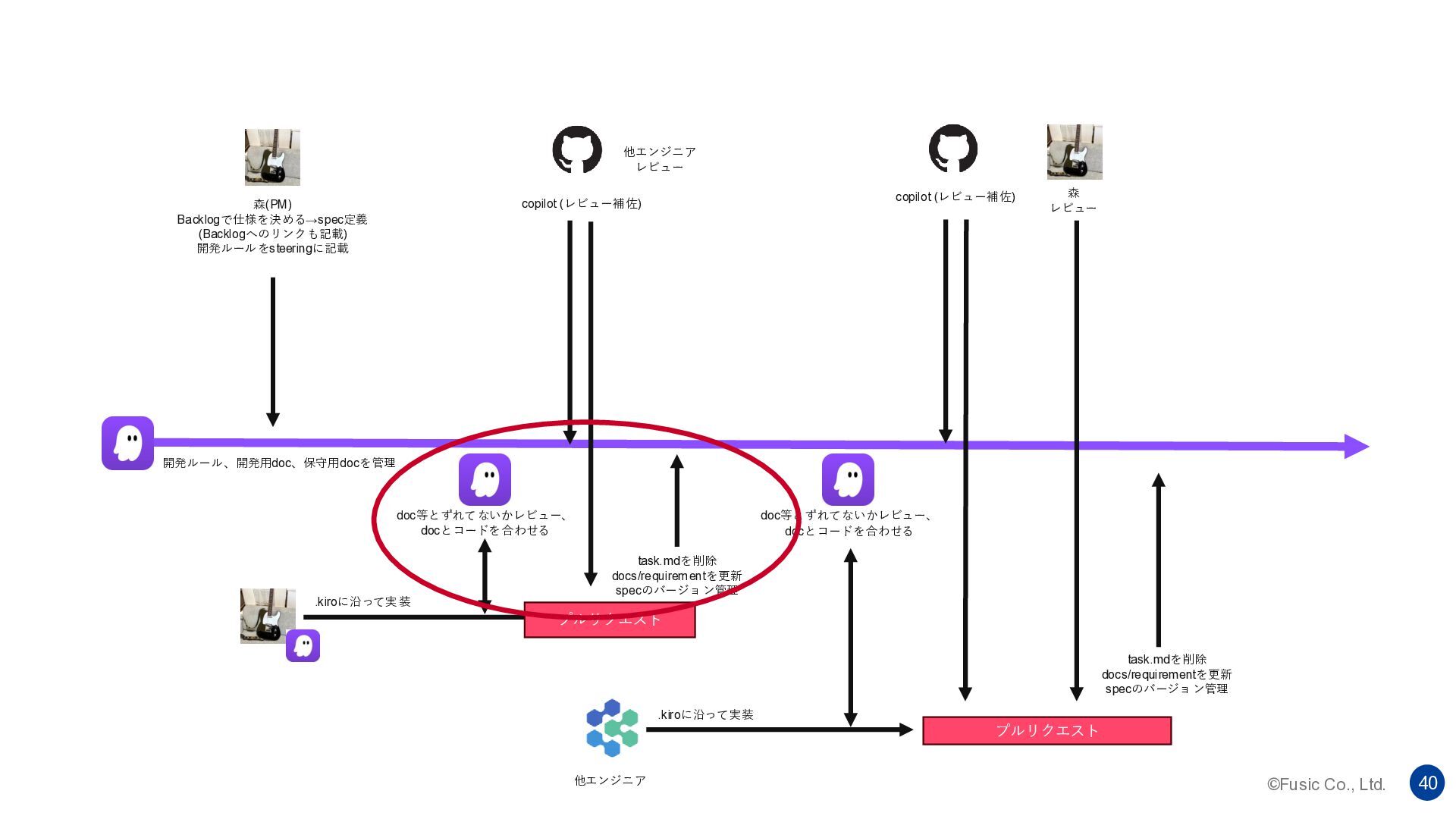 ©Fusic Co., Ltd. 39 開発ルール、開発用doc、保守用docを管理 森(PM) Backlogで仕様を決める→spec定義 (Backlogへのリンクも記載) 開発ルールをsteeringに記載 copilot