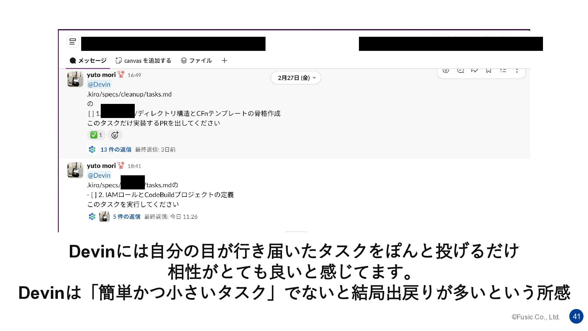 ©Fusic Co., Ltd. 41 Devinには自分の目が行き届いたタスクをぽんと投げるだけ 相性がとても良いと感じてます。 Devinは「簡単かつ小さいタスク」でないと結局出戻りが多いという所感