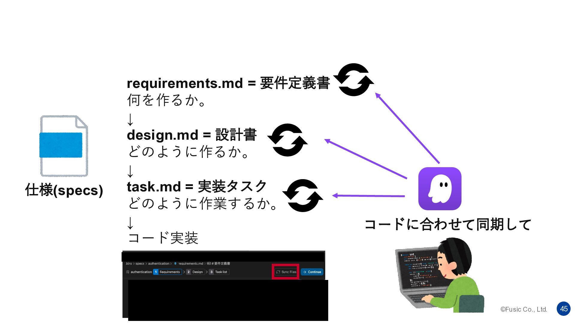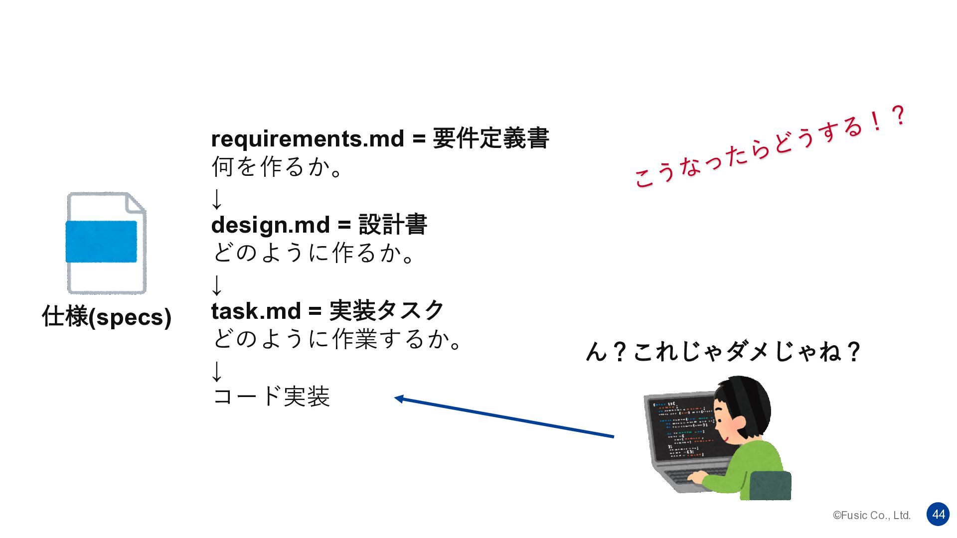 ©Fusic Co., Ltd. 44 ん?これじゃダメじゃね? 仕様(specs) requirements.md = 要件定義書 何を作るか。