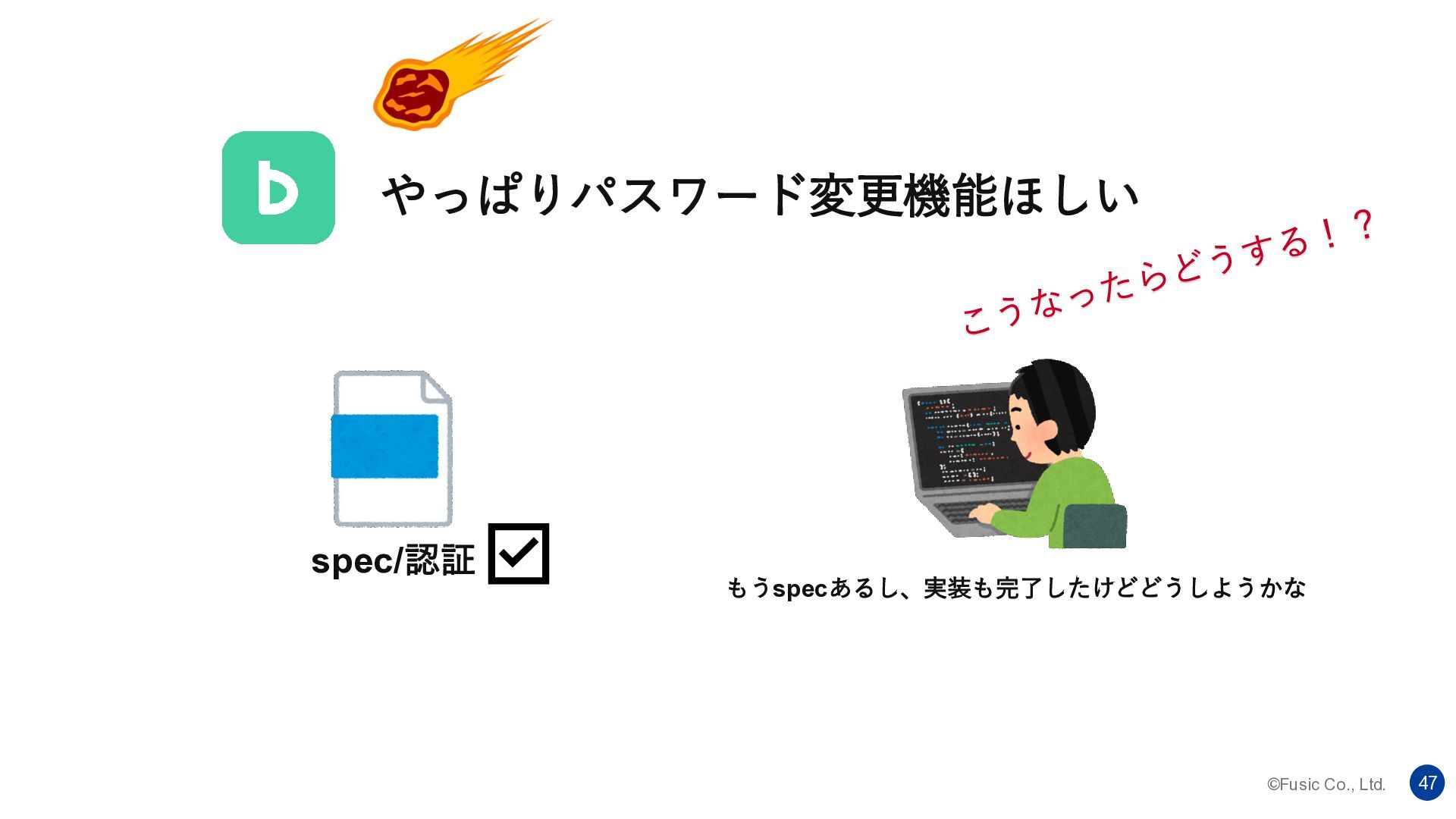 ©Fusic Co., Ltd. 47 spec/認証 もうspecあるし、実装も完了したけどどうしようかな やっぱりパスワード変更機能ほしい