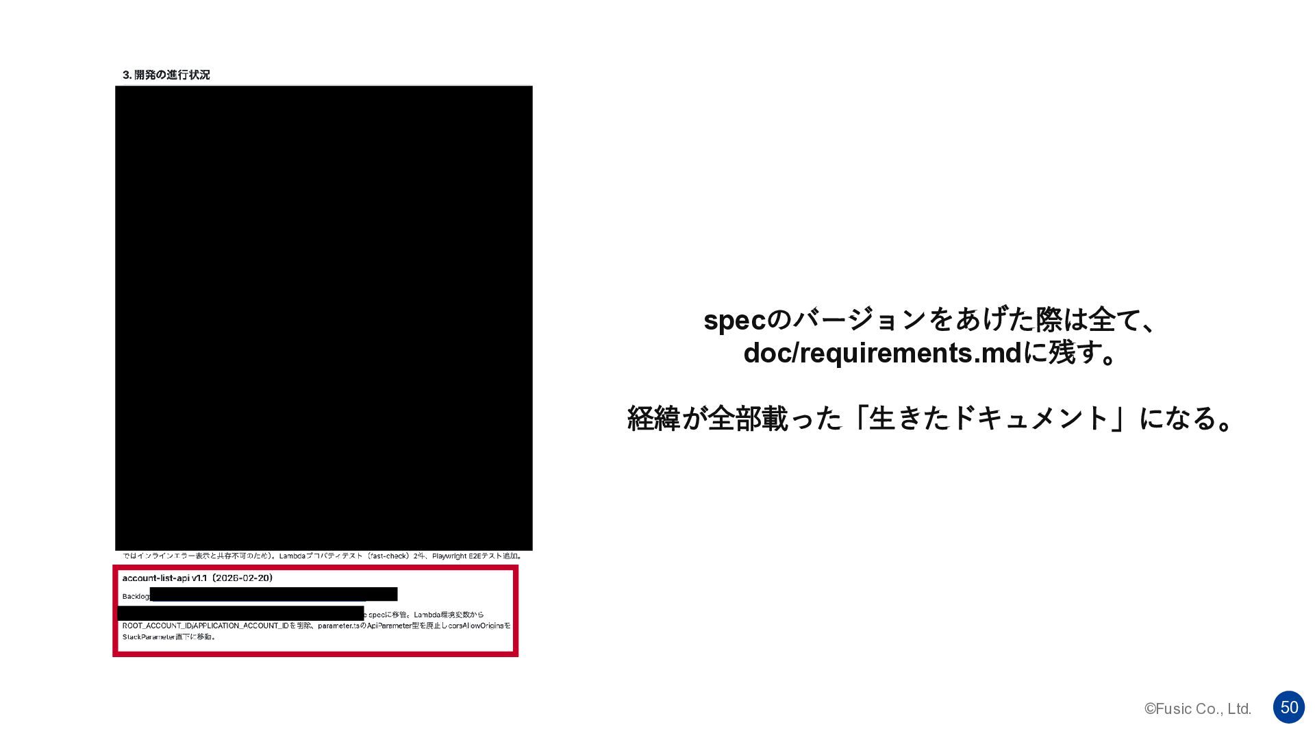 ©Fusic Co., Ltd. 50 specのバージョンをあげた際は全て、 doc/requirements.mdに残す。 経緯が全部載った「生きたドキュメント」になる。