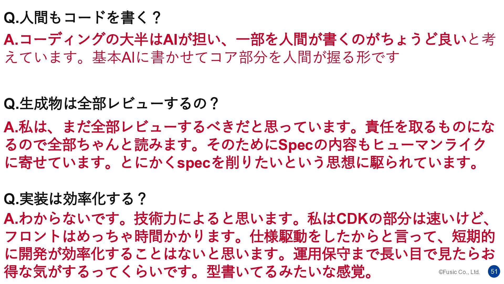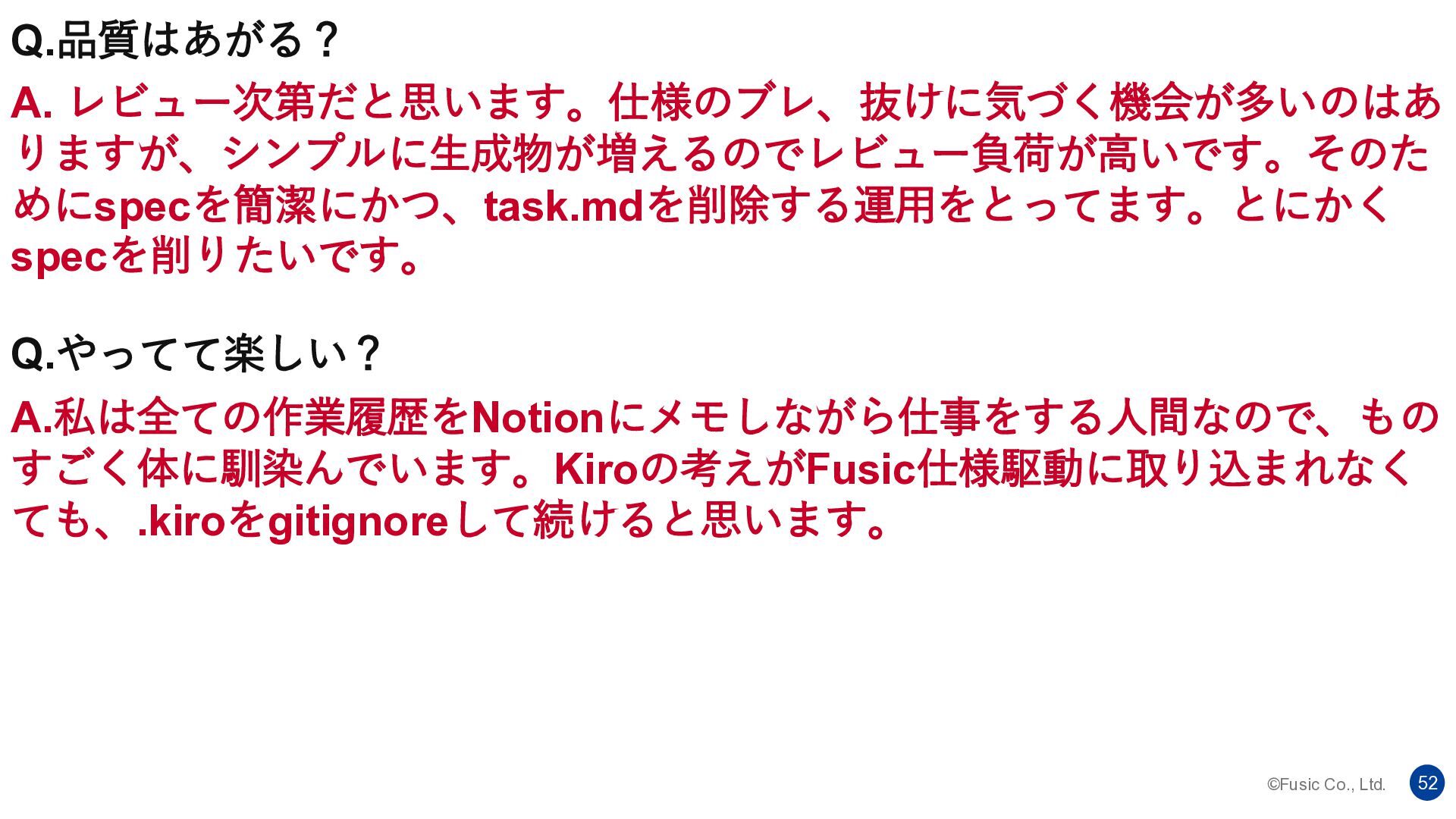 ©Fusic Co., Ltd. 51 Q.人間もコードを書く? A.コーディングの大半はAIが担い、一部を人間が書くのがちょうど良いと考 えています。基本AIに書かせてコア部分を人間が握る形です Q.生成物は全部レビューするの? A.私は、まだ全部レビューするべきだと思っています。責任を取るものにな るので全部ちゃんと読みます。そのためにSpecの内容もヒューマンライク