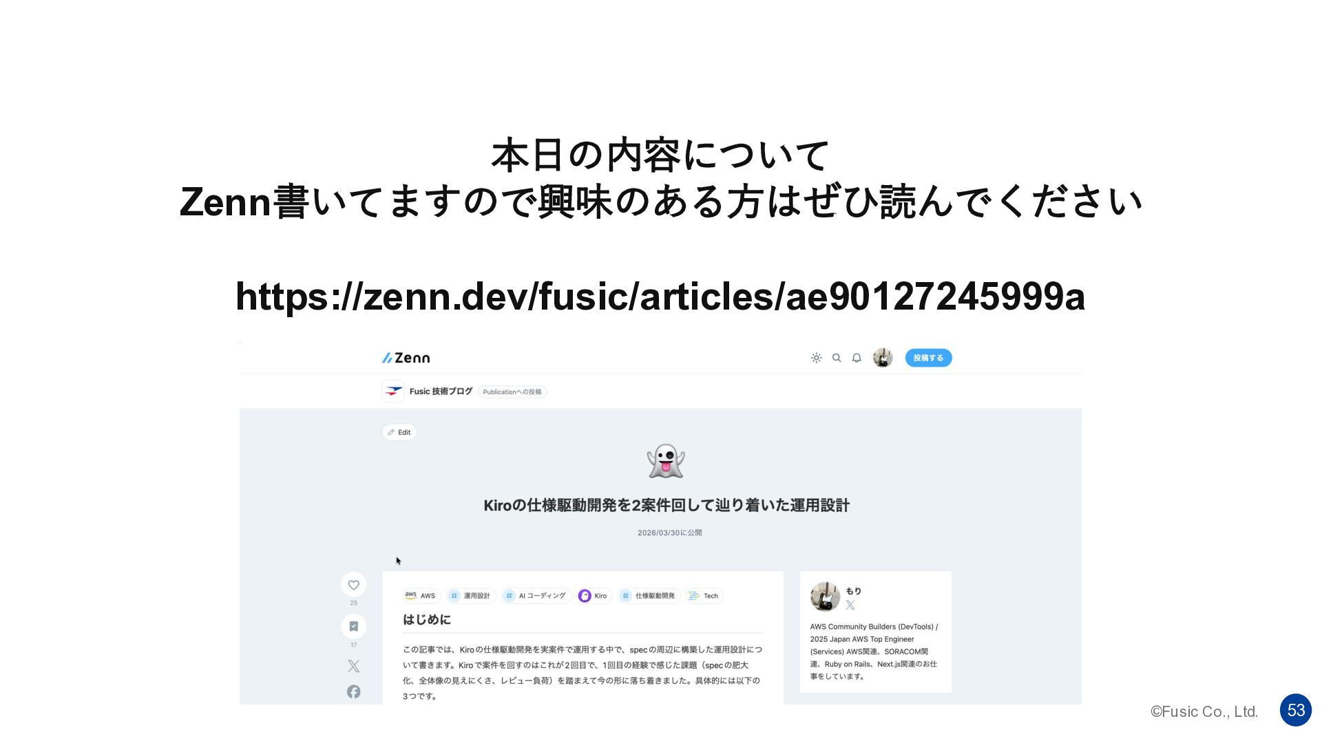 ©Fusic Co., Ltd. 52 Q.品質はあがる? A. レビュー次第だと思います。仕様のブレ、抜けに気づく機会が多いのはあ りますが、シンプルに生成物が増えるのでレビュー負荷が高いです。そのた めにspecを簡潔にかつ、task.mdを削除する運用をとってます。とにかく specを削りたいです。