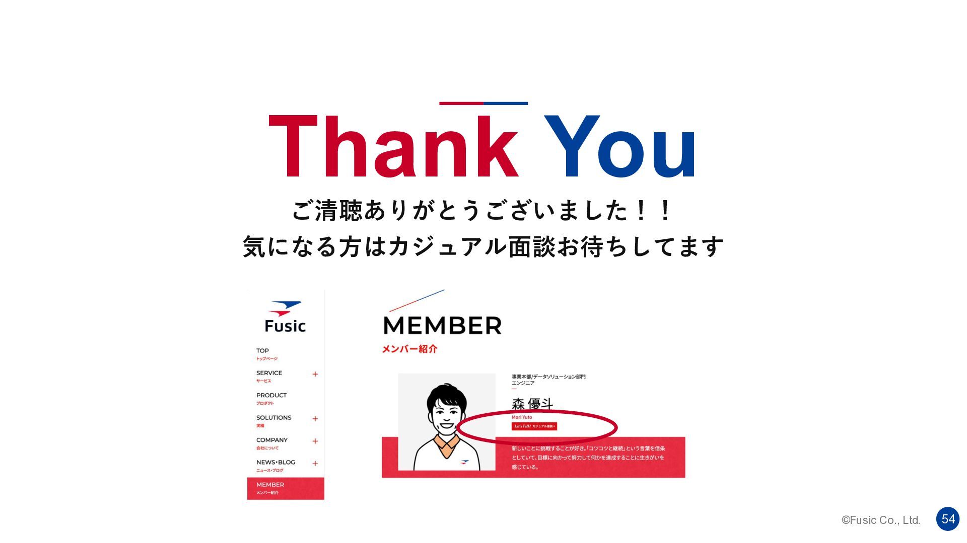 ©Fusic Co., Ltd. 54 Thank You ご清聴ありがとうございました!! 気になる方はカジュアル面談お待ちしてます