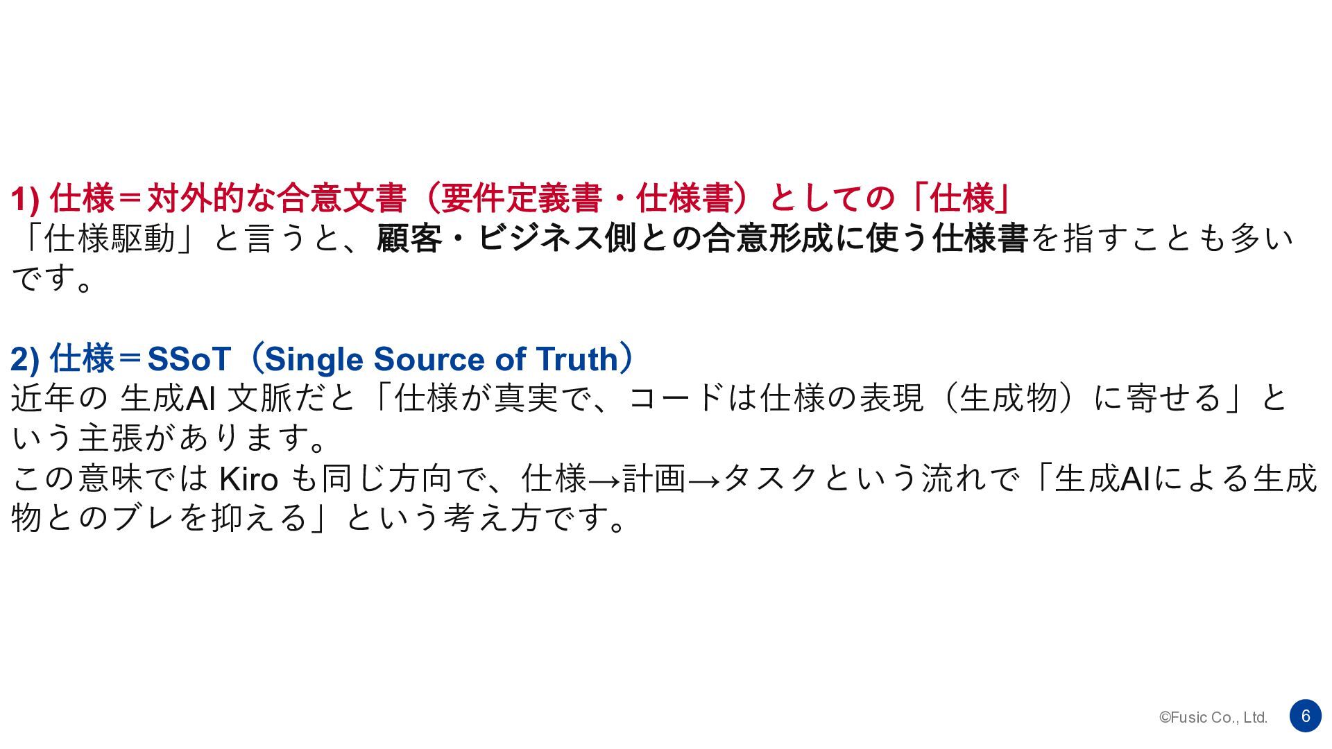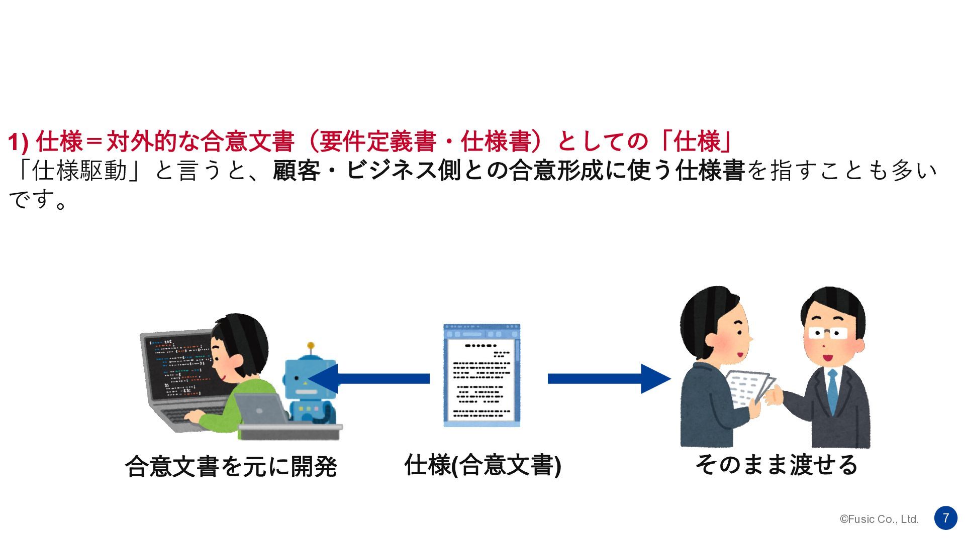 ©Fusic Co., Ltd. 6 1) 仕様=対外的な合意文書(要件定義書・仕様書)としての「仕様」 「仕様駆動」と言うと、顧客・ビジネス側との合意形成に使う仕様書を指すことも多い です。 2) 仕様=SSoT(Single